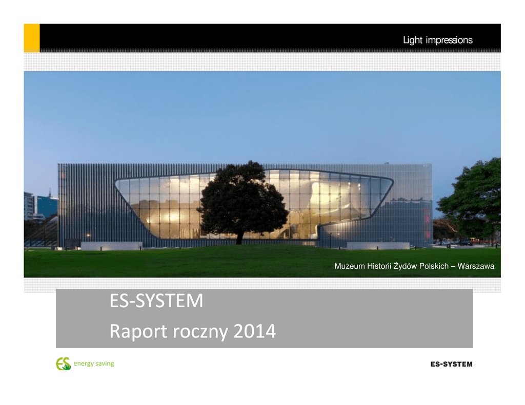 Light impressions 1 Muzeum Historii Żydów Polskich – Warszawa ESES-SYSTEM Raport roczny 2014 energy saving Light impressions 1. Otoczenie rynkowe 2. Wyniki finansowe 2 3. Najważniejsze wydarzenia 2014 roku 4. Perspektywy 2015 roku energy saving TAURON Arena – Kraków Projekt: Perbo Projekt oraz Modern Construction Systems Powierzchnia: 61 434m² Branża oświetleniowa zwiększa natężenie Light impressions 3 Szacowana dynamika produkcji budowlano-montażowej r/r 3,6% (wobec spadku 12% na koniec 2013 r.). Segment niemieszkaniowy budownictwa za cały rok 2014 skurczył się szacunkowo o 1,6%, spadki w obszarze obiektów: hotelowych (-19%), biurowych (-9%), użyteczności publicznej (-7,2%), budownictwa drogowego (-3,2%) budynków handlowo-usługowych (-2,3%), wzrosty w obszarze obiektów: kolejowych (+31,8%), sportowych i rekreacyjnych (+27,7%), przemysłowych i magazynowych (+7,9%). Branża oświetleniowa wzrost na poziomie ok. 5-6% r/r. energy saving ES-SYSTEM GK – wyniki finansowe 2014 roku PRZYCHODY NETTO 4 169 mln zł – wzrost o 1,6% r/r ZYSK NETTO 6,2 mln zł – wzrost o 37% r/r ZYSK EBIT 6,8 mln zł – wzrost o 40% EBITDA ŚRODKI PIENIĘŻNE energy saving Light impressions 15,4 mln zł – wzrost o 19,2% r/r stan na koniec okresu: 22,4 mln zł – wzrost o 4% r/r Light impressions Stabilne przychody, sprzedaż zgodnie z oczekiwaniami 10,5% 55 000 + 11,7% 50 000 45 000 0,8% 40 000 5 + 9,9% 35 000 30 000 53 661 25 000 46 919 20 000 15 000 36 571 34 165 40 181 48 019 42 022 33 897 10 000 5 000 0 I Q 13/14 II Q 13/14 III Q 13/14 IV Q 13/14 Przychody: w IV kw. 48 mln tj. spadek o 10,5% r/r, w 2014 r: 169 mln zł tj. wzrost o 1,6% r/r. Zysk brutto na sprzedaży wyniósł: w IV kw. 16,4 mln tj. spadek o 10,6% r/r, w 2014 r. 62,6 mln zł tj. wzrost 5,4% r/r. Marża wyrażona w % na sprzedaży ogółem w 2014 r. była wyższa niż w 2013 r., tj. 37,04% - wzrost o 1,4 p.p. r/r. energy saving Sprzedaż w kraju rośnie zgodnie z planem, LEDy w ofensywie 6 Light impressions W IV kw. 2014 roku Grupa zrealizowała sprzedaż w kraju na poziomie 37 mln zł, spadek o 7,8% r./r. – efekt sezonowości sprzedaży i przesunięcia części realizacji na I kw. 2015 r. Narastająco sprzedaż krajowa 138 mln zł, tj. 6% wzrostu r./r. Sprzedaż krajowa ES-SYSTEM S.A. w segmentach, w 2014 r.: w segmencie ośw. architektonicznego wzrost o 10,2% r./r., w ośw. zewnętrznym wzrost o 14,9%, w ośw. przemysłowym spadek o 17,6%, sprzedaż do kanału hurtowego wyniosła 59,7 mln, co stanowi 36% całkowitej sprzedaży. Sprzedaż sprzętu w technologii LED stanowi 27,4% całej sprzedaży w porównaniu z 14,9% w 2013 r. energy saving ICE Centrum Kongresowe Kraków Light impressions Sprzedaż eksportowa pod presją sytuacji politycznej Szwecja 19,3% Pozostali 25,8% 2013 2014 13,9 7 11,4 Holandia 3,0% 8,4 6,8 6,2 6,0 1Q Cypr 3,1% Łotwa 3,2% Francja 3,5% Dania 3,7% 7,5 7,2 2Q 3Q Niemcy 16,4% 4Q Czechy 7,8% Rosja 6,9% Austria 7,3% W IV kw. Grupa zanotowała sprzedaż eksportową na poziomie 11,4 mln zł, tj. 18% spadku r./r. Spadek dla całego 2014 r. 14% r./r. - pochodna braku możliwości realizacji zadań sprzedażowych w regionie wschodnim. Wzrost z 15,9% w 2013 r. do 31,5% w 2014 r. udziału opraw LED w sprzedaży eksportowej ES-SYSTEM S.A. energy saving Light impressions Skokowy wzrost zysków i marży EBIT 4 500 + 90,6% 4 000 3 500 + 36,9% 3 000 2 500 8 4 593 2 000 97,4% 1 500 2 410 1 768 1 000 2 421 1 107 500 29 0 -429 -233 -500 -1 000 I Q 13/14 II Q 13/14 III Q 13/14 IV Q 13/14 W 2014 r. zysk operacyjny wyniósł 6,8 mln zł, tj. 40% wzrostu r./r. Rentowność EBIT: 4% versus 2,9% w 2013 r., pochodna wzrostu efektywności i realizacji projektów opartych o wiedzę. Obszary wzrostu kosztów w 2014 r.: wynagrodzeń i świadczeń pracowniczych (o 2 mln zł), usług obcych (o 3 mln zł), amortyzacji (o 0,5 mln zł). Działalność finansowa w 2014 roku przyniosła nieznacznie wyższy wynik niż 2013 r. – o 0,08 mln zł. energy saving Light impressions Zysk netto + 116,8 % 2 500 4 526 2 000 9 88,6% 1 500 1 000 2 088 1 259 1 451 500 144 0 -212 -126 -37 -500 -1 000 I Q13/14 II Q13/14 III Q13/14 IV Q13/14 2014 rok Grupa zakończyła zyskiem netto 6,2 mln zł (wzrost o 37% r./r.) przy rentowności netto na poziomie 3,6% v. 2,7% r./r. Efektywna stopa podatku dochodowego w 2014 roku wzrosła do 13%. Przed rokiem było to 11%. energy saving Najważniejsze wydarzenia 2014 roku 10 Light impressions 31.03.2014 – zakończenie procesu połączenia spółek ES-SYSTEM Rzeszów z ES-SYSTEM Wilkasy – optymalizacja procesów produkcyjnych 04.04.2014 – zakończenie targów Light&Building, efekty sprzedażowe widoczne w portfelu 21.05.2014 – uprawomocnienie wyroku sądu w Bolonii i zakończenie procesu z Beghelli toczącego się od 2006 r. – rozstrzygnięcie korzystne dla ES-SYSTEM S.A. 07.07.2014 – uzyskanie przez laboratorium ES-SYSTEM statusu jednostki nadzorowanej SMT energy saving Galeria Warmińska – Olsztyn Projekt: Kuryłowicz & Associates Oprawy: 2000szt. (sprzedaż 2mln) Dedykowane oprawy, głównie LED Powierzchnia: 117 000m2 Perspektywy na 2015 rok Light impressions Stopniowe zastępowanie istniejących rozwiązań świetlówkowych i wyładowczych technologią LED, którym towarzyszy ciągła poprawa parametrów technicznych. Na rynku krajowym, w oparciu o wyniki IV kw. 2014 r. oraz koniunkturę w branży Zarząd ma nadzieję na utrzymanie sprzedaży w I kw. 2015 r., na poziomie I kw. 2014 r. Na rynku eksportowym, z uwagi na sytuację polityczną możliwe spowolnienie w I kw. 2015 r. w stosunku do IV kw. 2014 r. Kierunki rozwoju eksportu: wykorzystanie polityki zmierzającej do oszczędności energii w krajach wysoko rozwiniętych (kraje Europy Zachodniej i Skandynawia), wykorzystanie szans w krajach gdzie występuje konieczność rozbudowy lub sanacji istniejących systemów oświetleniowych (kraje Europy Południowej), wykorzystanie relacji zbudowanych w latach ubiegłych w basenie Zatoki Per