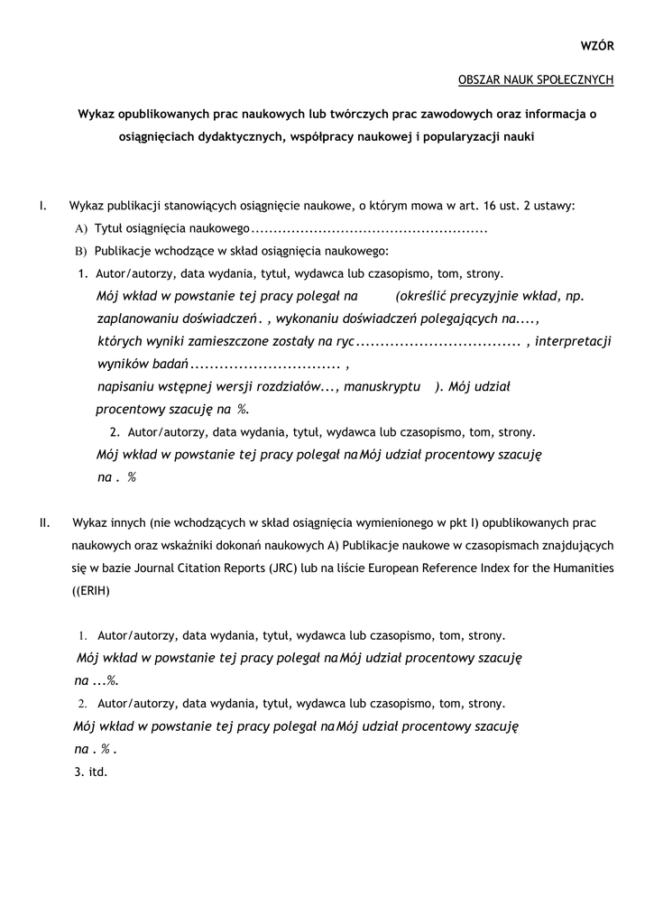 WZÓR OBSZAR NAUK SPOŁECZNYCH Wykaz opublikowanych prac naukowych lub twórczych prac zawodowych oraz informacja o osiągnięciach dydaktycznych, współpracy naukowej i popularyzacji nauki I. Wykaz publikacji stanowiących osiągnięcie naukowe, o którym mowa w art. 16 ust. 2 ustawy: A) Tytuł osiągnięcia naukowego ..................................................... B) Publikacje wchodzące w skład osiągnięcia naukowego: 1. Autor/autorzy, data wydania, tytuł, wydawca lub czasopismo, tom, strony. Mój wkład w powstanie tej pracy polegał na (określić precyzyjnie wkład, np. zaplanowaniu doświadczeń . , wykonaniu doświadczeń polegających na...., których wyniki zamieszczone zostały na ryc .................................. , interpretacji wyników badań ............................... , napisaniu wstępnej wersji rozdziałów..., manuskryptu ). Mój udział procentowy szacuję na %. 2. Autor/autorzy, data wydania, tytuł, wydawca lub czasopismo, tom, strony. Mój wkład w powstanie tej pracy polegał na Mój udział procentowy szacuję na . % II. Wykaz innych (nie wchodzących w skład osiągnięcia wymienionego w pkt I) opublikowanych prac naukowych oraz wskaźniki dokonań naukowych A) Publikacje naukowe w czasopismach znajdujących się w bazie Journal Citation Reports (JRC) lub na liście European Reference Index for the Humanities ((ERIH) 1. Autor/autorzy, data wydania, tytuł, wydawca lub czasopismo, tom, strony. Mój wkład w powstanie tej pracy polegał na Mój udział procentowy szacuję na ...%. 2. Autor/autorzy, data wydania, tytuł, wydawca lub czasopismo, tom, strony. Mój wkład w powstanie tej pracy polegał na Mój udział procentowy szacuję na . % . 3. itd. B) Monografie, publikacje naukowe w czasopismach międzynarodowych lub krajowych innych niż znajdujące się w bazach lub na liście, o których mowa w pkt II A: 1. Autor/autorzy, data wydania, tytuł, wydawca lub czasopismo, tom, strony. Mój wkład w powstanie tej pracy polegał na Mój udział procentowy szacuję na . % 2. Autor/autorzy, data wydania, tytuł, wydawca lub czasopismo, tom, strony. Mój wkład w powstanie tej pracy polegał na Mój udział procentowy szacuję na . % 3. itd. C) Opracowania zbiorowe, katalogi zbiorów, dokumentacja prac badawczych, ekspertyz, utworów i dzieł artystycznych: 1. Autor/autorzy, rok, tytuł opracowania lub dzieła, rodzaj opracowania lub dzieła, miejsce opracowania, wydania lub upublicznienia Mój wkład w powstanie tej pracy polegał na Mój udział procentowy szacuję na . % 2. Autor/autorzy, rok, tytuł opracowania lub dzieła, rodzaj opracowania lub dzieła, miejsce opracowania, wydania lub upublicznienia Mój wkład w powstanie tej pracy polegał na Mój udział procentowy szacuję na . % 3. itd. D) Sumaryczny impact factor według listy Journal Cication Reports (JCR), zgodnie z rokiem opublikowania: ........... E) Liczba cytowań publikacji według bazy Web of Science (WoS): .................... F) Indeks Hirsha według bazy Web of Science (WoS): ................. G) Kierowanie międzynarodowymi i krajowymi projektami badawczymi oraz udział w takich projektach: 1. Tytuł projektu, rok rozpoczęcia i (ewentualnie) zakończenia realizacji, nazwa organu przyznającego fundusze na realizację projektu, charakter udziału habilitanta w projekcie (np. kierownik, wykonawca, inne . ). 2. Tytuł projektu, rok rozpoczęcia i (ewentualnie) zakończenia realizacji, nazwa organu przyznającego fundusze na realizację projektu, charakter udziału habilitanta w projekcie (np. kierownik, wykonawca, inne . ). 3. Itd. H) Międzynarodowe i krajowe nagrody za działalność naukową albo artystyczną 1. Nazwa nagrody, rok przyznania, nazwa organu przyznającego nagrodę, określenie tytułu z jakiego została przyznana nagroda. 2. Nazwa nagrody, rok przyznania, nazwa organu przyznającego nagrodę, określenie tytułu z jakiego została przyznana nagroda. 3. Itd. I) Wygłoszenie referatów na międzynarodowych i krajowych konferencjach tematycznych 1. Autor/autorzy referatu, rok wygłoszenia, tytuł referatu, nazwa konferencji, miejsce odbywania konferencji. 2. Autor/autorzy referatu, rok wygłoszenia, tytuł referatu, nazwa konferencji, miejsce odbywania konferencji. 3. Itd. III. Dorobek dydaktyczny i popularyzatorski oraz informacja o współpracy międzynarodowej habilitanta A) Uczestnictwo w programach europejskich oraz innych programach międzynarodowych i krajowych 1. Nazwa programu i organu finansującego jego realizację, okres trwania projektu, tytuł projektu, charakter uczestnictwa habilitanta. 2. Nazwa programu i organu finansuj ącego j ego realizację, okres trwania projektu, tytuł projektu, charakter uczestnictwa habilitanta. 3. Itd. B) Aktywny udział w międzynarodowych i krajowych konferencjach naukowych 1. Autor/autorzy komunikatu prezentowanego na konferencji, rok, tytuł referatu, nazwa konferencji, miejsce odbycia konferencji. 2. Autor/autorzy komunikatu prezentowanego na konferencji, rok, tytuł referatu, nazwa konferencji, miejsce odbycia konferencji. 3. Itd. C) Udział w komitetach organizacyjnych międzynarodowych i krajowych konferencji naukowych 1. Nazwa konferencji, rok, miejsce odbycia konferencji, rola habilitanta (np. przewodniczący komitetu organizacyjnego, sekretarz komitetu organizacyjnego, organizator sesji tematycznej, itp.) 2. Nazwa konferencji, rok, miejsce odbycia konferencji, rola habilitanta (np. przewodniczący komitetu organizacyjnego, sekretarz komitetu organizacyjnego, organizator sesji tematycznej, itp.) D) Otrzymane nagrody i wyróżnienia inne niż wymienione w pkt II H 1. Nazwa nagrody, rok przyznania, nazwa organu przyznającego nagrodę, określenie tytułu z jakiego została przyznana nagroda. 2. Nazwa nagrody, rok przyznania, nazwa organu przyznającego nagrodę, określenie tytułu z jakiego została przyznana nagroda. 3. Itd. E) Udział w konsorcjach i sieciach badawczych 1. Nazwa konsorcjum lub sieci, nazw