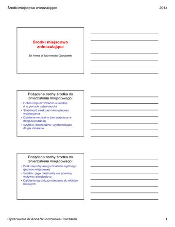 Środki miejscowo znieczulające 2014 Środki miejscowo znieczulające Dr Anna Wiktorowska-Owczarek Pożądane cechy środka do znieczulenia miejscowego: • Dobra rozpuszczalność w wodzie (i w płynach ustrojowych) • Stabilność struktury mimo procesu wyjaławiania • Działanie neutralne (nie drażniące w miejscu podania) • Szybkie, odwracalne i wystarczająco długie działanie Pożądane cechy środka do znieczulenia miejscowego: • Brak niepożądanego działania ogólnego (jedynie miejscowe) • Środek i jego metabolity nie powinny wpływać alergizująco • Działanie ograniczone jedynie do włókien bólowych Opracowała dr Anna Wiktorowska-Owczarek 1 Środki miejscowo znieczulające 2014 Rodzaje znieczuleń • • • • Powierzchniowe Nasiękowe Przewodowe Śródwięzadłowe • Zewnątrzoponowe • Podpajęczynówkowe Rodzaje znieczuleń Znieczulenie powierzchniowe • Znieczulenie powierzchniowe – porażenie wychodzących z zakończeń czuciowch włókien nerwowych. • Tetrakaina 2% • Lidokaina 2-10% • Kokaina 1-4% • Benzokaina 5-10% • Emla: prylokaina 2,5% i lidokaina 2,5% Rodzaje znieczuleń znieczulenie nasiekowe • Znieczulenie nasiękowe dotarcie środka do włókien nerwów czuciowych zaopatrujących znieczulaną okolicę. • Lidokaina 0,25 – 1% • Prokaina 0,5-1% • Bupiwakaina 0,125-0,25% Opracowała dr Anna Wiktorowska-Owczarek 2 Środki miejscowo znieczulające 2014 Rodzaje znieczuleń znieczulenie przewodowe • Znieczulenie przewodowe – podanie środka w okolicę pnia nerwowego lub splotu nerwowego. • Początek znieczulenia czuciowego po podaniu w okolicę nerwu zależy od czterech czynników: – – – – Odległośc od miejsca podania do nerwu Stężenie Objętość leku Stopień jonizacji leku Rodzaje znieczuleń znieczulenie przewodowe • Lidokaina stosowana w stężeniach 0,5 -1,5% • Mepiwakaina 1-2% • Bupiwakaina 0,25-0,375% • Mogą być stosowane środki kurczące naczynia Pozostałe rodzaje znieczuleń • Znieczulenie rdzeniowe podpajęczynówkowe (lędźwiowe – między trzeci a czwarty wyrostek kolczysty kręgów lędźwiowych) (podoponowo) podanie środka miejscowo znieczulającego do płynu mózgowo - rdzeniowego w przestrzeni lędźwiowej, co powoduje zahamowanie przewodzenia impulsów przez włókna nerwowe czuciowe i ruchowe rdzenia kręgowego tej okolicy. Najczęściej stosuje się 5% roztwór lidokainy. Ten rodzaj znieczulenia stosowany w operacjach poniżej pępka: urologiczne, ginekologiczne, także cesarskie cięcie. Opracowała dr Anna Wiktorowska-Owczarek 3 Środki miejscowo znieczulające 2014 Pozostałe rodzaje znieczuleń • Zewnątrzoponowe (nadoponowo)– wprowadzenie środka znieczulającego miejscowo do przestrzeni zewnątrzoponowej rdzenia kręgowego. • Wprowadzenie dużej objętości środka, który dyfunduje przez oponę do CSF • Zazwyczaj stosowana jest 1-2% lidokaina • Bupiwakaina 0,5-0,75% Mechanizm działania • Blokująna błonowe, napięciozależne kanały sodowe Zależność między budową a działaniem • LA działają w postaci kationów, ale muszą dotrzeć do miejsca swego działania, przenikając osłonkę neuronów i błonę aksonów w postaci niezjonizowanej, dlatego powinny one być słabymi zasadami. Opracowała dr Anna Wiktorowska-Owczarek 4 Środki miejscowo znieczulające 2014 Zależność między budową a działaniem Zależność między budową a działaniem • LA są cząsteczkami zawierającymi hydrofobową grupę aromatyczną i zasadową grupę aminową. • Związki rozpuszczalne w tłuszczach łatwiej penetrują przez błonę komórkową i łatwiej wywierają efekt. • B: 0,1- 0,5% • L: 1 -2% Właściwości LA • Stała dysocjacji • Rozpuszczalność w tłuszczach • Wiązanie z białkami Opracowała dr Anna Wiktorowska-Owczarek 5 Środki miejscowo znieczulające 2014 Stała dysocjacji wpływa na początek działania LA pKa Początek działania Prokaina 9.1 Slow Lidokaina 7.9 Rapid Bupiwakaina 8.1 Slow Prilokaina 7.9 Medium Artikaina 7.8 Rapid • Podział LA w zależności od czasu działania: – Krótko działające (20-45 min.): prokaina – Średnim czasie działania (60-120 min.): lidokaina, mepiwakaina – O długim czasie działania (400-450 min.): bupiwakaina, ropiwakaina, tetrakaina Zależność między budową a działaniem • Czas działania leku zależy głównie od wiązania leku z białkami. • Działania niepożądane zależą również od rozpuszczalności w tłuszczach Opracowała dr Anna Wiktorowska-Owczarek 6 Środki miejscowo znieczulające 2014 Środki miejscowo znieczulające • LA hamują zatem przewodzenie w następującej kolejności –Aksony bez osłonki mielinowej • Małe aksony zmielinizowane –Duże aksony zmielinizowane Środki miejscowo znieczulające • Siła działania środków miejscowo znieczulających maleje wraz ze wzrostem średnicy włókien nerwowych, zablokowane zostają przede wszystkim cienkie włókna C i Aδ „przewodzące ból” oraz włókna przedzwojowe typu B. Większe dawki powodują początkowo obniżenie przewodzenia czucia dotyku i ucisku (Aβ), w końcu wpływają także na czynności motoryczne. Środki miejscowo znieczulające • Środki miejscowo znieczulające w zwykłych dawkach nie zaburzają czynności motorycznych, gdyż włókna motoryczne mają większą średnicę niż włókna czuciowe ważne dla „przewodzenia bólu” Opracowała dr Anna Wiktorowska-Owczarek 7 Środki miejscowo znieczulające 2014 Środki miejscowo znieczulające • W pierwszej kolejności blokowane jest przewodzenie we włóknach czuciowych i współczulnych pKa Początek działania Rozp w tłusz. Tox. Siła działania Wiązanie Czas z działania białkami Prok 8,9 Wolno 1 b. niska Śred 6 Krótki Tetrak 8,5 Wolno 200 Wysok Wysok 75 Długi Lidok 7,7 Szybko 150 Śred Śred 65 Średni Prilok 7,7 Szybko 50 Niska Śred 55 Średni Ropiw 8,1 Wolno 400 Śred Wysok 94 Długi Bupiw 8,1 wolno 1000 Wysok