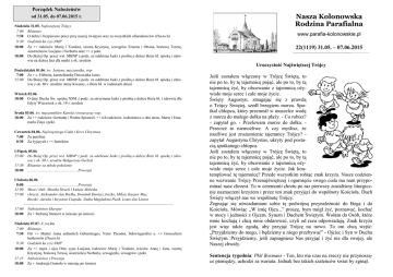 Porządek Nabożeństw od 31.05. do 07.06.2015 r. Niedziela 31.05. Najświętszej Trójcy 7:00 Różaniec 7:30 O dobre i bezpieczne prace przy naszej świątyni oraz za wszystkich ofiarodawców (Deutsch) 9:30 Godzinki ku czci NMP 10:00 Za ++ rodziców Marię i Teodora, siostrę Krystynę, szwagrów Ernesta i Ottona, bratową Teresę, siostrzeńców Lucjana i Norberta oraz ++ z pokr. 18:00 Do Bożej Op. przez wst. MBNP z podz. za odebrane łaski z prośbą o dalsze Boże bł. opiekę i zdrowie na dalsze lata dla matki z ok. urodzin Poniedziałek 01.06. św. Justyna, męczennika, wsp. 7:00 Za + s. Elżbietę, karmelitankę Dzieciątka Jezus 15:00 Do Bożej Op. przez wst. MBNP z podz. za odebrane łaski z prośbą o dalsze Boże bł. opiekę i zdrowie z ok. 80 r. urodzin Anny Kwaśny, o Boże bł. w rodzinach dzieci Wtorek 02.06. 18:00 O dary Ducha Św. opiekę NSM z podz. za otrzymane łaski z prośbą o dalsze Boże bł. i zdrowie dla Edyty Wieczorek z ok. 18 r. urodzin Środa 03.06. św. męczenników Karola i towarzyszy wsp. 18:00 Za ++ rodziców Gertrudę i Waltra Sprancel, ++ ich rodziców, rodzeństwo z obu stron, Martę i Emanuela Ziaja i pokr. Czwartek 04.06. Najświętszego Ciała i Krwi Chrystusa 7:00 Za parafian 8:30 Za żyjących i ++ hutników I Piątek 05.06. 15:00 Do Bożej Op. przez wst. MBNP z podz. za odebrane łaski z prośbą o dalsze Boże bł. opiekę i zdrowie z ok. 80 r. urodzin Małgorzaty Gerlich 17:30 Różaniec za młode pokolenie 18:00 ………………………………….Procesja I Sobota 06.06. 8:00 ………………………………….Procesja 12:00 Msza i ślub: Monika Strach i Łukasz Maleska 15:00 chrzest: Aleksander Jan Bryłka, Dominik Dariusz Joszko, Miłosz Kacper Muc, Roczki: Aurelia i Krystian Czupała, Nadia Magdalena Puzik, Louis Jan Lisson ————————–—–——–——–————————————–——–————————— 17:00 Nabożeństwo Maryjne 18:00 Za + Stefanię Steinert w miesiac po śmierci Niedziela 07.07. X zwykła 7:00 Różaniec 7:30 Für ++ Mutter Anna anlässlich Geburtstages, Vater Theodor, Schwiegerelter u. ++ Grosseltern beiderseits (Deutsch) 9:30 Godzinki ku czci NMP 10:00 Za ++ męża i ojca Otto, syna Lucjana, rodziców Marię i Teodora, teściów Annę i Jana, siostrę Krystynę, bratową Teresę, siostrzeńca Norberta, szwagierki, szwagrów i pokr. 17:15 Nabożeństwo i Procesja 18:00 Za + Andrzeja Gomoła w miesiąc po śmierci Nasza Kolonowska Rodzina Parafialna www.parafia-kolonowskie.pl 22(1119) 31.05. – 07.06.2015 Uroczystość Najświętszej Trójcy Jeśli zostałem włączony w Trójcę Świętą, to nie po to, by tę tajemnicę pojąć, ale po to, by tą tajemnicą żyć, by obcowanie z tajemnicą ożywiało moje serce i całe moje życie. Święty Augustyn, zmagając się z prawdą o Trójcy Świętej, szedł brzegiem morza. Spotkał chłopca, który przenosił w muszelce wodę z morza do małego dołka na plaży. - Co robisz? - zapytał go. - Przelewam morze do dołka. Przecież to niemożliwe. A czy myślisz, że możliwe jest zrozumienie tajemnicy Trójcy? zapytał Augustyna Chrystus, ukryty pod postacią spotkanego chłopca. Jeśli zostałem włączony w Trójcę Świętą, to nie po to, by tę tajemnicę pojąć, ale po to, by tą tajemnicą żyć, by obcowanie z tajemnicą ożywiało moje serce i całe moje życie. Jak kontemplować tę tajemnicę? Przede wszystkim robiąc znak krzyża. Nasze codzienne wezwanie Trójcy Przenajświętszej i ogarnięcie swego ciała ma nam przypominać nasz chrzest. To w ceremonii chrztu po raz pierwszy zostaliśmy liturgicznie naznaczeni krzyżem i przez ten znak przyjęci do wspólnoty Kościoła. Duch Święty włączył nas we wspólnotę Trójcy. Żegnając się uświadamiam sobie tę podwójną przynależność do Boga i do Kościoła. Mówiąc „W imię Ojca...” proszę, bym mógł żyć, poznawać, kochać w mocy i jedności z Ojcem, Synem i Duchem Świętym. Wołam do Osób, które mnie kochają i chcą mnie obdarować, czyli od razu odpowiadają. Znak krzyża jest więc także zgodą, aby przyjąć Trójcę na nowo. To oni chcą wejść: „Przyjdziemy do mego, i będziemy u niego przebywać” - Ojciec i Syn w Duchu Świętym. Przyjdziemy, jeśli zapragniesz Nas przyjąć i żyć nie dla swojej, ale Naszej chwały. Sentencja tygodnia: Phil Bosmans - Ten, kto ma czas na rzeczy nie przynoszące pieniędzy, uchodzi za wariata. Jednak bez takich szaleńców świat by zginął. 22/2015 W czerwcu następujące Róże Różańcowe przewodniczą modlitwie różańcowej: 07.06. Róża 1 p. Teresa Obst 14.06. Róża 2 p. Anna Bock 21.06. Róża 3 p. Katarzyna Budnik 28.06. Róża 4 p. Hildegarda Czupała ———–————————————–—–————–—–———————– PAPIESKA INTENCJA OGÓLNA Aby migranci i uchodźcy spotykali się z dobrym przyjęciem i byli traktowani z szacunkiem w krajach, do których przybywają. PAPIESKA INTENCJA MISYJNA Aby wielu młodych ludzi odpowiedziało na głos Jezusa „Pójdź za mną” i zdecydowało się żyć w kapłaństwie lub życiu zakonnym. ———–————————————–—–————–—–———————– Terminy nauk przedmałżeńskich: 13,14,20,21 czerwca; 12,13,19,20 września; 6, 7, 12,13 grudnia. Nauki rozpoczynają się przy parafii NSPJ w Zawadzkiem o godz. 15:00. ———–————————————–—–————–—–———————– Uroczystość odpustowa w naszej parafii ku czci NSM będzie 14 czerwca. ———–————————————–—–————–—–———————– Zapowiedzi przedślubne: 2. Dawid Dyla zam. Staniszcze Wielkie i Paulina Makusek zam. Kolonowskie; 2. Mariusz Firuta zam. Strzelce Opolskie i Aleksandra Morawiec zam. Kolonowskie; 2. Paweł Mandla zam. Borycz i Dominika Żyłka zam. Kolonowskie. ———–——