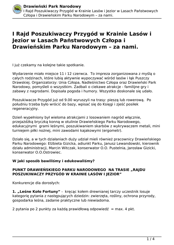 Drawieński Park Narodowy I Rajd Poszukiwaczy Przygód w Krainie Lasów i Jezior w Lasach Państwowych Człopa i Drawieńskim Parku Narodowym – za nami. I Rajd Poszukiwaczy Przygód w Krainie Lasów i Jezior w Lasach Państwowych Człopa i Drawieńskim Parku Narodowym – za nami. I już czekamy na kolejne takie spotkanie. Wydarzenie miało miejsce 11 i 12 czerwca. To impreza zorganizowana z myślą o całych rodzinach, które lubią aktywnie wypoczywać wśród lasów i łąk Puszczy Drawskiej. Organizatorzy: Unia Człopa, Nadleśnictwo Człopa oraz Drawieński Park Narodowy, pomyśleli o wszystkim. Zadbali o ciekawe atrakcje - familijne gry i zabawy z nagrodami. Dopisała pogoda i humory. Wszystko doskonale się udało. Poszukiwacze Przygód już od 9.00 wyruszyli na trasy: pieszą lub rowerową. Po południu trzeba było wrócić do bazy, wpisać się do Księgi i zjeść posiłek regeneracyjny. Dzień wypełniony był wieloma atrakcjami z losowaniem nagród włącznie, przejażdżką bryczką konną w otulinie Drawieńskiego Parku Narodowego, edukacyjnymi grami leśnymi, poszukiwaniem skarbów z wykrywaczem metali, mini turniejem piłki nożnej, mini zawodami kajakowymi (ergometr). Działo się, a w tych działaniach duży udział mieli również pracownicy Drawieńskiego Parku Narodowego: Elżbieta Gizicka, adiunkt Parku, Janusz Lewandowski, kierownik działu administracji, Marcin Witczak, konserwator O.O. Pustelnia, Jarosław Gizicki, konserwator O.O.Ostrowiec. W jaki sposób bawiliśmy i edukowaliśmy? PUNKT DRAWIEŃSKIEGO PARKU NARODOWEGO NA TRASIE „RAJDU POSZUKIWACZY PRZYGÓD W KRAINIE LASÓW I JEZIOR” Konkurencje dla dorosłych: 1. „Leśne Koło Fortuny” - kręcąc kołem drewnianej tarczy uczestnik losuje kategorię pytania z następujących dziedzin: zwierzęta, rośliny, ochrona przyrody, gospodarka leśna, zadanie praktyczne lub niewiadoma. 2 pytania po 2 punkty za każdą prawidłową odpowiedź = max. 4 pkt. 1/4 Drawieński Park Narodowy I Rajd Poszukiwaczy Przygód w Krainie Lasów i Jezior w Lasach Państwowych Człopa i Drawieńskim Parku Narodowym – za nami. 2. „Ile trwa rozkład odpadów?” - losowanie drewnianej tabliczki z określonym rodzajem odpadów, zadaniem uczestnika zabawy jest określenie czasu potrzebnego do całkowitego rozkładu danego odpadu. 1 pytanie za 2 punkty za prawidłową odpowiedź = max. 2 punkty 3. „Czyj to trop?” – uczestnik zabawy losuje wykonaną w skali 1:1 formę tropu, odciska ją w piasku, a następnie odgaduje jakiego zwierzęcia jest to trop. 2 tropy po 2 punkty za każdą prawidłową odpowiedź = max. 4 pkt. Konkurencje dla dzieci: 1. „Leśne Koło Fortuny” - kręcąc kołem drewnianej tarczy uczestnik losuje kategorię pytania z następujących dziedzin: zwierzęta, rośliny, ochrona przyrody, gospodarka leśna, zadanie praktyczne lub niewiadoma. 2 pytania po 2 punkty za każdą prawidłową odpowiedź = max. 4 pkt. 2. „Jaki to ssak, ptak lub grzyb?” - losowanie drewnianej tabliczki przedstawiającej zwierzę (ssaka), ptaka lub grzyb, zadaniem uczestnika zabawy jest odgadnięcie co przedstawia obrazek. 1 pytanie za 2punkty za prawidłową odpowiedź = max. 2 punkty 3. „Czyj to trop?” – uczestnik zabawy losuje wykonaną w skali 1:1 formę tropu, odciska ją w piasku, a następnie odgaduje jakiego zwierzęcia jest to trop. 2 tropy po 2 punkty za każdą prawidłową odpowiedź = max. 4 pkt. RAZEM do zdobycia max. 10 punktów STOISKO DPN W ZAŁOMIU: 1. Materiały promocyjne i informacyjne DPN 2/4 Drawieński Park Narodowy I Rajd Poszukiwaczy Przygód w Krainie Lasów i Jezior w Lasach Państwowych Człopa i Drawieńskim Parku Narodowym – za nami. 2. Udzielanie informacji na temat DPN (zasady i formy udostępnienia DPN, aktualne cenniki i regulaminy, itp…) 3. Gry i zabawy z nagrodami: „Skok w dal ze zwierzętami” „Zwierzęta DPN” – kolorowanki dla dzieci Rozwiązywanie krzyżówek o tematyce przyrodniczej. Rozpoznawanie ptaków, zwierząt i grzybów (tabliczki edukacyjne) Określanie czasu rozkładu odpadów (tabliczki edukacyjne) Układanie puzzli o tematyce przyrodniczej „Leśne Koło Fortuny” (pytania o tematyce przyrodniczej) A czym musieli się wykazać uczestnicy rajdu na tzw. punktach kontrolnych? Punkt kontrolny nr 1- Gromadzenie zapasów na zimę Konkurs sprawnościowy polegający na rzucaniu do celu. Zabawy dla dzieci i dorosłych: Opis konkurencji: Konkurencja polega na rzucaniu kasztanami do wydrążonej w pniu dziupli. Za każdy trafiony rzut zawodnik otrzymuje 2 pkt. Maksymalnie można zdobyć 10 pkt. Punkt kontrolny nr 2- A może na ryby? Konkurs sprawnościowy polegający na wyłapywaniu płynących szyszek. Opis konkurencji: Uczestnik konkursu stojąc na mostku nad rzeką wyłapuje szyszki z nurtu płynącej rzeki za pomocą specjalnej wędki. Szyszkę do wody wrzuca w określone miejsce sędzia w momencie zgłoszenia gotowości uczestnika konkursu do „połowu”. Uczestnik do wyłowienia ma 10 szyszek. Poznawanie lasu przez dotyk Konkurs polegający na rozpoznawaniu 3/4 Drawieński Park Narodowy I Rajd Poszukiwaczy Przygód w Krainie Lasów i Jezior w Lasach Państwowych Człopa i Drawieńskim Parku Narodowym – za nami. przedmiotów przez dotyk. Opis konkurencji: Uczestnicy w zależności od kategorii losują 5 przedmiotów, które będą rozpoznawać. Rozpoznawanie będzie polegało na przejście za zasłonę, włożeniu rąk w otwory wycięte w zasłonie i dotykaniu rękami wylosowanego przedmiotu znajdującego się z drugiej strony. To był niezapomniany - rodzinny weekend w lasach Nadleśnictwa Człopa i Drawieńskiego Parku Narodowego. Zapraszamy do nas po przygodę przez cały rok. Data wydruku: 03.03.2017 11:43:46 Adres URL: http://dpn.pl/aktualnosci/286-i-rajd-poszukiwaczy-przygod-w-krainie-lasow-i-jezior-wlasach-pa.html 4/4 Powered by TCPDF (www.tcpdf.org)