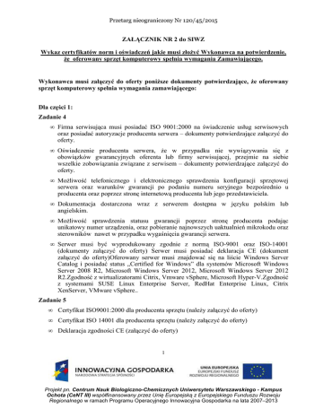 Przetarg nieograniczony Nr 120/45/2015 ZAŁĄCZNIK NR 2 do SIWZ Wykaz certyfikatów norm i oświadczeń jakie musi złożyć Wykonawca na potwierdzenie, że oferowany sprzęt komputerowy spełnia wymagania Zamawiającego. Wykonawca musi załączyć do oferty poniższe dokumenty potwierdzające, że oferowany sprzęt komputerowy spełnia wymagania zamawiającego: Dla części 1: Zadanie 4 • Firma serwisująca musi posiadać ISO 9001:2000 na świadczenie usług serwisowych oraz posiadać autoryzacje producenta serwera – dokumenty potwierdzające załączyć do oferty. • Oświadczenie producenta serwera, że w przypadku nie wywiązywania się z obowiązków gwarancyjnych oferenta lub firmy serwisującej, przejmie na siebie wszelkie zobowiązania związane z serwisem – dokumenty potwierdzające załączyć do oferty. • Możliwość telefonicznego i elektronicznego sprawdzenia konfiguracji sprzętowej serwera oraz warunków gwarancji po podaniu numeru seryjnego bezpośrednio u producenta oraz poprzez stronę internetową producenta lub jego przedstawiciela. • Dokumentacja dostarczona wraz z serwerem dostępna w języku polskim lub angielskim. • Możliwość sprawdzenia statusu gwarancji poprzez stronę producenta podając unikatowy numer urządzenia, oraz pobieranie najnowszych uaktualnień mikrokodu oraz sterowników nawet w przypadku wygaśnięcia gwarancji serwera. • Serwer musi być wyprodukowany zgodnie z normą ISO-9001 oraz ISO-14001 (dokumenty załączyć do oferty) Serwer musi posiadać deklaracja CE (dokument załączyć do oferty)Oferowany serwer musi znajdować się na liście Windows Server Catalog i posiadać status „Certified for Windows” dla systemów Microsoft Windows Server 2008 R2, Microsoft Windows Server 2012, Microsoft Windows Server 2012 R2.Zgodność z wirtualizatorami Citrix, Vmware vSphere, Microsoft Hyper-V.Zgodność z systemami SUSE Linux Enterprise Server, RedHat Enterprise Linux, Citrix XenServer, VMware vSphere.. Zadanie 5 • Certyfikat ISO9001:2000 dla producenta sprzętu (należy załączyć do oferty) • Certyfikat ISO 14001 dla producenta sprzętu (należy załączyć do oferty) • Deklaracja zgodności CE (załączyć do oferty) 1 Projekt pn. Centrum Nauk Biologiczno-Chemicznych Uniwersytetu Warszawskiego - Kampus Ochota (CeNT III) współfinansowany przez Unię Europejską z Europejskiego Funduszu Rozwoju Regionalnego w ramach Programu Operacyjnego Innowacyjna Gospodarka na lata 2007–2013 Przetarg nieograniczony Nr 120/45/2015 • Potwierdzenie spełnienia kryteriów środowiskowych, w tym zgodności z dyrektywą RoHS Unii Europejskiej o eliminacji substancji niebezpiecznych w postaci oświadczenia producenta jednostki • Potwierdzenie kompatybilności komputera na stronie Windows Logo'd Products List na daną platformę systemową (wydruk ze strony) • Certyfikat EnergyStar 6.0 – załączyć oświadczenie wykonawcy poparte oświadczeniem producenta • Głośność jednostki centralnej mierzona zgodnie z normą ISO 7779 oraz wykazana zgodnie z normą ISO 9296 w pozycji obserwatora w trybie pracy dysku twardego (IDLE) wynosząca maksymalnie 24dB (załączyć oświadczenie producenta oferowanego komputera) • Firma serwisująca musi posiadać ISO 9001:2000 na świadczenie usług serwisowych oraz posiadać autoryzacje producenta komputera – dokumenty potwierdzające załączyć do oferty. • Serwis urządzeń musi być realizowany przez Producenta lub Autoryzowanego Partnera Serwisowego Producenta – wymagane dołączenie do oferty oświadczenia Producenta, że serwis będzie realizowany przez Autoryzowanego Partnera Serwisowego Producenta lub bezpośrednio przez Producenta • Możliwość telefonicznego sprawdzenia konfiguracji sprzętowej komputera oraz warunków gwarancji po podaniu numeru seryjnego bezpośrednio u producenta lub jego przedstawiciela. Dla części 5: Zadanie 1 • Certyfikat ISO 9001:2000 dla producenta sprzętu (należy załączyć do oferty) • Certyfikat ISO 14001 dla producenta sprzętu (należy załączyć do oferty) • Deklaracja zgodności CE (załączyć do oferty) • Firma serwisująca musi posiadać ISO 9001:2000 na świadczenie usług serwisowych oraz posiadać autoryzacje producenta komputera – dokumenty potwierdzające załączyć do oferty. • Oświadczenie producenta komputera, że w przypadku nie wywiązywania się z obowiązków gwarancyjnych oferenta lub firmy serwisującej, przejmie na siebie wszelkie zobowiązania związane z serwisem. Zadanie 2 • Certyfikat ISO9001:2000 dla producenta sprzętu (należy załączyć do oferty) • Certyfikat ISO 14001 dla producenta sprzętu (należy załączyć do oferty) • Deklaracja zgodności CE (załączyć do oferty) • Certyfikat EnergyStar min. 6.0 (załączyć do oferty ) 2 Projekt pn. Centrum Nauk Biologiczno-Chemicznych Uniwersytetu Warszawskiego - Kampus Ochota (CeNT III) współfinansowany przez Unię Europejską z Europejskiego Funduszu Rozwoju Regionalnego w ramach Programu Operacyjnego Innowacyjna Gospodarka na lata 2007–2013 Przetarg nieograniczony Nr 120/45/2015 Zadanie 3 • Certyfikat ISO9001:2000 dla producenta sprzętu (należy załączyć do oferty) • Certyfikat ISO 14001 dla producenta sprzętu (należy załączyć do oferty) • Deklaracja zgodności CE (załączyć do oferty) • Certyfikat EnergyStar min. 6.0 (załączyć do oferty ) Dla części 6: • Producent oferowanego urządzenia powinien spełniać wymagania międzynarodowego standardu jakości ISO 9001, co powinno być potwierdzone ważnym certyfikatem. • Wymagana deklaracja producenta zgodności produktu z normami: EN 62040-1: 2008, EN 62040-2: 2006, oraz spełnienia dyrektyw: 2006/95/EC, 2004/108/EC. Dla części 7: • Producent oferowanego urządzenia powinien spełniać wymagania międzynarodowego standardu jakości ISO 9001, co powinno być potwierdzone ważnym certyfikatem. • Wymagana deklaracja producenta zgodności produktu z normami: EN 