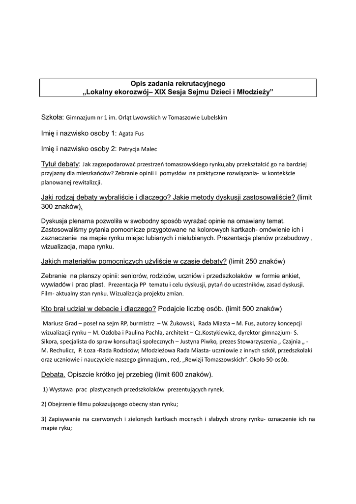 Opis zadania rekrutacyjnego „Lokalny ekorozwój– XIX Sesja Sejmu Dzieci i Młodzieży” Szkoła: Gimnazjum nr 1 im. Orląt Lwowskich w Tomaszowie Lubelskim Imię i nazwisko osoby 1: Agata Fus Imię i nazwisko osoby 2: Patrycja Malec Tytuł debaty: Jak zagospodarować przestrzeń tomaszowskiego rynku,aby przekształcić go na bardziej przyjazny dla mieszkańców? Zebranie opinii i pomysłów na praktyczne rozwiązania- w kontekście planowanej rewitalizcji. Jaki rodzaj debaty wybraliście i dlaczego? Jakie metody dyskusji zastosowaliście? (limit 300 znaków). Dyskusja plenarna pozwoliła w swobodny sposób wyrażać opinie na omawiany temat. Zastosowaliśmy pytania pomocnicze przygotowane na kolorowych kartkach- omówienie ich i zaznaczenie na mapie rynku miejsc lubianych i nielubianych. Prezentacja planów przebudowy , wizualizacja, mapa rynku. Jakich materiałów pomocniczych użyliście w czasie debaty? (limit 250 znaków) Zebranie na planszy opinii: seniorów, rodziców, uczniów i przedszkolaków w formie ankiet, wywiadów i prac plast. Prezentacja PP tematu i celu dyskusji, pytań do uczestników, zasad dyskusji. Film- aktualny stan rynku. Wizualizacja projektu zmian. Kto brał udział w debacie i dlaczego? Podajcie liczbę osób. (limit 500 znaków) Mariusz Grad – poseł na sejm RP, burmistrz – W. Żukowski, Rada Miasta – M. Fus, autorzy koncepcji wizualizacji rynku – M. Ozdoba i Paulina Pachla, architekt – Cz.Kostykiewicz, dyrektor gimnazjum- S. Sikora, specjalista do spraw konsultacji społecznych – Justyna Piwko, prezes Stowarzyszenia „ Czajnia „ M. Rechulicz, P. Łoza -Rada Rodziców; Młodzieżowa Rada Miasta- uczniowie z innych szkół, przedszkolaki oraz uczniowie i nauczyciele naszego gimnazjum., red, „Rewizji Tomaszowskich”. Około 50-osób. Debata. Opiszcie krótko jej przebieg (limit 600 znaków). 1) Wystawa prac plastycznych przedszkolaków prezentujących rynek. 2) Obejrzenie filmu pokazującego obecny stan rynku; 3) Zapisywanie na czerwonych i zielonych kartkach mocnych i słabych strony rynku- oznaczenie ich na mapie ryku; 4) Przedstawienie wniosków z prac przedszkolaków oraz wyników ankiet; 5) Omówienie cech i funkcji rynku przez architektów; 6) Ustalenie zasad dyskusji i wprowadzenie do niej; 7) Dyskusja panelistów i uczniów gimnazjum-prezentowanie kolejnych etapów spotkania na ekranienotowanie ich przez sekretarza; 8) Podsumowanie dyskusji przez moderatora. Wnioski z debat. Opiszcie je w punktach. Wskażcie podawane w trakcie debaty realne propozycje zmian dotyczące ekorozwoju w Waszym otoczeniu, plany na najbliższą przyszłość, działania które zamierzacie podjąć. (limit 700 znaków) Działania, które zamierzamy podjąć: 1. Wykonanie projektów plastycznych ławek przez uczniów - ławka młodych. 2. Przeznaczenie tablicy na rynku na prace plastyczne dla przedszkoli. 3.Postawienie tablica historycznej lub makiety dawnego Tomaszowa- przystąpiliśmy do konkursu grantowego Stowarzyszenia „Czajnia” Wnioski z debaty: Zakupienie większej ilości ławek i koszy na śmieci, • Lepsze wykorzystanie miejsc zabytkowych – np. Herbaciarni, • Nadzór straży miejskiej' • Wymiana kostki, • Więcej roślinności, • Zagospodarowanie części rynku na odpoczynek dla mieszkańców w różnym wieku, • Przygotowanie projektu skierowanego do mieszkańców-cel zmiana postrzegania rynku jako miejsca nieprzyjaznego, przejściowego. Napiszcie w jaki sposób i komu ogłosiliście i przedstawiliście wyniki Waszej debaty. (limit 300 znaków) 1) uczniom naszego gimnazjum- gazetka na korytarzu szkolnym; 2) mieszkańcom miasta- artykuł w „Rewizjach Tomaszowskich”, 3) zainteresowanym- strony internetowe Urzędu Miasta i gimnazjum, przedszkola; 4)przedszkolakom- wystawa zdjęć Wymieńcie wszystkie załączniki dokumentujące debatę, które dodaliście jako pliki do relacji z debaty (limit 300 znaków). Zdjęcia i prezentacje z debaty. Karty wypełnione przez uczestników z mocnymi i słabymi stronami rynku ( na zdjęciach ). Mapa rynku, na której oznaczyliśmy lubiane (zielone) i nielubiane ( czerwone) miejsca ( na zdjęciach ), Wizualizacja planów przebudowy rynku ( na zdjęciach ). Wymieńcie linki internetowe prezentujące Waszą debatę - np. link do dodatkowych zdjęć lub filmu (limit 300 znaków, pole nieobowiązkowe). http://gimnazjum1.tl24.pl/index.php http://www.strona.ps5tom.nazwa.pl/index.php?mact=Album,cntnt01,default,0&cntnt01albumid=400&c ntnt01returnid=17 http://www.rewizjetomaszowskie.pl/?p=2308 http://www.tomaszow-lubelski.pl/