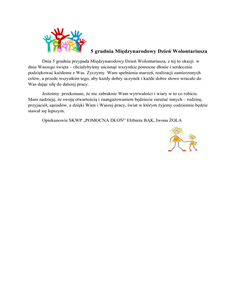 5 grudnia Międzynarodowy Dzień Wolontariusza Dnia 5 grudnia przypada Międzynarodowy Dzień Wolontariusza, z tej to okazji w dniu Waszego święta – chciałybyśmy uścisnąć wszystkie pomocne dłonie i serdecznie podziękować każdemu z Was. Życzymy Wam spełnienia marzeń, realizacji zamierzonych celów, a przede wszystkim tego, aby każdy dobry uczynek i każde dobre słowo wracało do Was dając siłę do dalszej pracy. Jesteśmy przekonane, że nie zabraknie Wam wytrwałości i wiary w to co robicie. Mam nadzieję, że swoją otwartością i zaangażowaniem będziecie zarażać innych – rodzinę, przyjaciół, sąsiadów, a dzięki Wam i Waszej pracy, świat w którym żyjemy codziennie będzie stawał się lepszym. Opiekunowie SKWP „POMOCNA DŁOŃ” Elżbieta BĄK, Iwona ŻOLA