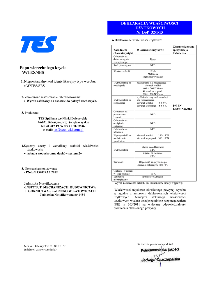 DEKLARACJA WŁA CIWO CI U YTKOWYCH Nr DoP 32/1/15 6.Deklarowane właściwości użytkowe: Zasadnicze charakterystyki Papa wierzchniego krycia W/TES/SBS 1. Niepowtarzalny kod identyfikacyjny typu wyrobu:  W/TES/SBS 2. Zamierzone zastosowanie lub zastosowania:  Wyrób asfaltowy na osnowie do pokryć dachowych. 3. Producent: TES Spółka z o.o Niwki Daleszyckie 26-021 Daleszyce, woj. więtokrzyskie tel. 41 317 19 86 fax 41 307 28 87 e-mail: [email protected] 4.Systemy oceny i weryfikacji stałości właściwości użytkowych:  izolacja wodochronna dachów system 2+ Odporność na działanie ognia zewnętrznego Reakcja na ogień Jednostka Notyfikowana •INSTYTUT MECHANIZACJI BUDOWNICTWA I GÓRNICTWA SKALNEGO W KATOWICACH Jednostka Notyfikowana nr 1454 Niwki Daleszyckie 20.05.2015r. (miejsce i data wystawienia) NPD 10 kPa Metoda A spełnienie wymagań Wytrzymałość na rozciąganie maksymalna siła rozciągająca kierunek wzdłuż 600 ± 300N/50mm kierunek w poprzek 500 ± 300 N/50mm wydłużenie przy maksymalnej sile rozciągającej. kierunek wzdłuż 5±3% kierunek w poprzek 5 ± 3 % Wytrzymałość na rozciąganie Odporność na przerastanie korzeni Odporność na obciążenie statyczne Odporność na uderzenie Wytrzymałość na rozdzieranie gwoździem Wytrzymałość : Giętkość w niskiej w temperaturze Substancje niebezpieczne Zharmonizowana specyfikacja techniczna FROOF Wodoszczelność Trwałość: 5. Norma zharmonizowana: • PN-EN 13707+A2:2012 Wła ciwo ci u ytkowe PN-EN 13707+A2:2012 NPD NPD NPD kierunek wzdłuż 250±150N kierunek w poprzek 300±150N złącza na oddzieranie NPD złącza na ścinanie NPD Odporność na spływanie po starzeniu sztucznym 85±10oC -15˚C spełnienie wymagań. Wyrób nie zawiera azbestu ani składników smoły węglowej Właściwości użytkowe określonego powyżej wyrobu są zgodne z zestawem deklarowanych właściwości użytkowych. Niniejsza deklaracja właściwości użytkowych wydana zostaje zgodnie z rozporządzeniem (UE) nr 305/2011 na wyłączną odpowiedzialność producenta określonego powyżej W imieniu producenta podpisał