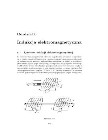 Rozdział 6 Indukcja elektromagnetyczna 6.1 Zjawisko indukcji elektromagnetycznej W rozdziale tym rozpatrzymy niektóre zagadnienia, związane ze zmiennymi w czasie polami elektrycznymi i magnetycznymi oraz zmiennymi prądami elektrycznymi. Oersted wykazał doświadczalnie, że wokół przewodnika, przez który płynie prąd elektryczny, istnieje pole magnetyczne. Po odkryciu Oersteda uczeni wielokrotnie podejmowali próby wytworzenia prądu w przewodniku, umieszczonym w pole magnetycznym trwałego magnesu lub innego przewodnika z prądem. W 1831 r. M. Faraday stwierdził, że zmienne w czasie pole magnetyczne istotnie powoduje przepływ prądu elektryczne- Rysunek 6.1: 157 158 Indukcja elektromagnetyczna go w przewodniku. Zjawisko to nazywa się indukcją elektromagnetyczną a powstający wówczas prąd — prądem indukowanym. Dwa z doświadczeń Faraday’a pokazuje rysunek 6.1. Faraday ustalił doświadczalnie, że siła elektromotoryczna E, powstająca w obwodzie, jest proporcjonalna do szybkości zmian w czasie strumienia indukcji pola magnetycznego ΦB , obejmowanego przez obwód. W układzie jednostek MKSA prawo indukcji Faraday’a ma postać: E =− dΦB . dt (6.1) Znak „−” w tym wzorze związany jest z kierunkiem siły elektromotorycznej E, jak będzie wyjaśnione dalej. Przytoczymy teraz dwa wyprowadzenia prawa indukcji Faraday’a dla szczególnego przypadku obwodu z ruchomym prostoliniowym odcinkiem o długości l poruszającym się z prędkością v (rys. 6.2). Zakładamy, że obwód ten znajduje się w jednorodnym polu magnetycznym o indukcji B, skierowanym prostopadle do płaszczyzny obwodu i do wektora prędkości v jego ruchomego odcinka. Obliczymy najpierw siłę elektromotoryczną E, indukowaną w prostoliniowym odcinku obwodu przy założeniu, że odcinek ten nie jest połączony z pozostałą częścią obwodu. Na ładunek q, znajdujący się w niewielkiej części tego przewodnika, działa ze strony pola magnetycznego siła F m o wartości liczbowej: Fm = qvB (6.2) (por. wzór (4.1), podrozdział 4.1). Pod działaniem tej siły nośniki ładunku przemieszczają się wzdłuż przewodnika, w wyniku czego wewnątrz niego powstaje pole elektrostatyczne o natężeniu E. Siła F e , jaką na ładunek q Rysunek 6.2: Zjawisko indukcji elektromagnetycznej 159 działa pole elektryczne, ma wartość: Fe = qE. (6.3) Ruch nośników ładunku w przewodniku będzie zachodził do momentu, gdy obie siły zrównoważą się: Fe = Fm , (6.4) co daje związek: E = vB. (6.5) Przy założeniu, że pole elektryczne wewnątrz przewodnika jest jednorodne, indukowaną w nim siłę elektromotoryczną E, równą co do wartości bezwzględnej różnicy potencjałów między końcami przewodnika, określa wzór: E = El, (6.6) czyli: E = vBl . (6.7) Jeżeli rozpatrywany odcinek przewodnika jest połączony z pozostałym fragmentem obwodu, indukowana w obwodzie siła elektromotoryczna nie zmieni się i w obwodzie tym będzie płynął prąd elektryczny. W tym przypadku wyrażenie po prawej stronie ostatniego wzoru można przekształcić jak następuje: Blv = Bl ∆x B∆S ∆ΦB =− =− ∆t ∆t ∆t (6.8) (∆x — przemieszczenie ruchomego odcinka, ∆S — zmiana powierzchni obwodu, ∆ΦB — zmiana strumienia indukcji pola magnetycznego w czasie ∆t). Z dwóch ostatnich wzorów otrzymujemy więc prawo indukcji Faraday’a: E =− ∆ΦB , ∆t (6.9) wyrażone przez skończone przyrosty strumienia pola magnetycznego i czasu. Niemiecki fizyk H. Helmholtz zauważył, że prawo indukcji Faraday’a można wyprowadzić z zasady zachowania energii. Podamy takie wyprowadzenie w przypadku rozważanego poprzednio obwodu. Na ruchomy odcinek obwodu działa ze strony pola magnetycznego siła FB (rys. 6.2), której wartość wynosi: FB = IlB (6.10) 160 Indukcja elektromagnetyczna (por. wzór (4.35) z podrozdziału 4.3). Przy założeniu, że ruch odcinka przewodnika jest jednostajny, siła ta musi być zrównoważona przez zewnętrzną siłę F : F = FB . (6.11) Siła ta, przy przesuwaniu ruchomego odcinka obwodu, dostarcza do obwodu moc: P = F v = FB v = IlBv. (6.12) Występujący w tym wzorze czynnik lBv jest równy, zgodnie ze wzorem (6.8), szybkości zmian strumienia indukcji pola magnetycznego. Wobec tego moc: P =− ∆ΦB I. ∆t (6.13) Zgodnie z zasadą zachowania energii, identyczna moc musi być rozpraszana na oporze R w rozpatrywanym obwodzie. Ponieważ moc wydzieloną w obwodzie można wyrazić wzorem (3.36) z podrozdziału 3.2, (zastępując w nim napięcie U przez siłę elektromotoryczną E), więc: P = EI. (6.14) Porównując ostatnie dwa wzory, otrzymujemy znowu prawo indukcji Faraday’a (6.9). Przytoczony przykład wskazuje, że w przypadku, gdy zamknięty obwód lub jego odcinek porusza się w polu magnetycznym, indukowanie się w nim prądu można wyjaśnić oddziaływaniem pola magnetycznego na ładunki w przewodnikach, tworzących ten obwód. Wyjaśnienie to nie jest jednak uniwersalne. Nie można go zastosować do przypadku zjawiska indukcji elektromagnetycznej w nieruchomych obwodach zamkniętych, znajdujących się w zmiennym polu magnetycznym (por. rys. 6.1). Istotnie, pole magnetyczne nie oddziaływuje na nieruchome ładunki i nie może wprawiać ich w ruch. W celu zinterpretowania zjawiska indukcji elektromagnetycznej w nieruchomych obwodach należy przyjąć, że zmienne w czasie pole magnetyczne wywołuje powstanie wirowego pola elektrycznego, które powoduje przepływ prądu elektrycznego w zamkniętym obwodzie. Wspomniane pole elektryczne istnieje w przestrzeni zawsze, zamknięty obwód pozwala jedynie stwierdzić jego obecność (rys. 6.3 - 6.4). Różnice w interpretacji zjawiska indukcji elektromagnetycznej w poruszających się i nieruchomych względem pola magnetycznego obwodach są wynikiem zależności natężenia pola elektrycznego i indukcji pola magnetycznego od wyboru układu odniesienia. W szczególnej teorii względności dowodzi się, że pole ele