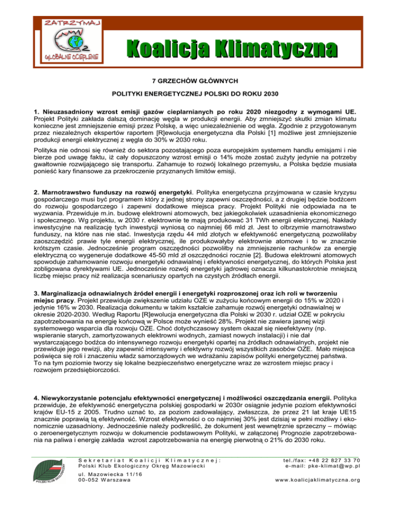 Koalicja Klimatyczna 7 GRZECHÓW GŁÓWNYCH POLITYKI ENERGETYCZNEJ POLSKI DO ROKU 2030 1. Nieuzasadniony wzrost emisji gazów cieplarnianych po roku 2020 niezgodny z wymogami UE. Projekt Polityki zakłada dalszą dominację węgla w produkcji energii. Aby zmniejszyć skutki zmian klimatu konieczne jest zmniejszenie emisji przez Polskę, a więc uniezależnienie od węgla. Zgodnie z przygotowanym przez niezależnych ekspertów raportem [R]ewolucja energetyczna dla Polski [1] możliwe jest zmniejszenie produkcji energii elektrycznej z węgla do 30% w 2030 roku. Polityka nie odnosi się również do sektora pozostającego poza europejskim systemem handlu emisjami i nie bierze pod uwagę faktu, iż cały dopuszczony wzrost emisji o 14% może zostać zużyty jedynie na potrzeby gwałtownie rozwijającego się transportu. Zahamuje to rozwój lokalnego przemysłu, a Polska będzie musiała ponieść kary finansowe za przekroczenie przyznanych limitów emisji. 2. Marnotrawstwo funduszy na rozwój energetyki. Polityka energetyczna przyjmowana w czasie kryzysu gospodarczego musi być programem który z jednej strony zapewni oszczędności, a z drugiej będzie bodźcem do rozwoju gospodarczego i zapewni dodatkowe miejsca pracy. Projekt Polityki nie odpowiada na te wyzwania. Przewiduje m.in. budowę elektrowni atomowych, bez jakiegokolwiek uzasadnienia ekonomicznego i społecznego. Wg projektu, w 2030 r. elektrownie te mają produkować 31 TWh energii elektrycznej. Nakłady inwestycyjne na realizację tych inwestycji wyniosą co najmniej 66 mld zł. Jest to olbrzymie marnotrawstwo funduszy, na które nas nie stać. Inwestycja rzędu 44 mld złotych w efektywność energetyczną pozwoliłaby zaoszczędzić prawie tyle energii elektrycznej, ile produkowałyby elektrownie atomowe i to w znacznie krótszym czasie. Jednocześnie program oszczędności pozwoliłby na zmniejszenie rachunków za energię elektryczną co wygeneruje dodatkowe 45-50 mld zł oszczędności rocznie [2]. Budowa elektrowni atomowych spowoduje zahamowanie rozwoju energetyki odnawialnej i efektywności energetycznej, do których Polska jest zobligowana dyrektywami UE. Jednocześnie rozwój energetyki jądrowej oznacza kilkunastokrotnie mniejszą liczbę miejsc pracy niż realizacja scenariuszy opartych na czystych źródłach energii. 3. Marginalizacja odnawialnych źródeł energii i energetyki rozproszonej oraz ich roli w tworzeniu miejsc pracy. Projekt przewiduje zwiększenie udziału OZE w zużyciu końcowym energii do 15% w 2020 i jedynie 16% w 2030. Realizacja dokumentu w takim kształcie zahamuje rozwój energetyki odnawialnej w okresie 2020-2030. Według Raportu [R]ewolucja energetyczna dla Polski w 2030 r. udział OZE w pokryciu zapotrzebowania na energię końcową w Polsce może wynieść 28%. Projekt nie zawiera jasnej wizji systemowego wsparcia dla rozwoju OZE. Choć dotychczasowy system okazał się nieefektywny (np. wspieranie starych, zamortyzowanych elektrowni wodnych, zamiast nowych instalacji) i nie dał wystarczającego bodźca do intensywnego rozwoju energetyki opartej na źródłach odnawialnych, projekt nie przewiduje jego rewizji, aby zapewnić intensywny i efektywny rozwój wszystkich zasobów OZE. Mało miejsca poświęca się roli i znaczeniu władz samorządowych we wdrażaniu zapisów polityki energetycznej państwa. To na tym poziomie tworzy się lokalne bezpieczeństwo energetyczne wraz ze wzrostem miejsc pracy i rozwojem przedsiębiorczości. 4. Niewykorzystanie potencjału efektywności energetycznej i możliwości oszczędzania energii. Polityka przewiduje, że efektywność energetyczna polskiej gospodarki w 2030r osiągnie jedynie poziom efektywności krajów EU-15 z 2005. Trudno uznać to, za poziom zadowalający, zwłaszcza, że przez 21 lat kraje UE15 znacznie poprawią tą efektywność. Wzrost efektywności o co najmniej 30% jest dzisiaj w pełni możliwy i ekonomicznie uzasadniony. Jednocześnie należy podkreślić, że dokument jest wewnętrznie sprzeczny – mówiąc o zeroenergetycznym rozwoju w dokumencie podstawowym Polityki, w załączonej Prognozie zapotrzebowania na paliwa i energię zakłada wzrost zapotrzebowania na energię pierwotną o 21% do 2030 roku. _______________________________________________________________________________________________________________ Sekretariat Koalicji Klimatycznej: tel./fax: +48 22 827 33 70 Polski Klub Ekologiczny Okręg Mazowiecki e-mail: [email protected] ul. Mazowiecka 11/16 00-052 W arszawa www.koalicjaklimatyczna.org 5. Nieuzasadniony i przyjęty bez debaty publicznej plan budowy elektrowni atomowych. Rząd podjął decyzję o budowie elektrowni jądrowych w Polsce, bez analiz ekonomicznych, bez oceny konsekwencji ekologicznych i społecznych oraz bez debaty publicznej. Ta niebezpieczna technologia wiąże się m.in. z nierozwiązywalnym problemem składowania odpadów, zagrożeniem ze strony ataków terrorystycznych na duże obiekty energetyki jądrowej (także transport paliwa i odpadów radioaktywnych), a w przypadku spowodowania poważnej awarii skala oddziaływania może sięgać dziesiątków tysięcy ludzi. Wg prac prowadzonych w Instytucie na rzecz Ekorozwoju nad Alternatywną polityką energetyczną dla Polski do 2030 roku rozwój energetyki jądrowej nie ma uzasadnienia ekonomicznego, ekologicznego i społecznego. Scenariusz, w którym wiodącą rolę odgrywa efektywność energetyczna wspierana szybkim rozwojem OZE pozwala zaspokoić potrzeby energetyczne kraju przy spełnieniu wymogów ekologicznych z promowaniem rozwiązań pro społecznych. Takie podejście zgodne jest z zapisaną w Konstytucji zasadą zrównoważonego rozwoju. 6. Brak rzetelnej oceny oddziaływania na środowisko. Prognoza oddziaływania na środowisko została przygotowana niezgodnie z obowiązującym prawe. Na 25 elementów, które powinna zawierać prognoza zgodnie z ustawą z dnia 3 października 2008 r. o udostępnianiu informacji o środowisku i jego oc