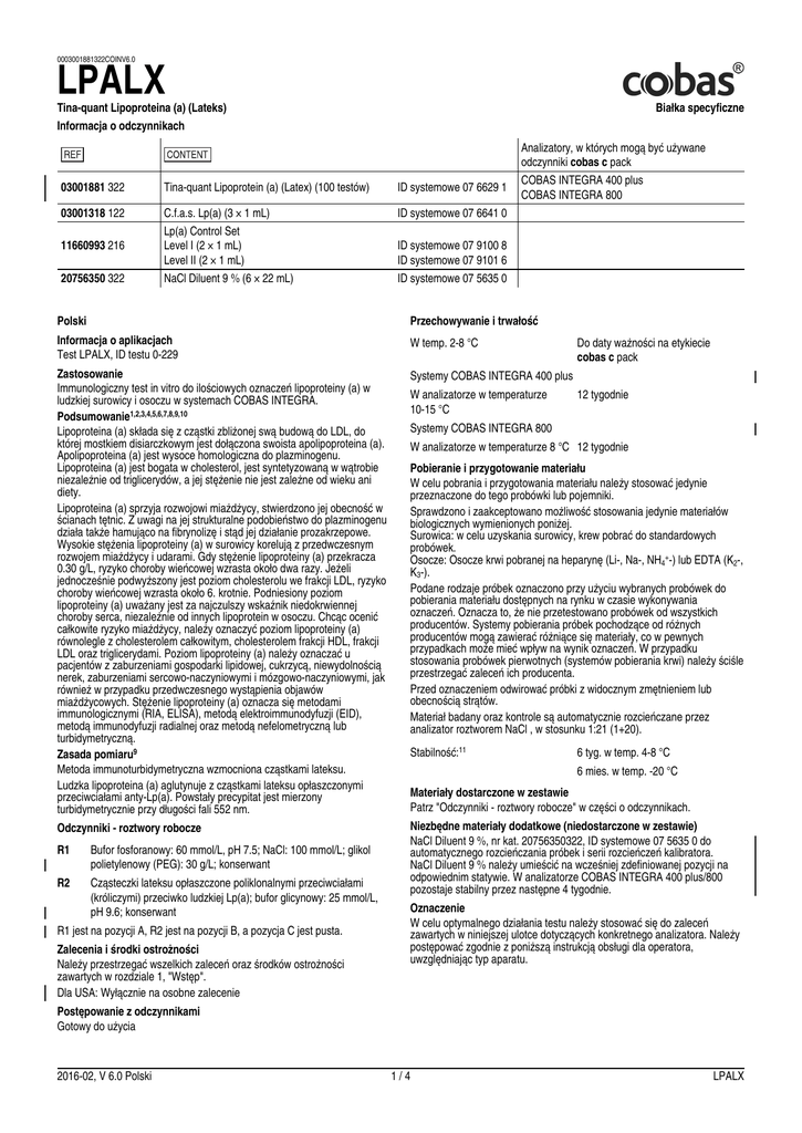 0003001881322COINV6.0 LPALX Tina-quant Lipoproteina (a) (Lateks) Białka specyficzne Informacja o odczynnikach 03001881 322 Tina‑quant Lipoprotein (a) (Latex) (100 testów) ID systemowe 07 6629 1 03001318 122 C.f.a.s. Lp(a) (3 × 1 mL) Lp(a) Control Set Level I (2 × 1 mL) Level II (2 × 1 mL) NaCl Diluent 9 % (6 × 22 mL) ID systemowe 07 6641 0 11660993 216 20756350 322 Analizatory, w których mogą być używane odczynniki cobas c pack COBAS INTEGRA 400 plus COBAS INTEGRA 800 ID systemowe 07 9100 8 ID systemowe 07 9101 6 ID systemowe 07 5635 0 Polski Przechowywanie i trwałość Informacja o aplikacjach Test LPALX, ID testu 0‑229 W temp. 2‑8 °C Zastosowanie Immunologiczny test in vitro do ilościowych oznaczeń lipoproteiny (a) w ludzkiej surowicy i osoczu w systemach COBAS INTEGRA. Podsumowanie1,2,3,4,5,6,7,8,9,10 Lipoproteina (a) składa się z cząstki zbliżonej swą budową do LDL, do której mostkiem disiarczkowym jest dołączona swoista apolipoproteina (a). Apolipoproteina (a) jest wysoce homologiczna do plazminogenu. Lipoproteina (a) jest bogata w cholesterol, jest syntetyzowaną w wątrobie niezależnie od triglicerydów, a jej stężenie nie jest zależne od wieku ani diety. Lipoproteina (a) sprzyja rozwojowi miażdżycy, stwierdzono jej obecność w ścianach tętnic. Z uwagi na jej strukturalne podobieństwo do plazminogenu działa także hamująco na fibrynolizę i stąd jej działanie prozakrzepowe. Wysokie stężenia lipoproteiny (a) w surowicy korelują z przedwczesnym rozwojem miażdżycy i udarami. Gdy stężenie lipoproteiny (a) przekracza 0.30 g/L, ryzyko choroby wieńcowej wzrasta około dwa razy. Jeżeli jednocześnie podwyższony jest poziom cholesterolu we frakcji LDL, ryzyko choroby wieńcowej wzrasta około 6. krotnie. Podniesiony poziom lipoproteiny (a) uważany jest za najczulszy wskaźnik niedokrwiennej choroby serca, niezależnie od innych lipoprotein w osoczu. Chcąc ocenić całkowite ryzyko miażdżycy, należy oznaczyć poziom lipoproteiny (a) równolegle z cholesterolem całkowitym, cholesterolem frakcji HDL, frakcji LDL oraz triglicerydami. Poziom lipoproteiny (a) należy oznaczać u pacjentów z zaburzeniami gospodarki lipidowej, cukrzycą, niewydolnością nerek, zaburzeniami sercowo-naczyniowymi i mózgowo-naczyniowymi, jak również w przypadku przedwczesnego wystąpienia objawów miażdżycowych. Stężenie lipoproteiny (a) oznacza się metodami immunologicznymi (RIA, ELISA), metodą elektroimmunodyfuzji (EID), metodą immunodyfuzji radialnej oraz metodą nefelometryczną lub turbidymetryczną. Zasada pomiaru9 Metoda immunoturbidymetryczna wzmocniona cząstkami lateksu. Ludzka lipoproteina (a) aglutynuje z cząstkami lateksu opłaszczonymi przeciwciałami anty‑Lp(a). Powstały precypitat jest mierzony turbidymetrycznie przy długości fali 552 nm. Systemy COBAS INTEGRA 400 plus Odczynniki - roztwory robocze Niezbędne materiały dodatkowe (niedostarczone w zestawie) NaCl Diluent 9 %, nr kat. 20756350322, ID systemowe 07 5635 0 do automatycznego rozcieńczania próbek i serii rozcieńczeń kalibratora. NaCl Diluent 9 % należy umieścić na wcześniej zdefiniowanej pozycji na odpowiednim statywie. W analizatorze COBAS INTEGRA 400 plus/800 pozostaje stabilny przez następne 4 tygodnie. R1 Bufor fosforanowy: 60 mmol/L, pH 7.5; NaCl: 100 mmol/L; glikol polietylenowy (PEG): 30 g/L; konserwant R2 Cząsteczki lateksu opłaszczone poliklonalnymi przeciwciałami (króliczymi) przeciwko ludzkiej Lp(a); bufor glicynowy: 25 mmol/L, pH 9.6; konserwant R1 jest na pozycji A, R2 jest na pozycji B, a pozycja C jest pusta. Zalecenia i środki ostrożności Należy przestrzegać wszelkich zaleceń oraz środków ostrożności zawartych w rozdziale 1, "Wstęp". Dla USA: Wyłącznie na osobne zalecenie W analizatorze w temperaturze 10‑15 °C Do daty ważności na etykiecie cobas c pack 12 tygodnie Systemy COBAS INTEGRA 800 W analizatorze w temperaturze 8 °C 12 tygodnie Pobieranie i przygotowanie materiału W celu pobrania i przygotowania materiału należy stosować jedynie przeznaczone do tego probówki lub pojemniki. Sprawdzono i zaakceptowano możliwość stosowania jedynie materiałów biologicznych wymienionych poniżej. Surowica: w celu uzyskania surowicy, krew pobrać do standardowych probówek. Osocze: Osocze krwi pobranej na heparynę (Li-, Na-, NH4+-) lub EDTA (K2-, K3-). Podane rodzaje próbek oznaczono przy użyciu wybranych probówek do pobierania materiału dostępnych na rynku w czasie wykonywania oznaczeń. Oznacza to, że nie przetestowano probówek od wszystkich producentów. Systemy pobierania próbek pochodzące od różnych producentów mogą zawierać różniące się materiały, co w pewnych przypadkach może mieć wpływ na wynik oznaczeń. W przypadku stosowania probówek pierwotnych (systemów pobierania krwi) należy ściśle przestrzegać zaleceń ich producenta. Przed oznaczeniem odwirować próbki z widocznym zmętnieniem lub obecnością strątów. Materiał badany oraz kontrole są automatycznie rozcieńczane przez analizator roztworem NaCl , w stosunku 1:21 (1+20). Stabilność:11 6 tyg. w temp. 4‑8 °C 6 mies. w temp. -20 °C Materiały dostarczone w zestawie Patrz "Odczynniki - roztwory robocze" w części o odczynnikach. Oznaczenie W celu optymalnego działania testu należy stosować się do zaleceń zawartych w niniejszej ulotce dotyczących konkretnego analizatora. Należy postępować zgodnie z poniższą instrukcją obsługi dla operatora, uwzględniając typ aparatu. Postępowanie z odczynnikami Gotowy do użycia 2016-02, V 6.0 Polski 1/4 LPALX 0003001881322COINV6.0 LPALX Tina-quant Lipoproteina (a) (Lateks) Białka specyficzne Aplikacja dla surowicy i osocza Definicja testu COBAS INTEGRA 400 plus Spójność pomiarowa: Metoda standaryzowana wobec preparatu Lp(a) o wysokim stopniu czystości, stosowanego jako kalibrator pierwotny (master calibrator).11 Rodzaj pomiaru Absorbancja Model kalkulacyjny absorbancji 