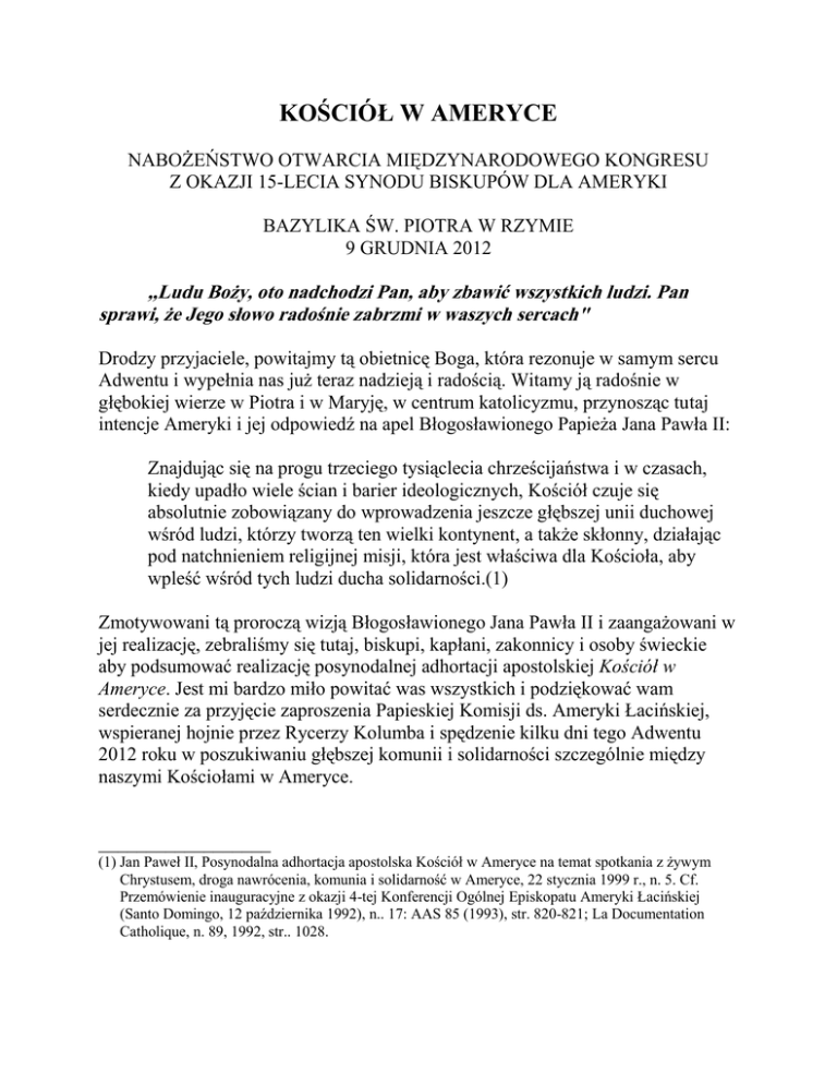 KOŚCIÓŁ W AMERYCE NABOŻEŃSTWO OTWARCIA MIĘDZYNARODOWEGO KONGRESU Z OKAZJI 15-LECIA SYNODU BISKUPÓW DLA AMERYKI BAZYLIKA ŚW. PIOTRA W RZYMIE 9 GRUDNIA 2012 ,,Ludu Boży, oto nadchodzi Pan, aby zbawić wszystkich ludzi. Pan sprawi, że Jego słowo radośnie zabrzmi w waszych sercach" Drodzy przyjaciele, powitajmy tą obietnicę Boga, która rezonuje w samym sercu Adwentu i wypełnia nas już teraz nadzieją i radością. Witamy ją radośnie w głębokiej wierze w Piotra i w Maryję, w centrum katolicyzmu, przynosząc tutaj intencje Ameryki i jej odpowiedź na apel Błogosławionego Papieża Jana Pawła II: Znajdując się na progu trzeciego tysiąclecia chrześcijaństwa i w czasach, kiedy upadło wiele ścian i barier ideologicznych, Kościół czuje się absolutnie zobowiązany do wprowadzenia jeszcze głębszej unii duchowej wśród ludzi, którzy tworzą ten wielki kontynent, a także skłonny, działając pod natchnieniem religijnej misji, która jest właściwa dla Kościoła, aby wpleść wśród tych ludzi ducha solidarności.(1) Zmotywowani tą proroczą wizją Błogosławionego Jana Pawła II i zaangażowani w jej realizację, zebraliśmy się tutaj, biskupi, kapłani, zakonnicy i osoby świeckie aby podsumować realizację posynodalnej adhortacji apostolskiej Kościół w Ameryce. Jest mi bardzo miło powitać was wszystkich i podziękować wam serdecznie za przyjęcie zaproszenia Papieskiej Komisji ds. Ameryki Łacińskiej, wspieranej hojnie przez Rycerzy Kolumba i spędzenie kilku dni tego Adwentu 2012 roku w poszukiwaniu głębszej komunii i solidarności szczególnie między naszymi Kościołami w Ameryce. __________________ (1) Jan Paweł II, Posynodalna adhortacja apostolska Kościół w Ameryce na temat spotkania z żywym Chrystusem, droga nawrócenia, komunia i solidarność w Ameryce, 22 stycznia 1999 r., n. 5. Cf. Przemówienie inauguracyjne z okazji 4-tej Konferencji Ogólnej Episkopatu Ameryki Łacińskiej (Santo Domingo, 12 października 1992), n.. 17: AAS 85 (1993), str. 820-821; La Documentation Catholique, n. 89, 1992, str.. 1028. Synod z 1999 roku był kamieniem milowym w pojednaniu i skutecznej współpracy między naszymi diecezjami w Ameryce Północnej i Ameryce Południowej. Chcielibyśmy podziękować Bogu tu w Bazylice Świętego Piotra w Rzymie i prosić Ducha Świętego wraz z Matką Bożką z Guadalupe i Św. Juanem Diego o następny etap nowej ewangelizacji na tym wielkiego kontynencie, który jest domem dla ponad połowy katolików na świecie. Słowo Boże podczas tej drugiej niedzieli Adwentu rzuca światło na ducha i postawy, które powinny pobudzać nas w tych dniach refleksji i nadziei. Posłuchajmy proroka Barucha: Powstań, Jeruzalem! Stań na wysokości; spójrz na wschód i zobaczyć swoje dzieci, zebrane od wschodu do zachodu na słowo Świętego, cieszące się, że są one zapamiętane przez Boga (Bar 5:5). Słowo Boże, które nas jednoczy, to Chrystus Pan, Pożądany przez narody. Jest On tym, który wschodzi na wschodzie, jak wschodzące słońce, i tym, którego Ameryka spotkała i przyjęła 500 lat temu, dzięki matczynej czułości Maryi, która raczyła objawić się Juanowi Diego z indiańskimi cechami Matki Bożej z Guadalupe. Dotknięta do samego serca miłosierdziem Bożym objawionym w Jej cechach, od tego momentu, Ameryka maszeruje do przodu z nadzieją Bożą, która przychodzi w postaci Chrystusa, wśród nadziei i wyzwań obecnego świata. Ponieważ Bóg przykazał, aby każda wysoka góra i prastare wzgórza stały się niskie, i aby doliny zostały wypełnione tak, by Izrael mógł rozwijać się bezpiecznie w chwale Boga (Bar 05:07). Bóg postanowił ocalić swoich ludzi i prowadzić ich prostą ścieżką w kierunku chwały Jego Królestwa. Dlatego Chrystus rozbił swój namiot w Ameryce, zwłaszcza wśród biednych, i ustanowił tu swój dom chwały wśród tych, którzy podzielają jego miłość. Jego wielkie ramiona rozpostarte na wzgórzach Cubilete (Leon, Meksyk) oraz Corcovado (Rio de Janeiro, Brazylia) wzywają nas do upamiętnienia odwagi misjonarzy, do szanowania świętych i krwi męczenników, którzy uczynili Amerykę świętą ziemią. Radujmy się w Jego Boskim Sercu, witając z kolei orędzie Jana Chrzciciela: ,,Przygotujcie drogę Panu, wyprostujcie dla Niego wszystkie ścieżki. Niech każda dolina zostanie wypełniona, a każda góra i pagórek zrównane "(Łk 3:4-5). Kościół w Ameryce musi usłyszeć ponownie wezwanie Synodu z 1999 roku, które zostało ponownie ożywione dla potrzeb Kościoła powszechnego przez niedawny Synod na temat nowej ewangelizacji, wezwanie do nawrócenia, komunii i solidarności. Nigdy nie było żywego Kościoła bez stałego nawracania swoich członków do Ewangelii Jezusa Chrystusa; nie może być Kościoła żyjący bez głębokiej i częstej Komunii z Ciałem Chrystusa, tryskającym i krystalicznym źródłem swej jedności; nie może być promienna i misjonarnego Kościoła w Ameryce bez solidarności, która jest bardziej solidna i twórcza między Północą a Południem kontynentu. Jesteśmy świadomi tych wyzwań, chcemy podejść do nich z odwagą dzieci Bożych, które zdają się na Jego łaskę. To dlatego nasza obecność tutaj w tej bazylice jest przede wszystkim aktem wiary, w duchu trwającego Roku Wiary; jest również prośbą skierowaną do Ducha Świętego do niezbędnego nawrócenia naszych Kościołów do komunii i solidarności wśród wszystkich. Słowa Św. Pawła do Filipian napełniają nas nadzieją: "[Bóg], który zapoczątkował w was dobre dzieło będzie kontynuował je do dnia Jezusa Chrystusa" (Filip 1:6). Drodzy przyjaciele, przyjmijmy te słowa pociechy i nadziei, które zostaną wkrótce potwierdzone przez naszego Ojca Świętego Benedykta XVI, następcy Piotra i poręczyciela jedności całego Kościoła. Otwórzmy nasze serca, jako dzieci Boga na błogosławieństwa Ojca Świętego. Największą łaskę jedności i sol