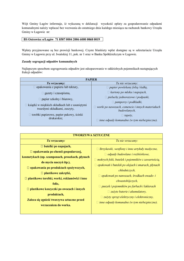 Wójt Gminy Łagów informuje, iż wykazaną w deklaracji wysokość opłaty za gospodarowanie odpadami komunalnymi należy wpłacać bez wezwania do ostatniego dnia każdego miesiąca na rachunek bankowy Urzędu Gminy w Łagowie nr: BS Ostrowiec o/Łagów 71 8507 0004 2006 6000 0068 0019 Wpłaty przyjmowane są bez prowizji bankowej. Czyste blankiety wpłat dostępne są w sekretariacie Urzędu Gminy w Łagowie przy ul. Iwańskiej 11, pok. nr 1 oraz w Banku Spółdzielczym w Łagowie. Zasady segregacji odpadów komunalnych Najlepszym sposobem segregowania odpadów jest odseparowanie w oddzielnych pojemnikach następujących frakcji odpadów: PAPIER Tu nie wrzucamy: papier powlekany folią i kalkę, Tu wrzucamy: kartony po mleku i napojach, pieluchy jednorazowe i podpaski, w miękkich okładkach lub z usuniętymi twardymi okładkami, zeszyty, torebki papierowe, papier pakowy, ścinki drukarskie; pampersy i podkładki, worki po nawozach, cemencie i innych materiałach budowlanych, tapety, inne odpady komunalne (w tym niebezpieczne). TWORZYWA SZTUCZNE Tu wrzucamy: Tu nie wrzucamy: Strzykawki, wenflony i inne artykuły medyczne, kosmetykach (np. szamponach, proszkach, płynach do mycia naczyń itp.), odpady budowlane i rozbiórkowe, mokrych folii, butelek i pojemników z zawartością, chłodniczych, -i folie, produktach, Zaleca się zgnieść tworzywa sztuczne przed wrzuceniem do worka. chwastobójczych, zużyte baterie i akumulatory, zużyty sprzęt elektryczny i elektroniczny, inne odpady komunalne (w tym niebezpieczne). SZKŁO Tu nie wrzucamy: Tu wrzucamy: szkło stołowe – żaroodporne, ceramika, doniczki, znicze z zawartością wosku, żarówki i świetlówki, szkło kryształowe, lane opakowania po kosmetykach, reflektory, nie opróżnione opakowania po lekach, olejach, uszczelek), rozpuszczalnikach, termometry i strzykawki, monitory i lampy telewizyjne, Zaleca się wrzucać opakowania opróżnione z szyby okienne i zbrojone, produktu, bez zakrętek, starać się nie tłuc szkła. szyby samochodowe, lustra i witraże, fajans i porcelana, inne odpady komunalne (w tym niebezpieczne). ODPADY ZIELONE Tu wrzucamy: Tu nie wrzucamy: kości zwierząt, resztki żywności, mięso i padlina zwierząt, olej jadalny, drewno impregnowane, owoce, warzywa, płyty wiórowe i MDF, leki, odchody zwierząt, popiół z węgla kamiennego, inne odpady komunalne (w tym niebezpieczne). Pozostałe odpady trafią do pojemnika na odpady zmieszane – jeśli będzie ich mniej obniżymy koszty i przyczynimy się do poprawy stanu środowiska.