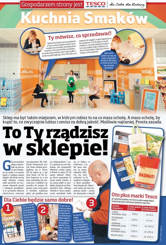 Gospodarzem strony jest awać! d e z r p s o c , z Ty mówis aczyć samkować, jak wyglądać i w jakim opakonowywachniu ma w masz szansę zob Taką Kuchnię Smakó lskich miastach. Są nie po ch w Tesco w cztere e laoba, ale profesjonaln wszędzie, bo to nie ozd ujesz ób spr że ło, Ma e! nn boratorium. Choć kuche na półki, to duktów, zanim trafią tam smaku wielu pro jak ma coś to Na co? Na sz. łosuje przede wszystkim zag Ty decydujesz o być sprzedawane. To Teie specjały pod marką jak tym produktach, o tak ć, wa ako sm Ci ją . Ma sco staną na półkach ni ś. Usiądź więc w Kuch jak to co zawsze lubiłe m! rte Smaków i zostań ekspe Klient ocenia produkt i tę ocenę wypisuje na specjalnym formularzu. Nie smakuje? Innym też nie! Tesco tego nie będzie sprzedawać! Sklep ma być takim miejscem, w którym robisz to na co masz ochotę. A masz ochotę, by kupić to, co zwyczajnie lubisz i cenisz za dobrą jakość. Możliwie najtaniej. Prosta zasada. To Ty rządzisz w sklepie! rozwiązaniem dla wielbicieli światowych marek. Temu właśnie przyglądamy się w Tesco. Od lat pijesz tę, a nie inną kawę, od lat lubisz kupować tę a nie inna czekoladę, nie mówiąc już o wędlinie czy proszku do prania. Po prostu masz swój gust! A łacińska maksyma głosi: „de gustibus non est disputandum”, czyli o gustach się nie dyskutuje. Ale momencik! Możemy wydać mniej, a dostać to samo. W tej samej jakości! Dlatego Tesco proponuje Ci swoje marki własne. Z tej samej półki co produkty słynnych od dziesięcioleci firm. Dlatego właśnie w Tesco naukowymi metodami bada Dla Ciebie będzie samo dobre! 1 dzieZobacz co się dysm je w centru Każ! m ny yj uc tryb a cz ar dy, kto dost ty uk od pr e swoj e być do Tesco moż ecz w że , pewny iej śniej czy późn majego towar w i iedz w od e ni zy ga mie ten pan. I weź nia da ba do ki ób pr być a m Bo jakości! ntrko w k ja ka ta akcie! 2 się co lubisz, co wybierasz i jakie masz zdanie na temat zakupów. Nikt Cię nie chce zmieniać, to Ty rządzisz w sklepie. A skoro produkty Tesco kupisz 20 - 30 procent taniej niż inne popularne marki – czemu nie skorzystać z okazji? 3 Ten pan wie, co znaczy np. jędrna nektarynka. Ma do tego kosmiczny sprzęt do prze- My tego nie bijania miąższu! zrobimy Owoce poddawa- w sklepie. Ale ne są próbie na specjalista od jai jędrnóść. To czy kości w Tesco rozkro czy i dz raw sp i oce zdały, czy nie odow być notowywane jest są takie, jakie mają ed wi po od ją ma w specjalnym ra- czy czy. porcie. Od takienio dużo soku i słody hoec prz o sit ie tak go raportu nie ma Przez ary! tow odwołania! dzą najróżniejsze Oto plus marki Tesco Jak rozpoznasz produkty z linii Tesco na półce swojego sklepu? Szukaj atrakcyjnych, kolorow ych opakowań z logo Tesco nazwa produktu cena marki tesco cena marki, którą znasz Łosoś norweski 100g Ryż basmati 400 g 7,99 zł ok. 16 zł 3,99 zł ok. 5 zł Ziemniaki kremowe 2,5 kg 2,99 zł ok. 3,60 zł Makaron kokardki 500 g 2,29 zł ok. 4,50 zł Sałata 240 g 4,99 zł ok. 6,50 zł Ceny z dnia publikacji G dy ma się jeden sklep, to sprzedaje się tam to, co jest dostępne na rynku i co można kupić w każdym innym sklepie. Ale kiedy ma się setki sklepów, można sobie pozwolić na tworzenie własnych marek i własnych produktów. A te są bardzo dobrym jakościowo, tańszym