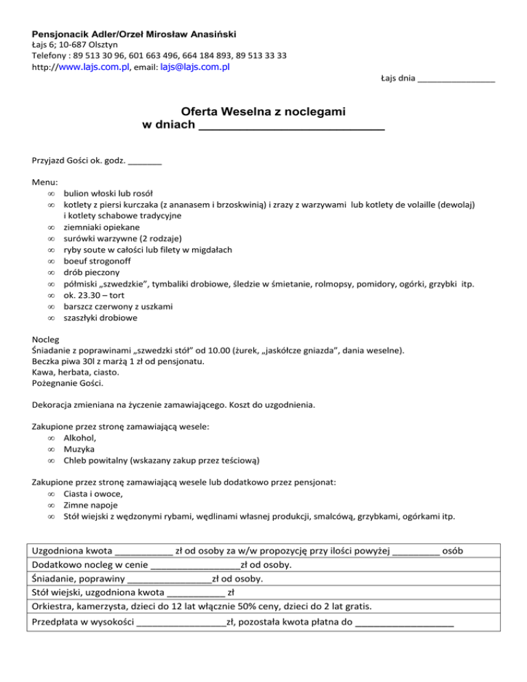 Pensjonacik Adler/Orzeł Mirosław Anasiński Łajs 6; 10-687 Olsztyn Telefony : 89 513 30 96, 601 663 496, 664 184 893, 89 513 33 33 http://www.lajs.com.pl, email: [email protected] Łajs dnia ________________ Oferta Weselna z noclegami w dniach ___________________________ Przyjazd Gości ok. godz. _______ Menu: • bulion włoski lub rosół • kotlety z piersi kurczaka (z ananasem i brzoskwinią) i zrazy z warzywami lub kotlety de volaille (dewolaj) i kotlety schabowe tradycyjne • ziemniaki opiekane • surówki warzywne (2 rodzaje) • ryby soute w całości lub filety w migdałach • boeuf strogonoff • drób pieczony • półmiski „szwedzkie”, tymbaliki drobiowe, śledzie w śmietanie, rolmopsy, pomidory, ogórki, grzybki itp. • ok. 23.30 – tort • barszcz czerwony z uszkami • szaszłyki drobiowe Nocleg Śniadanie z poprawinami „szwedzki stół” od 10.00 (żurek, „jaskółcze gniazda”, dania weselne). Beczka piwa 30l z marżą 1 zł od pensjonatu. Kawa, herbata, ciasto. Pożegnanie Gości. Dekoracja zmieniana na życzenie zamawiającego. Koszt do uzgodnienia. Zakupione przez stronę zamawiającą wesele: • Alkohol, • Muzyka • Chleb powitalny (wskazany zakup przez teściową) Zakupione przez stronę zamawiającą wesele lub dodatkowo przez pensjonat: • Ciasta i owoce, • Zimne napoje • Stół wiejski z wędzonymi rybami, wędlinami własnej produkcji, smalcówą, grzybkami, ogórkami itp. Uzgodniona kwota ___________ zł od osoby za w/w propozycję przy ilości powyżej _________ osób Dodatkowo nocleg w cenie _________________zł od osoby. Śniadanie, poprawiny ________________zł od osoby. Stół wiejski, uzgodniona kwota ___________ zł Orkiestra, kamerzysta, dzieci do 12 lat włącznie 50% ceny, dzieci do 2 lat gratis. Przedpłata w wysokości _________________zł, pozostała kwota płatna do ________________