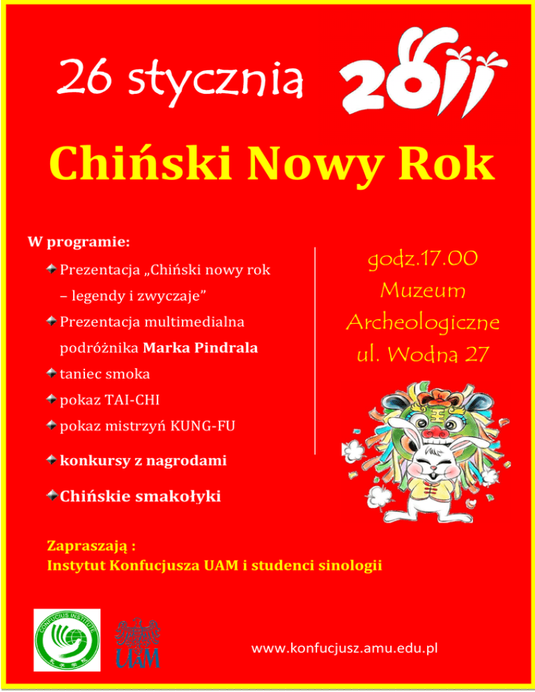 26 stycznia Chiński Nowy Rok W programie: Prezentacja „Chiński nowy rok Muzeum Archeologiczne – legendy i zwyczaje” Prezentacja multimedialna podróżnika Marka Pindrala taniec smoka godz.17.00 ul. Wodna 27 pokaz TAI-CHI pokaz mistrzyń KUNG-FU konkursy z nagrodami Chińskie smakołyki Zapraszają : Instytut Konfucjusza UAM i studenci sinologii www.konfucjusz.amu.edu.pl
