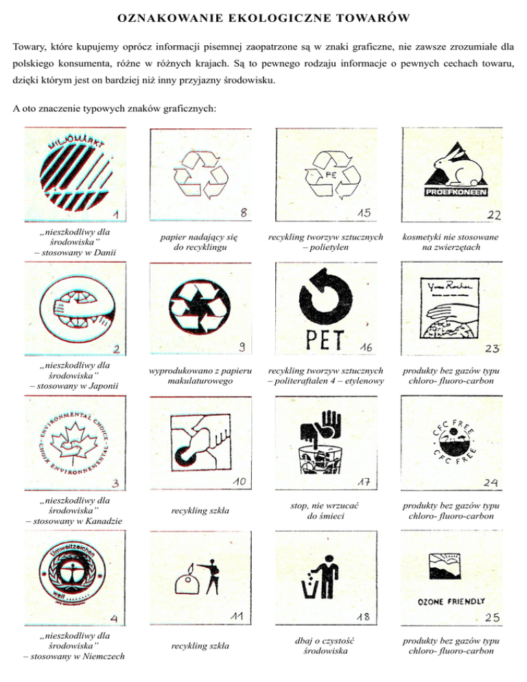 OZNAKOWANIE EKOLOGICZNE TOWARÓW Towary, które kupujemy oprócz informacji pisemnej zaopatrzone są w znaki graficzne, nie zawsze zrozumiałe dla polskiego konsumenta, różne w różnych krajach. Są to pewnego rodzaju informacje o pewnych cechach towaru, dzięki którym jest on bardziej niż inny przyjazny środowisku. A oto znaczenie typowych znaków graficznych: „nieszkodliwy dla środowiska” – stosowany w Danii papier nadający się do recyklingu recykling tworzyw sztucznych – polietylen kosmetyki nie stosowane na zwierzętach „nieszkodliwy dla środowiska” – stosowany w Japonii wyprodukowano z papieru makulaturowego recykling tworzyw sztucznych – politeraftalen 4 – etylenowy produkty bez gazów typu chloro- fluoro-carbon „nieszkodliwy dla środowiska” – stosowany w Kanadzie recykling szkła stop, nie wrzucać do śmieci produkty bez gazów typu chloro- fluoro-carbon „nieszkodliwy dla środowiska” – stosowany w Niemczech recykling szkła dbaj o czystość środowiska produkty bez gazów typu chloro- fluoro-carbon „nieszkodliwy dla środowiska” – stosowany w Austrii „żywność wysokiej jakości”, tzn. żywność ekologiczna recykling oleju recykling aluminium dbaj o czystość środowiska farba ekologiczna recykling aluminium obowiązek ponownego wykorzystania opakowania przez producenta symbole nadawane towarom przez firmy dlatego, że konsumenci chętniej kupują towary oznakowane „zielonym znakiem” dozwolony kontakt z żywnością symbole nadawane towarom przez firmy dlatego, że konsumenci chętniej kupują towary oznakowane „zielonym znakiem” recykling stali Niezależnie od naszej rzeczywistości i różnorodności barier konsument wyczulany jest przez oznakowanie towaru na sprawy środowiska. Znając poszczególne znaki ma on możliwość przyjąć właściwą postawę charakterystyczną dla tzw. „zielonego konsumenta” – przyjaznego dla środowiska naturalnego. Opracowała: Beata Szepieniec
