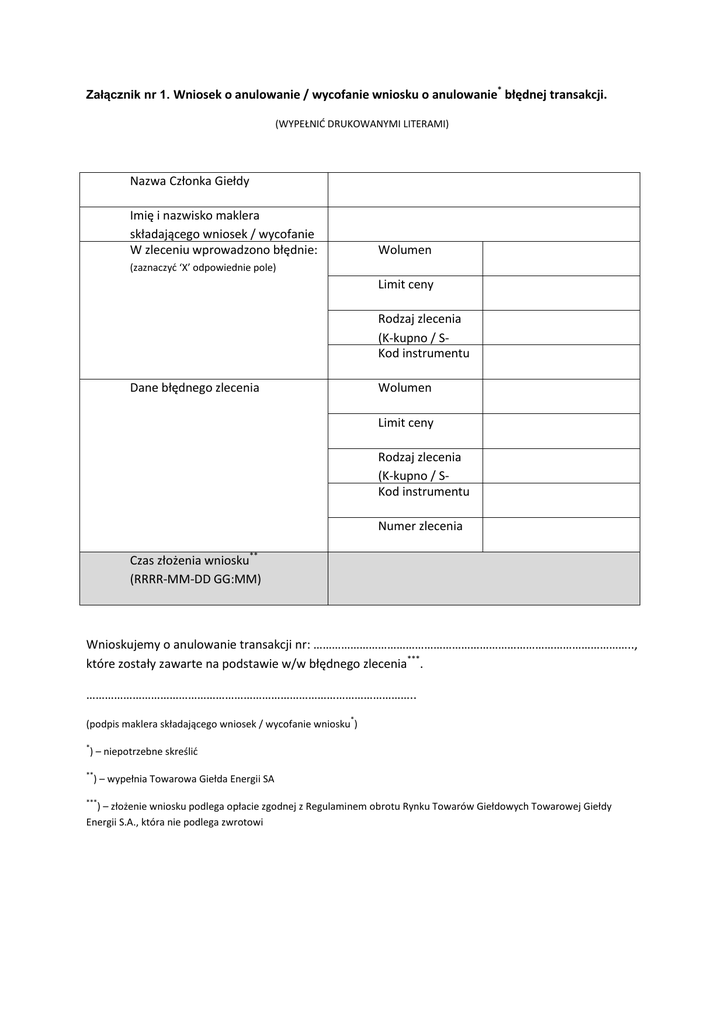 * Załącznik nr 1. Wniosek o anulowanie / wycofanie wniosku o anulowanie błędnej transakcji. (WYPEŁNIĆ DRUKOWANYMI LITERAMI) Nazwa Członka Giełdy Imię i nazwisko maklera składającego wniosek / wycofanie * W zleceniu wprowadzono błędnie: wniosku Wolumen (zaznaczyć ‘X’ odpowiednie pole) Limit ceny Rodzaj zlecenia (K-kupno / SKod instrumentu sprzedaż) Dane błędnego zlecenia Wolumen Limit ceny Rodzaj zlecenia (K-kupno / SKod instrumentu sprzedaż) Numer zlecenia Czas złożenia wniosku** (RRRR-MM-DD GG:MM) Wnioskujemy o anulowanie transakcji nr: ………………………………………………………………………………………….., które zostały zawarte na podstawie w/w błędnego zlecenia***. …………………………………………………………………………………………….. * (podpis maklera składającego wniosek / wycofanie wniosku ) * ) – niepotrzebne skreślić ** ) – wypełnia Towarowa Giełda Energii SA *** ) – złożenie wniosku podlega opłacie zgodnej z Regulaminem obrotu Rynku Towarów Giełdowych Towarowej Giełdy Energii S.A., która nie podlega zwrotowi