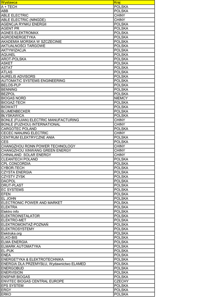 Wystawca A + TECH ABB ABLE ELECTRIC ABLE ELECTRIC (NINGDE) AGENCJA RYNKU ENERGII AGENT PR AGNES ELEKTROMAX AGROENERGETYKA AKADEMIA MORSKA W SZCZECINIE AKTUALNOŚCI TARGOWE AKTYWIZACJA AQUAEL AROT-POLSKA ASKET ASTAT ATLAS AURELIS ADVISORS AUTOMATIC SYSTEMS ENGINEERING BELOS-PLP BENNING BEZPOL BIOGAS NORD BIOGAZ-TECH BIOWATT BLUMENBECKER BŁYSKAWICA BONLE (FUJIAN) ELECTRIC MANUFACTURING BONLE (FUZHOU) INTERNATIONAL CARGOTEC POLAND CECEC NANJING ELECTRIC CENTRUM ELEKTRYCZNE ANIA CES CHANGZHOU RONN POWER TECHNOLOGY CHANGZHOU XINWANG GREEN ENERGY CHINALAND SOLAR ENERGY CLEANTECH POLAND CPL CONCORDIA CYBOR-TECH CZYSTA ENERGIA CZYSTY ZYSK DACPOL DRUT-PLAST EC SYSTEMS EFEN EL JOHN ELECTRONIC POWER AND MARKET ELEKTRA Elektro info ELEKTROINSTALATOR ELEKTRO-MET ELEKTROMONTAś-POZNAŃ ELEKTROSYSTEMY Elektryka.org ELKO-BIS ELMA ENERGIA ELMARK AUTOMATYKA EL-PUK ENEA ENERGETYKA & ELEKTROTECHNIKA ENERGIA DLA PRZEMYSŁU, Wydawnictwo ELAMED ENERGOBUD ENERVISION ENSPAR BIOGAS ENVITEC BIOGAS CENTRAL EUROPE EPS SYSTEM ERGY ERKO Kraj POLSKA POLSKA CHINY CHINY POLSKA POLSKA POLSKA POLSKA POLSKA POLSKA POLSKA POLSKA POLSKA POLSKA POLSKA POLSKA POLSKA POLSKA POLSKA POLSKA POLSKA NIEMCY POLSKA POLSKA POLSKA POLSKA CHINY CHINY POLSKA CHINY POLSKA POLSKA CHINY CHINY CHINY POLSKA POLSKA POLSKA POLSKA POLSKA POLSKA POLSKA POLSKA POLSKA POLSKA POLSKA POLSKA POLSKA POLSKA POLSKA POLSKA POLSKA POLSKA POLSKA POLSKA POLSKA POLSKA POLSKA POLSKA POLSKA POLSKA POLSKA POLSKA CZECHY POLSKA POLSKA POLSKA EURO COM PROJECT EUROTRONIC FACHOWY ELEKTRYK FIRE-COM FIRMA HANDLOWA GRAśYNA I SŁAWOMIR ZGUBIŃSCY FIRST FUNDS PHOTOVOLTAICS FOTOWOLTAIKA FreeLight Polska FRONIUS INTERNATIONAL FUJIAN HUATAI POWER SUPPLY FUJIAN MINQING HAOYE CERAMICS FUJIAN MINQING JUNXIN ELECTRICAL APPLIANCE FUJIAN MINTAI TECHNOLOGY DEVELOPMENT FUJIAN ZHONGJI MACHINERY & ELECTRIC EQUIPMENT FUTURE B FUZHOU GUANGHONG ELECTRONIC CERAMICS FUZHOU RONG XING LIGHTING GALMAR MARCINIAK GAO SHENG TRANSMISSION GAZEX GB CONSULTING GEBRUDER PETERS POLSKA GEO POLSKA GEOSYSTEM GOODWE SOLAR INVERTER GRAMATOWSCY KANCELARIA PRAWNA greenNet Doradcy GROMAR GS ENERGY EUROPE DISTRIBUTION H. CEGIELSKI HAGER POLO HAUFF-TECHNIK HMF POLSKA HOPPECKE BATERIE HYMON ENERGY INEXIM INSTYTUT AUTOMATYKI SYSTEMÓW ENERGETYCZNYCH INSTYTUT ENERGETYK - BIAŁYSTOK INSTYTUT ENERGETYKI ZAKŁAD IZOLACJI POZNAŃ INSTYTUT TELE- I RADIOTECHNICZNY INTELIGENTNY BUDYNEK IZBA GOSPODARCZA ENERGETYKI I OCHRONY ŚRODOWISKA POLSKA POLSKA POLSKA POLSKA POLSKA NIEMCY POLSKA POLSKA AUSTRIA CHINY CHINY CHINY CHINY CHINY POLSKA CHINY CHINY POLSKA CHINY POLSKA CZECHY POLSKA POLSKA POLSKA CHINY POLSKA POLSKA NIEMCY CZECHY POLSKA POLSKA NIEMCY POLSKA POLSKA POLSKA POLSKA POLSKA POLSKA POLSKA POLSKA POLSKA POLSKA JEAN MUELLER POLSKA JIAXING DIYI NEW ENERNGY JOKA KARLA KIEV RENT KOPOS ELEKTRO PL KPB INTRA POLSKA KRANNICH SOLAR LED-POL LENA LIGHTING LOPI LUMEN TECHNIK MEDIUM GRUPA MERAZET MGS Nauka MIKRONIKA Badawczo-Rozwojowa Spółdzielnia Pracy Mikroprocesorowych Systemów Automatyki MM Magazyn Przemysłowy MODERN HST MT-ENERGIE POLSKA NAPĘDY I STEROWANIE NEXANS POWER ACCESORIES POLAND NINGBO QIXIN SOLAR ELECTRICAL APPLIANCE NINGBO ULICA SOLAR SCIENCE & TECHNOLOGY NOARK ELECTRIC POLSKA CHINY POLSKA CZECHY POLSKA POLSKA POLSKA CZECHY POLSKA POLSKA POLSKA POLSKA POLSKA POLSKA POLSKA POLSKA POLSKA POLSKA POLSKA POLSKA POLSKA CHINY CHINY POLSKA NOWA ENERGIA OBERHAUSER SOLAR - BEFESTIGUNGSSYSTEME OMICRON ELECTRONICS OMNIK NEW ENERGY OPA - LABOR OŚWIETLENIE LED OTTE OZNACZ.PL PAS Centrum Zaopatrzenia Energetyki PASTUSZKO PBE ELBUD POZNAŃ PGE – POMORSKA GRUPA ENERGETYCZNA PHOENIX CONTACT PHONO SOLAR TECHNOLOGY PIXEL POLCONTACT POLITECHNIKA POZNAŃSKA Polska Izba Gospodarcza Elektrotechniki POLSKA IZBA GOSPODARCZA ENERGII ODNAWIALNEJ POLSKA IZBA PRODUCENTÓW URZĄDZEŃ I USŁUG NA RZECZ POLSKIE TOWARZYSTWO FOTOWOLTAIKI POLSKIE TOWARZYSTWO PRZESYŁU I ROZDZIAŁU ENERGII PRECIZ PROFICOOL FANS PROJEKT - SOLARTECHNIK POLSKA PROJPRZEM-EKO PROTEKTEL PRO-WELLNESS PRUFTECHNIK - WIBREM PRZEMYSŁOWY INSTYTUT MASZYN ROLNICZYCH Q3 ENERGIEELEKTRONIK QINGDAO W&G INTERNATIONAL RADVILISKIS MACHINE FACTORY RELPOL REMOR RICHTER SOLAR ROSA RYNEK ELEKTRYCZNY RYNEK INSTALACYJNY SABAJ SYSTEM SELFA SEMICON SEP BIURO BADAWCZE DS. JAKOŚCI SEP CENTRALNY OŚRODEK SZKOLENIA I WYDAWNICTW SEP-ZARZĄD GŁÓWNY SHANDONG TAIKAI POWER ENGINEERING SHANGHAI INTERNATIONAL ADVERTISING AND EXHIBITION SHENZHEN GROWATT NEW ENERGY TECHNOLOGY SHENZHEN SUOYANG NEW ENERGY SIBA POLSKA SKYBASESOLAR SLAVITECH SMA CENTRAL & EASTERN EUROPE SOFC POWER SOLAR SYSTEMS STIENS POLAND SOLAR WORLD SOLERA KOBUS SOLSUM SPOTLINE STELEN STOWARZYSZENIE ELEKTRYKÓW POLSKICH STOWARZYSZENIE ELEKTRYKÓW POLSKICH OŚRODEK STRUNOBET-MIGACZ SUN ELECTRO SUN TECHNIK SUNPARK POLSKA SYLWAN T&T PROENERGY POLSKA NIEMCY AUSTRIA CHINY POLSKA POLSKA TURCJA POLSKA POLSKA POLSKA POLSKA POLSKA POLSKA CHINY POLSKA POLSKA POLSKA POLSKA POLSKA POLSKA POLSKA POLSKA CZECHY POLSKA POLSKA POLSKA POLSKA POLSKA POLSKA POLSKA NIEMCY CHINY LITWA POLSKA POLSKA NIEMCY POLSKA POLSKA POLSKA POLSKA POLSKA POLSKA POLSKA POLSKA POLSKA CHINY CHINY CHINY CHINY POLSKA NIEMCY POLSKA CZECHY WŁOCHY NIEMCY NIEMCY POLSKA POLSKA POLSKA POLSKA POLSKA POLSKA POLSKA POLSKA POLSKA POLSKA POLSKA POLSKA TAIAN JIAHUA ELECTRIC POWER EQUIPMENT TAVRIDA ELECTRIC POLSKA TERRAEXIM - AGROIMPEX THE SOLARCOMPANY TIM TIME-NET TOWARZYSTWO ELEKTROWNI WODNYCH TOWARZYSTWO ROZWOJU MAŁYCH ELEKTROWNI WODNYCH URZĄDZENIA DLA ENERGETYKI VERTIGO GREEN ENERGY WAEL-bis WAGNER & CO SOLARTECHNIK WAGO ELWAG WEISS WENZHOU BENYI ELECTRICAL WENZHOU KORLEN ELECTRIC APPLIANCES WIELKOPOLSKIE BIURO PROJEKTÓW WIRSOL SOLAR SYSTEM WMI KŁYK WOBIT www.energoelektronika.pl xtech.pl Serwisy branŜowe ZHEJIANG SUNFLOWER LIGHT ENERGY SCIENCE & ZHONGLI TALESUN SOLAR ZIRCON POLAND ZNSHINE PV LIGHTING ZPUE/Grupa KORONEA ZWAE - ZAKŁAD WYTWÓRCZY APARATÓW ELEKTRYCZNYCH ZWARPOL stan na dzień 8.05.2013r. CHINY POLSKA POLSKA POLSKA POLSKA POLSKA POLSKA POLSKA POLSKA POLSKA P