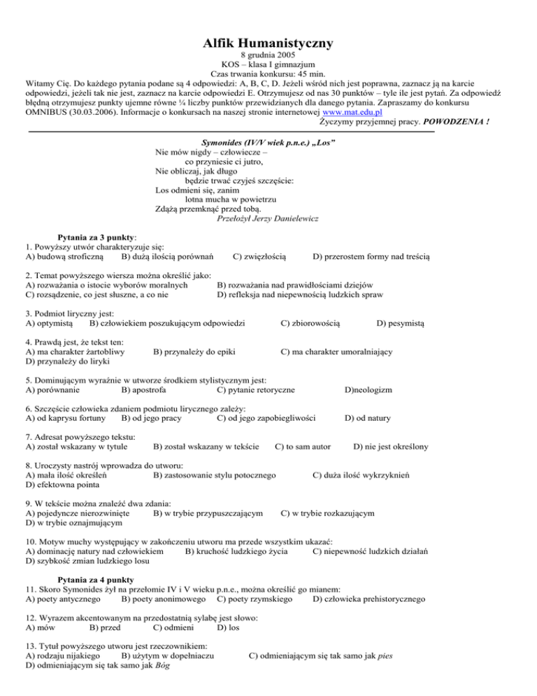 Alfik Humanistyczny 8 grudnia 2005 KOS – klasa I gimnazjum Czas trwania konkursu: 45 min. Witamy Cię. Do każdego pytania podane są 4 odpowiedzi: A, B, C, D. Jeżeli wśród nich jest poprawna, zaznacz ją na karcie odpowiedzi, jeżeli tak nie jest, zaznacz na karcie odpowiedzi E. Otrzymujesz od nas 30 punktów – tyle ile jest pytań. Za odpowiedź błędną otrzymujesz punkty ujemne równe ¼ liczby punktów przewidzianych dla danego pytania. Zapraszamy do konkursu OMNIBUS (30.03.2006). Informacje o konkursach na naszej stronie internetowej www.mat.edu.pl Życzymy przyjemnej pracy. POWODZENIA ! Symonides (IV/V wiek p.n.e.) „Los” Nie mów nigdy – człowiecze – co przyniesie ci jutro, Nie obliczaj, jak długo będzie trwać czyjeś szczęście: Los odmieni się, zanim lotna mucha w powietrzu Zdążą przemknąć przed tobą. Przełożył Jerzy Danielewicz Pytania za 3 punkty: 1. Powyższy utwór charakteryzuje się: A) budową stroficzną B) dużą ilością porównań C) zwięzłością D) przerostem formy nad treścią 2. Temat powyższego wiersza można określić jako: A) rozważania o istocie wyborów moralnych B) rozważania nad prawidłościami dziejów C) rozsądzenie, co jest słuszne, a co nie D) refleksja nad niepewnością ludzkich spraw 3. Podmiot liryczny jest: A) optymistą B) człowiekiem poszukującym odpowiedzi C) zbiorowością 4. Prawdą jest, że tekst ten: A) ma charakter żartobliwy D) przynależy do liryki C) ma charakter umoralniający B) przynależy do epiki D) pesymistą 5. Dominującym wyraźnie w utworze środkiem stylistycznym jest: A) porównanie B) apostrofa C) pytanie retoryczne D)neologizm 6. Szczęście człowieka zdaniem podmiotu lirycznego zależy: A) od kaprysu fortuny B) od jego pracy C) od jego zapobiegliwości D) od natury 7. Adresat powyższego tekstu: A) został wskazany w tytule B) został wskazany w tekście C) to sam autor 8. Uroczysty nastrój wprowadza do utworu: A) mała ilość określeń B) zastosowanie stylu potocznego D) efektowna pointa 9. W tekście można znaleźć dwa zdania: A) pojedyncze nierozwinięte B) w trybie przypuszczającym D) w trybie oznajmującym D) nie jest określony C) duża ilość wykrzyknień C) w trybie rozkazującym 10. Motyw muchy występujący w zakończeniu utworu ma przede wszystkim ukazać: A) dominację natury nad człowiekiem B) kruchość ludzkiego życia C) niepewność ludzkich działań D) szybkość zmian ludzkiego losu Pytania za 4 punkty 11. Skoro Symonides żył na przełomie IV i V wieku p.n.e., można określić go mianem: A) poety antycznego B) poety anonimowego C) poety rzymskiego D) człowieka prehistorycznego 12. Wyrazem akcentowanym na przedostatnią sylabę jest słowo: A) mów B) przed C) odmieni D) los 13. Tytuł powyższego utworu jest rzeczownikiem: A) rodzaju nijakiego B) użytym w dopełniaczu D) odmieniającym się tak samo jak Bóg C) odmieniającym się tak samo jak pies 14. Wszystkie czasowniki w utworze: A) mają formę trybu rozkazującego D) są w liczbie pojedynczej 15. Długo to : A) przysłówek w stopniu wyższym C) przysłówek w stopniu równym 16. Przyimkiem nie jest: A) w B) przed B) są nieprzechodnie C) są w czasie teraźniejszym B) przymiotnik w stopniu równym D) przymiotnik w stopniu wyższym C) nigdy D) nad 17. Użycie przez tłumacza dawnej formy człowiecze ma: A) uwspółcześnić tekst B) dodać powagi wypowiedzi D) pomóc podmiotowi utożsamić się z czytelnikiem 18. Wyraz lotna w ostatnim zdaniu tekstu jest: A) dopełnieniem bliższym B) przydawką 19. W tekście powyższym nie użyto: A) czasowników w formie nieosobowej C) nadać wierszowi specyficzny rytm D) dopełnieniem dalszym C) okolicznikiem B) rzeczowników nieżywotnych C) zaimków D) partykuł 20. Na podstawie analizy form językowych, można powiedzieć, że podmiot przemawia do odbiorcy z pozycji: A) kogoś o takiej samej wiedzy i doświadczeniu B) nauczyciela – mistrza C) agitatora D) kogoś mniej świadomego Janusz Roszkowski „Fatalny spacer...”(fragment) „Atakując we wrześniu 1939 r. Polskę, Niemcy wyznaczyli sobie nie tylko cele militarne na polach bitewnych. Niezmiernie ważne było dla nich przechwycenie dokumentacji wywiadu polskiego, czyli II Oddziału Sztabu Głównego Wojska Polskiego, osławionej „dwójki”, który skutecznie penetrował III Rzeszę, dysponując na jej obszarze sprawnie funkcjonującą siecią swoich agentów. Nazistami nie kierowała przy tym wyłącznie chęć zemsty – zdawali sobie sprawę, że nawet po pokonaniu Polski jej agenci mogą dalej służyć wrogom Rzeszy, czyli wywiadom sojuszników RP. A że sprawa nie była łatwa, dowiodło doświadczenie Czechosłowackie – kiedy w marcu 1939 r. Wehrmacht wkraczał do Czech i Moraw, wywiadowi czechosłowackiemu udało się mimo zaskoczenia przerzucić drogą lotniczą swoje dokumenty do Anglii. Tym razem we wrześniu hitlerowcy postanowili działać bardziej precyzyjnie i skutecznie: stworzyli mianowicie kilkunastoosobowe grupy oficerów Abwehry, specjalistów w zakresie wywiadu i kontrwywiadu, którzy wszędzie tam, gdzie były zlokalizowane przez Niemców placówki naszych służb specjalnych, wdzierali się z jednostkami bojowymi pierwszej linii, zabezpieczając natychmiast wszelkie dokumenty. W Bydgoszczy taka grupa błyskawicznie zajęła pomieszczenia III Ekspozytury II Oddziału kierowanej przez oficera niezmiernie skutecznego w filtrowaniu wywiadowczym państwa Hitlera, osławionego mjr. Jana Żychonia. I co tam zastano? Idealną pustkę. Ani kartki papieru, nie mówiąc o dokumentach. Jedynie na biurku samego szefa leżała wizytówka Jana Żychonia – szydercze powitanie wrogów... W Warszawie było podobnie” Przegląd, 28 września 2005 r. Pytania za 5 punktów 21. Z tekstu powyższego można się dowiedzieć, że tzw. „dwójka” była: A) polskim kontrwywiadem B) siatką agentów na terenie III Rzeszy D) dokumentacją polskiego wywiadu 22. Z powyższego tekstu wyni