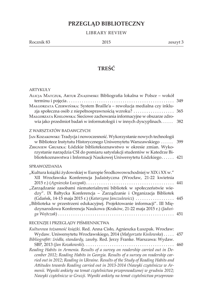 PRZEGLĄD BIBLIOTECZNY LIBRARY REVIEW Rocznik 83 2015 zeszyt 3 TREŚĆ ARTYKUŁY Alicja Matczuk, Artur Znajomski: Bibliografia lokalna w Polsce – wokół terminu i pojęcia . . . . . . . . . . . . . . . . . . . . . . . . . . . . . . . . . . . . . . . . . . . . . . . . . 349 Małgorzata Czerwińska: System Braille’a – rewolucja medialna czy inkluzja społeczna osób z niepełnosprawnością wzroku? . . . . . . . . . . . . . . . . . . 365 Małgorzata Kisilowska: Sieciowe zachowania informacyjne w obszarze zdrowia jako przedmiot badań w informatologii i w innych dyscyplinach . . . . . . 382 Z WARSZTATÓW BADAWCZYCH Jan Kozakowski: Tradycja i nowoczesność. Wykorzystanie nowych technologii w Bibliotece Instytutu Historycznego Uniwersytetu Warszawskiego . . . . . . . 399 Zbigniew Gruszka: Łódzkie bibliotekoznawstwo w okresie zmian. Wykorzystanie narzędzia CSI do pomiaru satysfakcji studentów w Katedrze Bibliotekoznawstwa i Informacji Naukowej Uniwersytetu Łódzkiego . . . . . 421 SPRAWOZDANIA „Kultura książki żydowskiej w Europie Środkowowschodniej w XIX i XX w.” XII Wrocławska Konferencja Judaistyczna (Wrocław, 21-22 kwietnia 2015 r.) (Agnieszka Łuszpak) . . . . . . . . . . . . . . . . . . . . . . . . . . . . . . . . . . . . . . . . 441 „Zarządzanie zasobami niematerialnymi bibliotek w społeczeństwie wiedzy”. IX Bałtycka Konferencja – Zarządzanie i Organizacja Bibliotek (Gdańsk, 14-15 maja 2015 r.) (Katarzyna Janczulewicz) . . . . . . . . . . . . . . . . . . 445 „Biblioteka w przestrzeni edukacyjnej. Projektowanie informacji”. III Międzynarodowa Konferencja Naukowa (Kraków, 21-22 maja 2015 r.) (Jadwiga Wojtczak) . . . . . . . . . . . . . . . . . . . . . . . . . . . . . . . . . . . . . . . . . . . . . . . . . . . . . . 451 RECENZJE I PRZEGLĄDY PIŚMIENNICTWA Kulturowa tożsamość książki. Red. Anna Cisło, Agnieszka Łuszpak. Wrocław: Wydaw. Uniwersytetu Wrocławskiego, 2014 (Małgorzata Kisilowska) . . . . 457 Bibliografi@: źródła, standardy, zasoby. Red. Jerzy Franke. Warszawa: Wydaw. SBP, 2013 (Jan Kozakowski) . . . . . . . . . . . . . . . . . . . . . . . . . . . . . . . . . . . . . . . . . 460 Reading Habits in Armenia. Results of a survey on readership carried out in December 2012; Reading Habits in Georgia. Results of a survey on readership carried out in 2012; Reading in Ukraine. Results of the Study of Reading Habits and Attitudes towards Reading carried out in 2013-2014 (Nawyki czytelnicze w Armenii. Wyniki ankiety na temat czytelnictwa przeprowadzonej w grudniu 2012; Nawyki czytelnicze w Gruzji. Wyniki ankiety na temat czytelnictwa przeprowa- S P I S T R E ŚC I dzonej w 2012; Czytelnictwo na Ukrainie. Wyniki ankiety na temat czytelnictwa przeprowadzonej w latach 2013-2014) (Bogumiła Staniów) . . . . . . . . . . . . . . . . . 463 Przegląd piśmiennictwa krajowego (Barbara Koryś) . . . . . . . . . . . . . . . . . . . . . . 465 Z lektur zagranicznych (Jacek Wojciechowski) . . . . . . . . . . . . . . . . . . . . . . . . . . . . 470 Z ŻYCIA SBP. . . . . . . . . . . . . . . . . . . . . . . . . . . . . . . . . . . . . . . . . . . . . . . . . . . . . . . . . 485 KOMUNIKATY Nagroda Naukowa SBP im. Adama Łysakowskiego za rok 2014 (Jadwiga Sadowska) . . . . . . . . . . . . . . . . . . . . . . . . . . . . . . . . . . . . . . . . . . . . . . . . . . . . . . . . . . 493 II edycja Olimpiady Bibliologicznej i Informatologicznej. Sprawozdanie z realizacji (Mariola Antczak) . . . . . . . . . . . . . . . . . . . . . . . . . . . . . . . . . . . . . . . . . . . 494 Z ŻAŁOBNEJ KARTY Barbara Eychler (1930-2015) (Alina Nowińska) . . . . . . . . . . . . . . . . . . . . . . . . . . . 497 WSKAZÓWKI DLA AUTORÓW . . . . . . . . . . . . . . . . . . . . . . . . . . . . . . . . . . . . . . . . . 503 ALICJA MATCZUK Instytut Informacji Naukowej i Bibliotekoznawstwa UMCS w Lublinie e-mail: [email protected] ARTUR ZNAJOMSKI Instytut Informacji Naukowej i Bibliotekoznawstwa UMCS w Lublinie e-mail: [email protected] BIBLIOGRAFIA LOKALNA W POLSCE – WOKÓŁ TERMINU I POJĘCIA Dr hab. Alicja Matczuk pracuje w Instytucie Informacji Naukowej i Bibliotekoznawstwa UMCS w Lublinie. Jej zainteresowania badawcze skupiają się na historii, teorii i metodyce polskich bibliografii specjalnych, w szczególności bibliografii dziedzinowej i regionalnej. Ważniejsze publikacje: Polskie bibliografie nauk humanistyczno-społecznych do roku 1989. Historia i metodyka (Lublin, 2014), Rozwój metodyczny polskich bibliografii historycznych regionalnych (1994). Bibliografia specjalna. Historia i zakres pojęcia. W: Bibliografia: teoria, praktyka, dydaktyka. Red. J. Woźniak-Kasperek, M. Ochmański (Warszawa, 2009). Jest autorką, współautorką i redaktorką wielu opracowań bibliograficznych, m.in. Bibliografii publikacji pracowników Zakładu Nauk Pomocniczych Historii i Bibliotekoznawstwa UMCS i wykazu prac habilitacyjnych, doktorskich i magisterskich wykonanych w latach 1977-2003. (Lublin, 2007), Bibliografii miasta Stalowej Woli za lata 1989-2012 (współaut. Bernadeta Burdzy, Stalowa Wola, 2012), Bibliografii publikacji pracowników Państwowego Muzeum na Majdanku (współaut. Tomasz Kranz, Lublin, 2004). Dr Artur Znajomski pracuje w Instytucie Informacji Naukowej i Bibliotekoznawstwa UMCS w Lublinie. Główny nurt jego zainteresowań badawczych to zagadnienia bibliografii osobowych i bibliografii lokalnych w Polsce. Ważniejsze publikacje: Bibliografie osobowe historyków polskich (Lublin, 2004), Bibliografie zespołów osobowych ‒ instytucji, stan i potrzeby. W: Bibliografia: teoria, praktyka, dydaktyka. Red. J. Woźniak-Kasperek, M. Ochmański (Warszawa, 2009); Wpływ lwowskiego środowiska historycznego na rozwój metodyki bibliografii osobowej do roku 1939. W: Wielokulturowe środowisko historyczne Lwowa w XIX i XX w. T. 5. Red. J. Maternicki i L. Zaszkilniak (Rzeszów, 2007); Bibliografie specjalne – tendencje rozwoju na przykładzie bibliografii osobowych. W: Pi