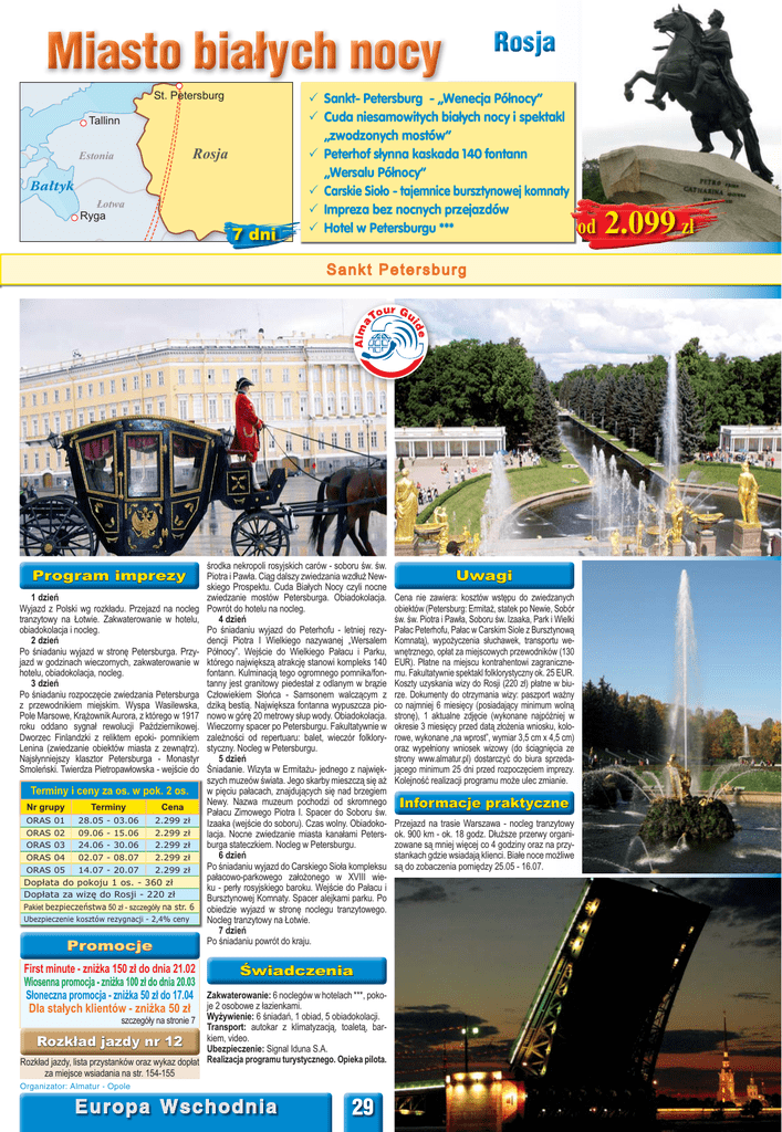 Miasto białych nocy St. Petersburg Tallinn Rosja Estonia Bałtyk Łotwa Ryga 7 dni Sankt- Petersburg - „Wenecja Północy” Cuda niesamowitych białych nocy i spektakl „zwodzonych mostów” Peterhof słynna kaskada 140 fontann „Wersalu Północy” Carskie Sioło - tajemnice bursztynowej komnaty Impreza bez nocnych przejazdów Hotel w Petersburgu *** Sankt Petersburg Program imprezy 1 dzień Wyjazd z Polski wg rozkładu. Przejazd na nocleg tranzytowy na Łotwie. Zakwaterowanie w hotelu, obiadokolacja i nocleg. 2 dzień Po śniadaniu wyjazd w stronę Petersburga. Przyjazd w godzinach wieczornych, zakwaterowanie w hotelu, obiadokolacja, nocleg. 3 dzień Po śniadaniu rozpoczęcie zwiedzania Petersburga z przewodnikiem miejskim. Wyspa Wasilewska, Pole Marsowe, Krążownik Aurora, z którego w 1917 roku oddano sygnał rewolucji Październikowej. Dworzec Finlandzki z reliktem epoki- pomnikiem Lenina (zwiedzanie obiektów miasta z zewnątrz). Najsłynniejszy klasztor Petersburga - Monastyr Smoleński. Twierdza Pietropawłowska - wejście do Terminy i ceny za os. w pok. 2 os. Nr grupy Terminy Cena ORAS 01 28.05 - 03.06 2.299 zł ORAS 02 09.06 - 15.06 2.299 zł ORAS 03 24.06 - 30.06 2.299 zł ORAS 04 02.07 - 08.07 2.299 zł ORAS 05 14.07 - 20.07 2.299 zł Dopłata do pokoju 1 os. - 360 zł Dopłata za wizę do Rosji - 220 zł Pakiet bezpieczeństwa 50 zł - szczegóły na str. 6 Ubezpieczenie kosztów rezygnacji - 2,4% ceny Promocje środka nekropoli rosyjskich carów - soboru św. św. Piotra i Pawła. Ciąg dalszy zwiedzania wzdłuż Newskiego Prospektu. Cuda Białych Nocy czyli nocne zwiedzanie mostów Petersburga. Obiadokolacja. Powrót do hotelu na nocleg. 4 dzień Po śniadaniu wyjazd do Peterhofu - letniej rezydencji Piotra I Wielkiego nazywanej „Wersalem Północy”. Wejście do Wielkiego Pałacu i Parku, którego największą atrakcję stanowi kompleks 140 fontann. Kulminacją tego ogromnego pomnika/fontanny jest granitowy piedestał z odlanym w brązie Człowiekiem Słońca - Samsonem walczącym z dziką bestią. Największa fontanna wypuszcza pionowo w górę 20 metrowy słup wody. Obiadokolacja. Wieczorny spacer po Petersburgu. Fakultatywnie w zależności od repertuaru: balet, wieczór folklorystyczny. Nocleg w Petersburgu. 5 dzień Śniadanie. Wizyta w Ermitażu- jednego z największych muzeów świata. Jego skarby mieszczą się aż w pięciu pałacach, znajdujących się nad brzegiem Newy. Nazwa muzeum pochodzi od skromnego Pałacu Zimowego Piotra I. Spacer do Soboru św. Izaaka (wejście do soboru). Czas wolny. Obiadokolacja. Nocne zwiedzanie miasta kanałami Petersburga stateczkiem. Nocleg w Petersburgu. 6 dzień Po śniadaniu wyjazd do Carskiego Sioła kompleksu pałacowo-parkowego założonego w XVIII wieku - perły rosyjskiego baroku. Wejście do Pałacu i Bursztynowej Komnaty. Spacer alejkami parku. Po obiedzie wyjazd w stronę noclegu tranzytowego. Nocleg tranzytowy na Łotwie. 7 dzień Po śniadaniu powrót do kraju. First minute - zniżka 150 zł do dnia 21.02 Świadczenia Wiosenna promocja - zniżka 100 zł do dnia 20.03 Słoneczna promocja - zniżka 50 zł do 17.04 Zakwaterowanie: 6 noclegów w hotelach ***, pokoDla stałych klientów - zniżka 50 zł je 2 osobowe z łazienkami. Wyżywienie: 6 śniadań, 1 obiad, 5 obiadokolacji. Transport: autokar z klimatyzacją, toaletą, barkiem, video. Rozkład jazdy nr 12 Ubezpieczenie: Signal Iduna S.A. Rozkład jazdy, lista przystanków oraz wykaz dopłat Realizacja programu turystycznego. Opieka pilota. za miejsce wsiadania na str. 154-155 szczegóły na stronie 7 Organizator: Almatur - Opole Europa Wschodnia 29 Uwagi Cena nie zawiera: kosztów wstępu do zwiedzanych obiektów (Petersburg: Ermitaż, statek po Newie, Sobór św. św. Piotra i Pawła, Soboru św. Izaaka, Park i Wielki Pałac Peterhofu, Pałac w Carskim Siole z Bursztynową Komnatą), wypożyczenia słuchawek, transportu wewnętrznego, opłat za miejscowych przewodników (130 EUR). Płatne na miejscu kontrahentowi zagranicznemu. Fakultatywnie spektakl folklorystyczny ok. 25 EUR. Koszty uzyskania wizy do Rosji (220 zł) płatne w biurze. Dokumenty do otrzymania wizy: paszport ważny co najmniej 6 miesięcy (posiadający minimum wolną stronę), 1 aktualne zdjęcie (wykonane najpóźniej w okresie 3 miesięcy przed datą złożenia wniosku, kolorowe, wykonane „na wprost”, wymiar 3,5 cm x 4,5 cm) oraz wypełniony wniosek wizowy (do ściągnięcia ze strony www.almatur.pl) dostarczyć do biura sprzedającego minimum 25 dni przed rozpoczęciem imprezy. Kolejność realizacji programu może ulec zmianie. Informacje praktyczne Przejazd na trasie Warszawa - nocleg tranzytowy ok. 900 km - ok. 18 godz. Dłuższe przerwy organizowane są mniej więcej co 4 godziny oraz na przystankach gdzie wsiadają klienci. Białe noce możliwe są do zobaczenia pomiędzy 25.05 - 16.07. od 2.099 zł