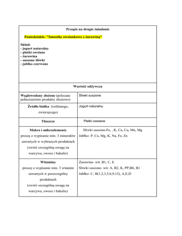 Przepis na drugie śniadanie Poniedziałek- "Smoothe owsiankowe z żurawiną" Skład: - jogurt naturalny - płatki owsiane - żurawina - suszone śliwki - jabłko czerwone Wartość odżywcza Węglowodany złożone (polecane pełnoziarniste produkty zbożowe) Źródło białka (roślinnego, Śliwki suszone Jogurt naturalny zwierzęcego) Tłuszcze Makro i mikroelementy Płatki owsiane Sliwki suszone-Fe, , K, Ca, Cu, Mn, Mg proszę o wypisanie min. 3 minerałów Jabłko- P, Ca, Mg, K, Na, Fe, Zn zawartych w wybranych produktach (zwróć szczególną uwagę na warzywa, owoce i bakalie) Witaminy proszę o wypisanie min. 3 witamin zawartych w poszczególny produktach (zwróć szczególną uwagę na warzywa, owoce i bakalie) Żurawina- wit. B1, C, E Sliwki suszone- wit. A, B2, K, PP,B6, B1 Jabłko- C, B(1,2,3,5,6,9,12), A,E,D Przepis na drugie śniadanie Środa- "Zielona bomba witaminowa" - pietruszka - kiwi - bazylia - mięta - łyżeczka miodu - mleko 3,2% - łyżeczka oleju lnianego Wartość odżywcza Węglowodany złożone (polecane pełnoziarniste produkty zbożowe) Źródło białka (roślinnego, Miód Mleko zwierzęcego) Tłuszcze Makro i mikroelementy Olej lniany Pietruszka-Fe, Ca, Mg, P proszę o wypisanie min. 3 minerałów Kiwi- K, Zn, Na zawartych w wybranych produktach (zwróć szczególną uwagę na Bazylia- Cu, Mn, Zn, Mg, Fe, Ca, P, K Mięta- Mn, Cu, Zn, K, Mg, Fe, Ca warzywa, owoce i bakalie) Witaminy proszę o wypisanie min. 3 witamin zawartych w poszczególny produktach (zwróć szczególną uwagę na warzywa, owoce i bakalie) Pietruszka- prowitamina A, wit. B1, B2, C Kiwi - C,E,B1 Bazylia- B1,B2, B5, B6, C, E, kwas foliowy Mięta- wit. z grupy B (1,2,5,6),C, kwas foliowy Przepis na drugie śniadanie Czwartek - "Wrap po polsku" - tortilla wieloziarnista - cebula czerwona - sałata zielona - marchewka - papryka czerwona - żółty ser - kukurydza Wartość odżywcza Węglowodany złożone (polecane pełnoziarniste produkty zbożowe) Źródło białka (roślinnego, Tortilla Ser żółty zwierzęcego) Tłuszcze Makro i mikroelementy Ser zółty Ser żółty- Ca, Zn, P proszę o wypisanie min. 3 minerałów Cebula czerwona- Na, K, Ca, Mn, Fe, Co, Cu, Zn, zawartych w wybranych produktach P, F, J (zwróć szczególną uwagę na Marchewka- Ca, K, Na, Fe, Cu, P, Mg, Zn, Co, warzywa, owoce i bakalie) Sałata- Na, K, Mg, Ca, Mn, Fe, Co, Cu, Zn, P, I Papryka czerwona- Ca, K, Fe, Mg Kukurydza- K, Na, Ca, Mg, Fe, Cu Witaminy proszę o wypisanie min. 3 witamin zawartych w poszczególny produktach (zwróć szczególną uwagę na warzywa, owoce i bakalie) Ser żółty- wit. z grupy B, A, D Cebula czerwona- E, B1, B2, B3, B5, B6, C Marchewka- A, C, z gr B, E, K, PP Sałata- C, B1, B2, B6 Papryka czerwona- C!, z grupy B Kukurydza - z grupy B, D, E, K, prowitaminy A