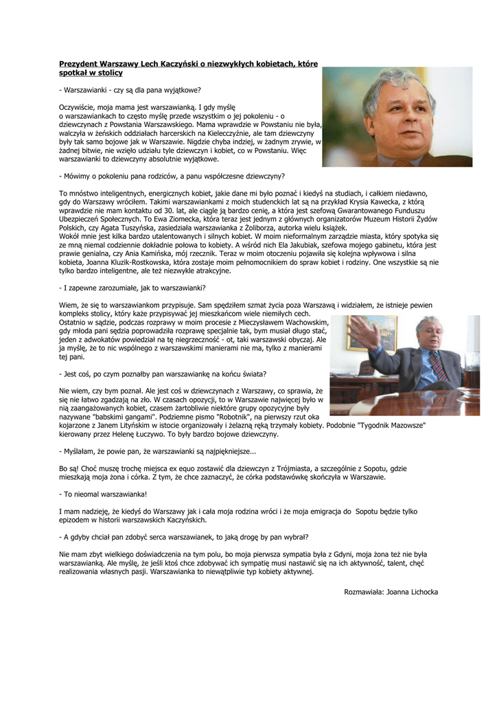 Prezydent Warszawy Lech Kaczyński o niezwykłych kobietach, które spotkał w stolicy - Warszawianki - czy są dla pana wyjątkowe? Oczywiście, moja mama jest warszawianką. I gdy myślę o warszawiankach to często myślę przede wszystkim o jej pokoleniu - o dziewczynach z Powstania Warszawskiego. Mama wprawdzie w Powstaniu nie była, walczyła w żeńskich oddziałach harcerskich na Kielecczyźnie, ale tam dziewczyny były tak samo bojowe jak w Warszawie. Nigdzie chyba indziej, w żadnym zrywie, w żadnej bitwie, nie wzięło udziału tyle dziewczyn i kobiet, co w Powstaniu. Więc warszawianki to dziewczyny absolutnie wyjątkowe. - Mówimy o pokoleniu pana rodziców, a panu współczesne dziewczyny? To mnóstwo inteligentnych, energicznych kobiet, jakie dane mi było poznać i kiedyś na studiach, i całkiem niedawno, gdy do Warszawy wróciłem. Takimi warszawiankami z moich studenckich lat są na przykład Krysia Kawecka, z którą wprawdzie nie mam kontaktu od 30. lat, ale ciągle ją bardzo cenię, a która jest szefową Gwarantowanego Funduszu Ubezpieczeń Społecznych. To Ewa Ziomecka, która teraz jest jednym z głównych organizatorów Muzeum Historii Żydów Polskich, czy Agata Tuszyńska, zasiedziała warszawianka z Żoliborza, autorka wielu książek. Wokół mnie jest kilka bardzo utalentowanych i silnych kobiet. W moim nieformalnym zarządzie miasta, który spotyka się ze mną niemal codziennie dokładnie połowa to kobiety. A wśród nich Ela Jakubiak, szefowa mojego gabinetu, która jest prawie genialna, czy Ania Kamińska, mój rzecznik. Teraz w moim otoczeniu pojawiła się kolejna wpływowa i silna kobieta, Joanna Kluzik-Rostkowska, która zostaje moim pełnomocnikiem do spraw kobiet i rodziny. One wszystkie są nie tylko bardzo inteligentne, ale też niezwykle atrakcyjne. - I zapewne zarozumiałe, jak to warszawianki? Wiem, że się to warszawiankom przypisuje. Sam spędziłem szmat życia poza Warszawą i widziałem, że istnieje pewien kompleks stolicy, który każe przypisywać jej mieszkańcom wiele niemiłych cech. Ostatnio w sądzie, podczas rozprawy w moim procesie z Mieczysławem Wachowskim, gdy młoda pani sędzia poprowadziła rozprawę specjalnie tak, bym musiał długo stać, jeden z adwokatów powiedział na tę niegrzeczność - ot, taki warszawski obyczaj. Ale ja myślę, że to nic wspólnego z warszawskimi manierami nie ma, tylko z manierami tej pani. - Jest coś, po czym poznałby pan warszawiankę na końcu świata? Nie wiem, czy bym poznał. Ale jest coś w dziewczynach z Warszawy, co sprawia, że się nie łatwo zgadzają na zło. W czasach opozycji, to w Warszawie najwięcej było w nią zaangażowanych kobiet, czasem żartobliwie niektóre grupy opozycyjne były nazywane "babskimi gangami". Podziemne pismo "Robotnik", na pierwszy rzut oka kojarzone z Janem Lityńskim w istocie organizowały i żelazną ręką trzymały kobiety. Podobnie "Tygodnik Mazowsze" kierowany przez Helenę Łuczywo. To były bardzo bojowe dziewczyny. - Myślałam, że powie pan, że warszawianki są najpiękniejsze... Bo są! Choć muszę trochę miejsca ex equo zostawić dla dziewczyn z Trójmiasta, a szczególnie z Sopotu, gdzie mieszkają moja żona i córka. Z tym, że chce zaznaczyć, że córka podstawówkę skończyła w Warszawie. - To nieomal warszawianka! I mam nadzieję, że kiedyś do Warszawy jak i cała moja rodzina wróci i że moja emigracja do Sopotu będzie tylko epizodem w historii warszawskich Kaczyńskich. - A gdyby chciał pan zdobyć serca warszawianek, to jaką drogę by pan wybrał? Nie mam zbyt wielkiego doświadczenia na tym polu, bo moja pierwsza sympatia była z Gdyni, moja żona też nie była warszawianką. Ale myślę, że jeśli ktoś chce zdobywać ich sympatię musi nastawić się na ich aktywność, talent, chęć realizowania własnych pasji. Warszawianka to niewątpliwie typ kobiety aktywnej. Rozmawiała: Joanna Lichocka