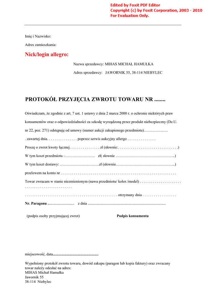 Imię i Nazwisko: Adres zamieszkania: Nick/login allegro: Nazwa sprzedawcy: MIHAS MICHAŁ HAMUŁKA Adres sprzedawcy: JAWORNIK 55, 38-114 NIEBYLEC PROTOKÓŁ PRZYJĘCIA ZWROTU TOWARU NR ........ Oświadczam, że zgodnie z art. 7 ust. 1 ustawy z dnia 2 marca 2000 r. o ochronie niektórych praw konsumentów oraz o odpowiedzialności za szkodę wyrządzoną przez produkt niebezpieczny (Dz.U. nr 22, poz. 271) odstępuję od umowy (numer aukcji zakupionego przedmiotu)………………. . zawartej dnia. . . . . . . . . . . . . . . . poprzez serwis aukcyjny allergo . . . . . . . . . . . . . . . Proszę o zwrot kwoty łącznej. . . . . . . . . . . . . . . . zł (słownie:. . . . . . . . . . . . . . . . . . . . . . . . . . . . . . . .) W tym koszt przedmiotu :…………………… zł( słownie ………………………………………..) W tym koszt dostawy: ………………………….zł (słownie………………………………………..) przelewem na konto nr . . . . . . . . . . . . . . . . . . . . . . . . . . . . . . . . . . . . . . . . . . . . . . . . . . . . . . . . . . . . . Towar zwracam w stanie niezmienionym (nawa przedmiotu/ kolor./model) . . . . . . . . . . . . . . . . . . . . . . ......................... . . . . . . . . . . . . . . . . . . . . . . . . . . . . . . . . . . . . . . . . . . . . . . . . . otrzymany dnia . . . . . . . . . . . . . . . . . . Nr. Paragonu ............................. z dnia ..................................................................................... (podpis osoby przyjmującej zwrot) Podpis konsumenta miejscowość, data................................................ Wypełniony protokół zwrotu towaru, dowód zakupu (paragon lub kopia faktury) oraz zwracany towar należy odesłać na adres: MIHAS Michał Hamułka Jawornik 55 38-114 Niebylec