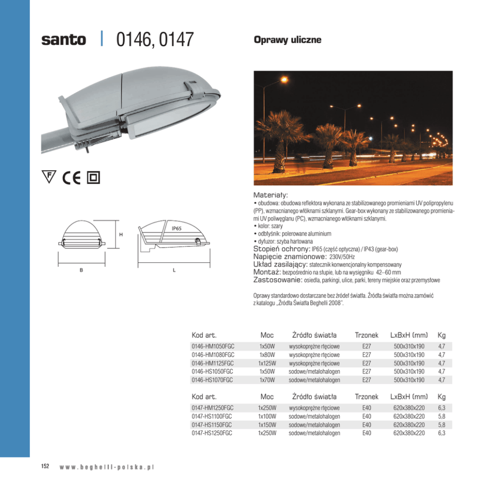 santo 0146, 0147 Oprawy uliczne Materiały: Materiały: • obudowa: obudowa reflektora wykonana ze stabilizowanego promieniami UV polipropylenu • obudowa: obudowa reflektora wykonana ze stabilizowanego promieniami UV polipropyle(PP), wzmacnianego włóknami szklanymi. Gear-box wykonany ze stabilizowanego promienianu (PP), wzmacnianego włóknami szklanymi. Gear-box wykonany ze stabilizowanego promi UV poliwęglanu (PC), wzmacnianego włóknami szklanymi. mieniami UV poliwęglanu (PC), wzmacnianego włóknami szklanymi. • kolor: szary • kolor: szary • odbłyśnik: polerowane aluminium • odbłyśnik: polerowane aluminium • dyfuzor: szyba hartowana • dyfuzor: szyba hartowana Stopień ochrony: IP65 (część optyczna) / IP43 (gear-box) Stopień ochrony: IP65 (część optyczna) / IP43 (gear-box) Napięcie znamionowe: 230V/50Hz Napięcie znamionowe: Układ zasilający: statecznik230V/50Hz konwencjonalny kompensowany Montaż: bezpośredniostatecznik na słupie,konwencjonalny lub na wysięgniku 42–60 mm Układ zasilający: kompensowany Zastosowanie: osiedla, parkingi, ulice, parki, tereny miejskie oraz przemysłowe Montaż: bezpośrednio na słupie, lub na wysięgniku ∅42–60 mm Zastosowanie: osiedla, parkingi, ulice,światła. parki, tereny oraz przemysłowe Oprawy standardowo dostarczane bez źródeł Źródła miejskie światła można zamówić z katalogu „Źródła Światła Beghelli 2008”. Oprawy standardowo dostarczane bez źródeł światła. Źródła światła można zamówić z katalogu „Źródła Światła Beghelli 2008”. Kod art. art. Kod 0146-HM1050FGC 0146-HM1050FGC 0146-HM1080FGC 0146-HM1080FGC 0146-HM1125FGC 0146-HM1125FGC 0146-HS1050FGC 0146-HS1050FGC 0146-HS1070FGC 0146-HS1070FGC Kod Kod art. art. 0147-HM1250FGC 0147-HM1250FGC 0147-HS1100FGC 0147-HS1100FGC 0147-HS1150FGC 0147-HS1150FGC 0147-HS1250FGC 0147-HS1250FGC 152 MocMoc 1x50W 1x50W 1x80W 1x80W 1x125W 1x125W 1x50W 1x50W 1x70W 1x70W Źródło światła Źródło światła wysokoprężne rtęciowe wysokoprężne rtęciowe wysokoprężne rtęciowe wysokoprężne rtęciowe wysokoprężne rtęciowe wysokoprężne rtęciowe sodowe/metalohalogen sodowe/metalohalogen sodowe/metalohalogen sodowe/metalohalogen Trzonek (mm) Trzonek LxBxH LxBxH (mm) MocMoc Źródło światła Źródło światła Trzonek LxBxH LxBxH (mm) Trzonek (mm) 1x250W 1x250W 1x100W 1x100W 1x150W 1x150W 1x250W 1x250W wysokoprężne rtęciowe wysokoprężne rtęciowe sodowe/metalohalogen sodowe/metalohalogen sodowe/metalohalogen sodowe/metalohalogen sodowe/metalohalogen sodowe/metalohalogen E27E27 E27E27 E27E27 E27E27 E27E27 E40E40 E40E40 E40E40 E40E40 500x310x190 500x310x190 500x310x190 500x310x190 500x310x190 500x310x190 500x310x190 500x310x190 500x310x190 500x310x190 620x380x220 620x380x220 620x380x220 620x380x220 620x380x220 620x380x220 620x380x220 620x380x220 Kg Kg 4,74,7 4,74,7 4,74,7 4,74,7 4,74,7 Kg Kg 6,36,3 5,85,8 5,85,8 6,36,3
