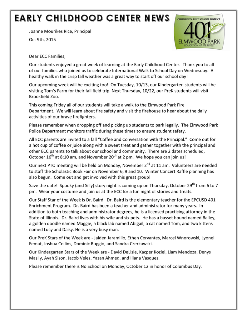 Joanne Mourikes Rice, Principal Oct 9th, 2015 Dear ECC Families, Our students enjoyed a great week of learning at the Early Childhood Center. Thank you to all of our families who joined us to celebrate International Walk to School Day on Wednesday. A healthy walk in the crisp fall weather was a great way to start off our school day! Our upcoming week will be exciting too! On Tuesday, 10/13, our Kindergarten students will be visiting Tom’s Farm for their fall field trip. Next Thursday, 10/22, our PreK students will visit Brookfield Zoo. This coming Friday all of our students will take a walk to the Elmwood Park Fire Department. We will learn about fire safety and visit the firehouse to hear about the daily activities of our brave firefighters. Please remember when dropping off and picking up students to park legally. The Elmwood Park Police Department monitors traffic during these times to ensure student safety. All ECC parents are invited to a fall “Coffee and Conversation with the Principal.” Come out for a hot cup of coffee or juice along with a sweet treat and gather together with the principal and other ECC parents to talk about our school and community. There are 2 dates scheduled, October 16th at 8:10 am, and November 20th at 2 pm. We hope you can join us! Our next PTO meeting will be held on Monday, November 2nd at 11 am. Volunteers are needed to staff the Scholastic Book Fair on November 6, 9 and 10. Winter Concert Raffle planning has also begun. Come out and get involved with this great group! Save the date! Spooky (and Silly) story night is coming up on Thursday, October 29th from 6 to 7 pm. Wear your costume and join us at the ECC for a fun night of stories and treats. Our Staff Star of the Week is Dr. Baird. Dr. Baird is the elementary teacher for the EPCUSD 401 Enrichment Program. Dr. Baird has been a teacher and administrator for many years. In addition to both teaching and administrator degrees, he is a licensed practicing attorney in the State of Illinois. Dr. Baird lives with his wife and six pets. He has a basset hound named Bailey, a golden doodle named Maggie, a black lab named Abigail, a cat named Tom, and two kittens named Lucy and Daisy. He is a very busy man. Our PreK Stars of the Week are - Jaiden Jaramillo, Ethen Cervantes, Marcel Wnorowski, Lyonel Femat, Joshua Collins, Dominic Ruggio, and Sandra Czerkawski. Our Kindergarten Stars of the Week are - David DeLisle, Kacper Koziel, Liam Mendoza, Denys Masliy, Ayah Sison, Jacob Velez, Yazan Ahmed, and Iliana Vasquez. Please remember there is No School on Monday, October 12 in honor of Columbus Day. Joanne Mourikes Rice, Principal Estimadas Familias del Centro ECC, Nuestros estudiantes disfrutaron de una semana maravillosa de aprendizaje aquí en el Centro de Educación Temprana. Muchas gracias a todas las familias que nos acompañaron a celebrar el Día Internacional de Caminar a La Escuela este pasado miércoles. ¡Una caminata saludable en el clima fresco del otoño, fue una manera maravillosa de comenzar nuestro día de clases! ¡La semana que viene también será una semana emocionante! El martes, 13 de octubre, nuestros estudiantes de Kindergarten estarán visitando la finca Tom durante su paseo de otoño. El próximo jueves 22 de octubre, nuestros estudiantes del Pre Kínder, estarán visitando el Zoológico Brookfield. Este próximo viernes todos nuestros estudiantes estarán visitando el Departamento de Bomberos de Elmwood Park. Estaremos aprendiendo sobre la seguridad en caso de un Incendio y para escuchar de las actividades diarias de nuestros valientes bomberos. Por favor no olvide estacionarse legalmente cuando deje o recoja a sus niños. El Departamento de la Policía de Elmwood Park controla el tráfico durante esas horas para asegurar la seguridad de nuestros estudiantes. Todos los padres del Centro ECC están invitados a un “Café y Conversación con la Principal” este otoño. Por favor acompáñenos a una taza de café o de jugo y de una merienda dulce y a una reunión con la principal y otros padres del Centro ECC para hablar sobre la escuela y la comunidad. Hay 2 fechas programadas, 16 de octubre a las 8:10 am, y 20 de noviembre a las 2 pm. ¡Esperamos que pueda acompañarnos! Nuestra próxima reunión de la PTO se llevara a cabo el lunes 2 de noviembre a las 11 am. Necesitamos voluntarios para asistir en la Feria de Libros Escolares el 6, 9 y 10 de noviembre. Los planes para la Rifa del Concierto de Invierno Winter, también comenzaron. ¡Venga y participe con este grupo maravilloso! ¡Reserve la fecha! La noche de historias Misteriosas (y Graciosas) estará aquí el jueves, 29 de octubre de 6 a 7 pm. Vístase con su disfraz y acompáñenos al Centro ECC para una noche de historias y deliciosas meriendas. Nuestro personal Estrella de la Semana es el Dr. Baird. El Dr. Baird es maestro de grado elemental del Programa de Enriquecimiento de EPCUSD 401. El Dr. Baird ha sido un maestro y administrado por varios anos. Además de estar licenciado en maestría y administración, es licenciado en abogado practicante en el Estado de Illinois. El Dr. Baird vive con su esposa y sus seis mascotas. Él tiene un perro de caza llamado Bailey, otro perrito “golden doodle” llamado Maggie, un perro Labrador negro llamado Abigail, un gato llamado Tom, y dos gatitos llamados Lucy y Daisy. Él es un hombre muy ocupado. Nuestros estudiantes Estrella de la Semana de PreK son - Jaiden Jaramillo, Ethen Cervantes, Marcel Wnorowski, Lyonel Femat, Joshua Collins, Dominic Ruggio, y Sandra Czerkawski. Nuestros estudiantes Estrella de la semana para Kindergarten son - David DeLisle, Kacper Koziel, Liam Mendoza, Denys Masliy, Ayah Sison, Jacob Vélez, Yazan Ahmed, e Iliana Vásquez. Por favor no se olvide que no habrá clases el lunes 12 de octubre en honor al Día de Cristóbal Colón. Joanne Mourikes Rice Dyrektor 9 pazdziernika, 2015 Drodzy Rodzice, Uczniowie spedzili wspanialy tydzien nauki w naszej szkole, w EC