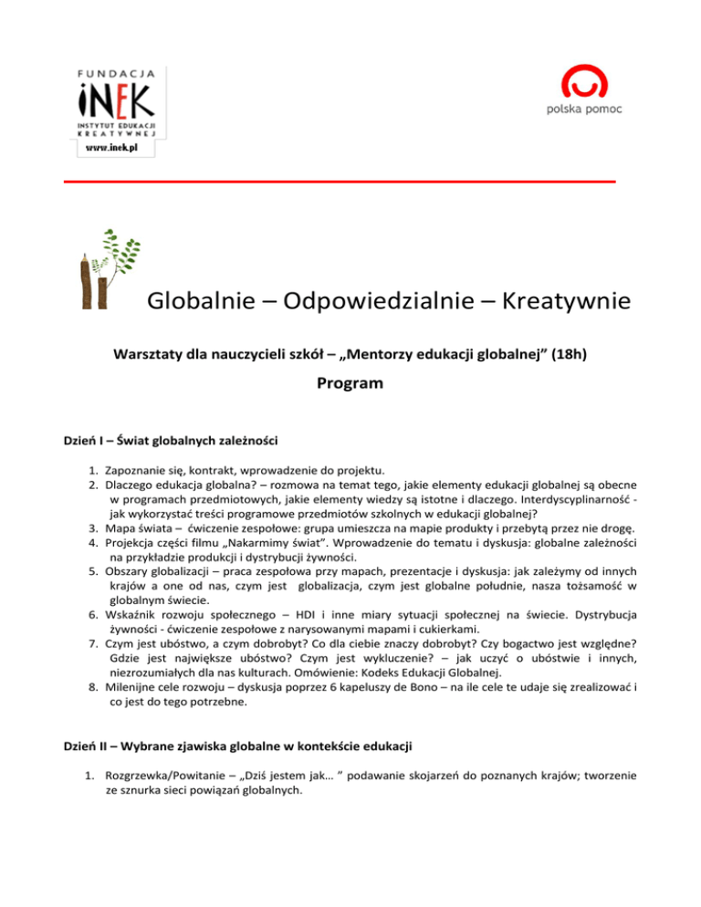 Globalnie – Odpowiedzialnie – Kreatywnie Warsztaty dla nauczycieli szkół – „Mentorzy edukacji globalnej” (18h) Program Dzień I – Świat globalnych zależności 1. Zapoznanie się, kontrakt, wprowadzenie do projektu. 2. Dlaczego edukacja globalna? – rozmowa na temat tego, jakie elementy edukacji globalnej są obecne w programach przedmiotowych, jakie elementy wiedzy są istotne i dlaczego. Interdyscyplinarnośd jak wykorzystad treści programowe przedmiotów szkolnych w edukacji globalnej? 3. Mapa świata – dwiczenie zespołowe: grupa umieszcza na mapie produkty i przebytą przez nie drogę. 4. Projekcja części filmu „Nakarmimy świat”. Wprowadzenie do tematu i dyskusja: globalne zależności na przykładzie produkcji i dystrybucji żywności. 5. Obszary globalizacji – praca zespołowa przy mapach, prezentacje i dyskusja: jak zależymy od innych krajów a one od nas, czym jest globalizacja, czym jest globalne południe, nasza tożsamośd w globalnym świecie. 6. Wskaźnik rozwoju społecznego – HDI i inne miary sytuacji społecznej na świecie. Dystrybucja żywności - dwiczenie zespołowe z narysowanymi mapami i cukierkami. 7. Czym jest ubóstwo, a czym dobrobyt? Co dla ciebie znaczy dobrobyt? Czy bogactwo jest względne? Gdzie jest największe ubóstwo? Czym jest wykluczenie? – jak uczyd o ubóstwie i innych, niezrozumiałych dla nas kulturach. Omówienie: Kodeks Edukacji Globalnej. 8. Milenijne cele rozwoju – dyskusja poprzez 6 kapeluszy de Bono – na ile cele te udaje się zrealizowad i co jest do tego potrzebne. Dzień II – Wybrane zjawiska globalne w kontekście edukacji 1. Rozgrzewka/Powitanie – „Dziś jestem jak… ” podawanie skojarzeo do poznanych krajów; tworzenie ze sznurka sieci powiązao globalnych. 2. Stereotypy – uporządkowanie pojęd: czym jest stereotyp, jak powstaje, skąd się bierze, z czego się składa. Rozmowa: dlaczego ludzie posługują się stereotypami i jakie są tego konsekwencje? Jakie stereotypy towarzyszą naszemu postrzeganiu krajów Afryki, Azji, Ameryki Pd.? 3. Targowisko – dwiczenie indywidualne i grupowe na wymianę ważnych dla nas praw. Omówienie: na ile łatwo/trudno przyszło nam dzielenie się z innymi swoimi prawami, etc. 4. Prawa człowieka - historie prawdziwe: zapoznanie się z historiami Malali i Yareda. 5. Kilka typów dyskusji: punktowana, debata oksfordzka: prawa człowieka, prawa dziecka, prawa dziewcząt/kobiet, rola wychowania w określonej kulturze, emigracja/uchodźstwo, integracja z nową kulturą, różnice między kulturami z perspektywy „obcych” i „tutejszych”, problem migracji . 6. Gra planszowa: zasoby. Fakty na temat wody – gra i dyskusja dotycząca ilości zużywanej wody. 7. Rozsądne gospodarowanie zasobami: jakie są zasoby w krajach Globalnego Południa i Globalnej Północy? Co i kto ma wpływ na wyczerpywanie się zasobów? 8. Spot reklamowy – projektowanie spotu kampanii społecznej odnoszącej się do rozsądnego gospodarowania zasobami. Dzień III – Nauczyciel jako opiekun wydarzenia edukacyjnego z zakresu edukacji globalnej 1. Rozmowa i wykład na temat produkcji odzieży i elektroniki w krajach azjatyckich, prezentacja slajdów Polskiej Zielonej Sieci na temat odpowiedzialnej konsumpcji. Zebranie faktów na temat tego, skąd pochodzą ubrania, telefony komórkowe, żywnośd. Odniesienie do źródeł: badania, filmy dokumentalne, programy organizacji pozarządowych. 2. Gra symulacyjna – plantacja bananów. Nauczyciele wcielają się w rolę udziałowców w produkcji i sprzedaży bananów. Przeniesienie problemu ze skali makro do skali mikro: lokalni producenci i drobni sprzedawcy versus hipermarkety. 3. Sprawiedliwy handel – czytanie ze ściany. Co to jest certyfikat Fairtrade? Jaka jest wiedza na ten temat w Polsce i innych krajach europejskich? Jaki my mamy wpływ na sprawiedliwy handel na świecie? 4. Mania kupowania – rozmowa o konsumpcjonizmie, do czego prowadzi taki styl życia i o tym, czym są odpowiedzialne zakupy. Informacje o działaniach wybranych organizacji pozarządowych. 5. Co można zrobid z butelki? - dwiczenie na myślenie dywergencyjne. Wprowadzenie do idei upcyklingu. Oglądanie przykładów ze strony „Życie rzeczy”, własne pomysły na projekty edukacyjne. 6. Wybór aktywnych metod nauczania w edukacji globalnej – rysowanie mapy myśli. 7. Projektowanie gier i zabaw dla uczniów na godziny wychowawcze. Temat: Odpowiedzialna konsumpcja. 8. Planowanie wydarzenie kulturalno-edukacyjnego w ramach Tygodnia Edukacji Globalnej. Opracowanie: Dorota Kondrat, Magdalena Bergmann Zezwala się na korzystanie z niniejszej publikacji na warunkach licencji Creative Commons Uznanie autorstwa-Na tych samych warunkach 3.0 (znanej również jako CC-BY-SA), dostępnej pod adresem http://creativecommons.org/licenses/by-sa/3.0/ lub innej wersji językowej tej licencji lub którejkolwiek późniejszej wersji tej licencji, opublikowanej przez organizację Creative Commons.