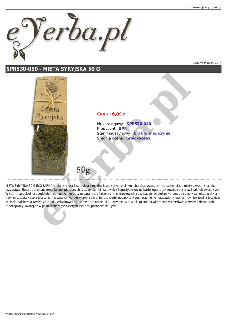 Informacje o produkcie Utworzono 03-03-2017 a. pl SPR530-050 - MIETA SYRYJSKA 50 G Cena : 6,09 zł er b Nr katalogowy : SPR530-050 Producent : SPR Stan magazynowy : brak w magazynie Średnia ocena : brak recenzji eY MIETA SYRYJSKA 50 G ECO FARMA Mieta syryjska jest roslina z rodziny jasnowatych o silnym,charakterystycznym zapachu. Liscie miety uzywane sa jako przyprawa. Sluza do aromatyzowania zup, pieczonych ryb,zapiekanek, surowek z kapusty,sosow na bazie jogurtu jak rowniez deserow i salatek owocowych. W kuchni tureckiej jest dodatkiem do tlustych mies typu baranina a takze do mies drobiowych gdyz nadaje im ciekawy aromat a co najwazniejsze ulatwia trawienie. Ciekawostka jest to ze mieszkancy Pld. Afryki robia z niej bardzo slodki napar,ktory gasi pragnienie i orzezwia. Mieta jest rowniez roslina lecznicza. Jej liscie zwiekszaja wydzielanie soku zoladkowego i usprawniaja prace jelit. Uzywane sa takze jako srodek wiatropedny,przeciwbakteryjny i nieznacznie uspokajajacy. Dostepna w postaci suszonych,cietych lisci.Kraj pochodzenia Syria. Wygenerowano w programie www.oscGold.com