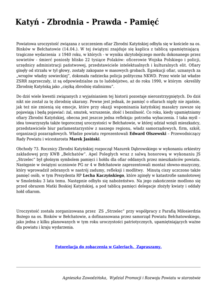 Katyń - Zbrodnia - Prawda - Pamięć Powiatowa uroczystość związana z uczczeniem ofiar Zbrodni Katyńskiej odbyła się w kościele na os. Binków w Bełchatowie (14.04.). W tej świątyni znajduje się kaplica z tablicą upamiętniającą tragiczne wydarzenia z 1940 roku, w których - w wyniku skrytobójczego mordu dokonanego przez sowietów - śmierć poniosły blisko 22 tysiące Polaków: oficerowie Wojska Polskiego i policji, urzędnicy administracji państwowej, przedstawiciele intelektualnych i kulturalnych elit. Ofiary ginęły od strzału w tył głowy, zostały zakopane w masowych grobach. Egzekucji ofiar, uznanych za „wrogów władzy sowieckiej”, dokonała radziecka policja polityczna NKWD. Przez wiele lat władze ZSRR zaprzeczały, iż są odpowiedzialne za to ludobójstwo, aż do roku 1990, w którym określiły Zbrodnię Katyńską jako „ciężką zbrodnię stalinizmu”. Do dziś wiele kwestii związanych z wyjaśnianiem tej historii pozostaje nierozstrzygniętych. Do dziś nikt nie został za tę zbrodnię ukarany. Pewne jest jednak, że pamięć o ofiarach nigdy nie zgaśnie, jak też nie zmienią się emocje, które przy okazji wspominania katyńskiej masakry zawsze się pojawiają i będą pojawiać: żal, smutek, wzruszenie, złość i bezsilność. Co roku, kiedy upamiętniamy ofiary Zbrodni Katyńskiej, obecna jest jeszcze jedna refleksja: potrzeba wybaczenia. I taka myśl – idea towarzyszyła także tegorocznej uroczystości w Bełchatowie, w której udział wzięli mieszkańcy, przedstawiciele biur parlamentarzystów z naszego regionu, władz samorządowych, firm, szkół, organizacji pozarządowych. Władze powiatu reprezentowali Edward Olszewski – Przewodniczący Rady Powiatu i wicestarosta Marek Jasiński. Obchody 73. Rocznicy Zbrodni Katyńskiej rozpoczął Mazurek Dąbrowskiego w wykonaniu orkiestry zakładowej przy KWB „Bełchatów”. Apel Poległych wraz z salwą honorową w wykonaniu JS „Strzelec” był głośnym symbolem pamięci i hołdu dla ofiar oddanych przez mieszkańców powiatu. Następnie w świątyni uczniowie PG nr 4 w Bełchatowie zaprezentowali montaż słowno-muzyczny, który wprowadził zebranych w nastrój zadumy, refleksji i modlitwy. Minutą ciszy uczczono także pamięć osób, w tym Prezydenta RP Lecha Kaczyńskiego, które zginęły w katastrofie samolotowej w Smoleńsku 3 lata temu. Następnie odbyło się nabożeństwo. Na jego zakończenie modlono się przed obrazem Matki Boskiej Katyńskiej, a pod tablicą pamięci delegacje złożyły kwiaty i oddały hołd ofiarom. Uroczystość została zorganizowana przez ZS „Strzelec” przy współpracy z Parafią Miłosierdzia Bożego na os. Binków w Bełchatowie, a dofinansowana przez samorząd Powiatu Bełchatowskiego, jako jedna z kilku planowanych w tym roku uroczystości patriotycznych, upamiętniających ważne dla powiatu i kraju wydarzenia. Fotorelacja do zobaczenia w Galeriach. Zapraszamy. Agnieszka Zawodzińska, Wydzial Promocji i Rozwoju Powiatu w starostwie