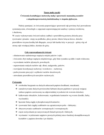 Nasze małe rączki Ćwiczenia kształtujące motorykę małą i sprawność manualną uczniów z niepełnosprawnością intelektualną w stopniu głębszym. Należy pamiętać, że ćwiczenia poprawiające sprawność rąk powinny być prowadzone systematycznie, równolegle z zajęciami usprawniającymi analizę i syntezę wzrokową i słuchową. W czasie wykonywania ćwiczeń należy zadbać o prawidłową postawę dziecka przy rysowaniu i pisaniu –stopy na podłodze, plecy proste, łokcie leżą na ławce, dziecko prawidłowo trzyma kredkę lub długopis, zeszyt lub kartka leży w pozycji – górny róg od strony ręki wiodącej lekko, skośnie do góry. Cele wprowadzanych ćwiczeń - eliminowanie nadmiernego napięcia mięśni palców i ręki; - ćwiczenie zbyt małego napięcia mięśniowego, gdy linie rysunku są nikłe i mało widoczne; - wyzwalanie ruchów płynnych, powolnych; - usprawnianie małych ruchów rąk: dłoni, nadgarstka, palców; - rozwijanie koordynacji ruchowej i wzrokowo – ruchowej; - podwyższenie precyzji i szybkości ruchów docelowych; - utrwalanie prawidłowych nawyków ruchowych; Ćwiczenia swobodne bazgranie na dużych arkuszach papieru kredkami, mazakami; zamalowywanie dużych powierzchni farbami duzym pędzlem w pozycji stojącej (arkusz papieru zawieszony na odpowiedniej wysokości do wzrostu dziecka); kalkowanie obrazków, kolorowanie, wypełnianie konturów wg wzoru (kredki, farby, wycinanki); łączenie linią ciągłą wykropkowanych konturów; rysowanie linii ciągłej szablonów na ograniczonym polu – labirynty; obrysowywanie szablonów zewnętrznych i wewnętrznych; cięcie nożyczkami po narysowanych liniach prostych i falistych; wycinanie i wydzieranie najpierw prostych później nieco bardziej skomplikowanych kształtów z papieru dowolne i po śladzie; lepienie z plasteliny i masy solnej kuleczek, wałeczków a później form bardziej złożonych: postaci ludzkich, zwierząt, liter; wydzieranie z kolorowego papieru; składanie papieru (sztuka orgiami); rysowanie i dokańczanie szlaczków, znaków graficznych dowolne lub po śladzie; zgniatanie kartki papieru jedną ręką w jak najmniejszą kulkę; nawlekanie koralików, guzików na nitkę; nawijanie i zwijanie włóczki, przewlekanie przez otwory, zwijanie pasków bibuły; układanie dowolne i według wzoru z patyczków, zapałek, sznurka; rysowanie patykiem po piasku i po śniegu; zabawy: strząsanie wody z palców, odtwarzanie rytmu deszczu, zabawy „idzie rak”, „kominiarz”; gry stolikowe: bierki, pchełki; zabawy z piłką: rzuty i chwyty piłki, kozłowanie, przerzucanie piłki z jednej ręki do drugiej, podrzucanie raz prawa raz lewą ręką; podbijanie balonika palcami ręki prawej i lewej; Opracowała: Lidia Orkisz 20.10.2006 r