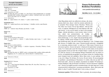 Porządek Nabożeństw od 14.12. do 21.12.2014 r. Niedziela 14.12. III Adwentu 7:00 Różaniec 7:30 Für + Cili Schulte 9:30 Godzinki ku czci NMP 10:00 Do Bożej Op. przez wst NSM i św. Jana Pawła II jako podziękowanie za wszystkie otrzymane łaski z prośbą o dalszą opiekę w rodzinie i rodzinach synów oraz o dary Ducha św. dla wnuka z ok. 18 r. urodzin 17:15 Nabożeństwo 18:00 Za + wujka Ulricha w 10 r. śmierci. ++ z pokr. o radość wieczną Poniedziałek 15.12. 17:00 Za ++ matkę Łucję Sowicz, ojca Antoniego, ++ dziadków, teściów, męża Henryka Wtorek 16.12. 17:00 Za ++ rodziców Annę i Romana, ojca Józefa, ++ z pokr. Środa 17.12. 17:00 ……………………. Czwartek 18.12. 16:45 Koronka do Bożego Miłosierdzia 17:00 Za + ojca Karola w r. śmierci, ++ matkę Gertrudę, męża Leona, ++ z pokr i dusze w czyśćcu Piątek 19.12. 16:30 Różaniec za młode pokolenie 17:00 Za + żonę i matkę Jadwigę, ++ rodziców Augustynę i Dominika, Wiktorię i Pawła, 4 braci, ++ z pokr. Sobota 20.12. 8:00 Do Bożej Op. przez wst. MBNP z podz. za otrzymane łaski z prośbą o dalszą opiekę dla Magdaleny z ok. 75 r. urodzin oraz o zdrowie Boże bł. w rodzinach dzieci ————————–—–———————————————————————— 17:30 Nabożeństwo Maryjne 18:00 ………………………... Niedziela 21.12. IV Adwentu 7:00 Różaniec 7:30 Für ++ Vater Franciszek Smieskol, Mutter Róża, Pfr. Jerzy Obst, Vater Jerzy, u. ++ aus der Verwandtschaft 9:30 Godzinki ku czci NMP 10:00 ………………………….. 17:15 Nabożeństwo 18:00 …………………………... Nasza Kolonowska Rodzina Parafialna www.parafia-kolonowskie.pl 50(1096) 14.12.– 21.12.2014 Adwent „Sam Bóg pokoju niech was całkowicie uświęca, aby nienaruszony duch wasz, dusza i ciało bez zarzutu zachowały się na przyjście Pana naszego Jezusa Chrystusa. Wierny jest Ten, który was wzywa: On też tego dokona”. Jeśli już dziś wiesz, że podczas zbliżających się świąt będziesz taki sam, „jak zawsze”, że nic się nie zmieni, to musi to być przygnębiające. Adwent adwentem, a życie życiem. Jasne, że są roraty, jakieś tam postanowienia, ale wydaje, że „barbarzyństwo współczesności” odziera codzienność z wymiaru duchowego, a o tzw. magii świąt przypominają natrętne reklamy. Krótko przed świętami iść do spowiedzi, zacisnąć duchowego pasa, aby przez święta nie nagrzeszyć i tyle. Z drugiej strony gdy słyszysz, że mógłby teraz, zaraz, Chrystus przyjść ponownie i nastąpiłoby to, co nazywają „końcem świata”, to rodzi się w Tobie strach. Przecież nie jesteś jeszcze gotowy. Jeszcze tyle spraw i relacji jest do naprawienia i przepracowania. To w końcu jak to jest? Do świąt się nie za wiele zmieni, ale do ponownego przyjścia Jezusa już tak? Bo to będzie kiedyś i wydaje się prawie nierealne? Jeśli nie wierzysz, że do kolejnego Bożego Narodzenia serce się zmieni, to nie licz, że kiedykolwiek przygotujesz się na koniec świata, bo z każdymi kolejnymi świętami może być podobnie. Słowo Boże mówi, że jest nadzieja. Nie w nas, ale w Bogu. On uświęca, On wzywa, On jest wierny. On nas przygotuje na spotkanie z przychodzącym Chrystusem. Co zrobić, żeby tak się stało? Św. Paweł nam radzi: „Zawsze się radujcie, nieustannie się módlcie! W każdym położeniu dziękujcie, taka jest bowiem wola Boża w Jezusie Chrystusie względem was”. Zawsze się znajdzie powód to niezadowolenia, ale obok niego jest o wiele więcej powód do wdzięczności i szczerego powiedzenia: „Boże, skoro jesteś tak dobry, to chcę Ci zaufać. Prowadź mnie i czyń ze mną, co chcesz”. Sentencja tygodnia: Wilhelm Raabe: Patrz w gwiazdy, ale uważaj na drogę 50/2014 Adwentowe refleksje bł. Matka Teresa „Mimo wszystko” Ludzie są często głupi, nielogiczni i dbają tylko o własny interes; Przebaczaj im, mimo wszystko. Jeśli jesteś życzliwy, ludzie oskarżą cię o egoizm i niskie pobudki; Pozostań życzliwy mimo wszystko. Jeśli osiągniesz w życiu sukces, znajdziesz wielu fałszywych przyjaciół i wielu prawdziwych wrogów; Staraj się osiągnąć sukces, mimo wszystko. Jeśli jesteś szczery i otwarty, ludzie mogą to wykorzystać; Bądź szczery i otwarty, mimo wszystko. W jedną noc ktoś może zniszczyć to, co budowałeś przez lata; Buduj mimo wszystko. Jeśli odnajdziesz pokój i szczęście, wielu będzie ci zazdrościć; Bądź szczęśliwy, mimo wszystko. O dobru, które czynisz dzisiaj, ludzie zapomną pewnie już jutro; Czyń dobro mimo wszystko. Dawaj z siebie ile możesz, a często powiedzą, że to za mało; Mimo to dawaj z siebie wszystko. Widzisz! W ostatecznym rozrachunku, liczy się tylko to, co działo się między Tobą a Bogiem. Między Tobą a ludźmi, i tak nic nigdy nie było. Z książki „Bóg nigdy nie mruga” * Gdy zachorujesz ,nie zaopiekuje się tobą twoja praca, tylko twoi przyjaciele. Dbaj o nich. * Nie traktuj siebie tak poważnie. Nikt oprócz ciebie tego nie robi. * Nie musisz wygrać każdego sporu, pozwól innym zostać przy swoim zdaniu. * Pokaż całemu światu, jakim stworzono Cię cudem. * Jeśli zajmujesz jakieś stanowisko i nie masz kilku przeciwników a nawet wrogów, znaczy, że źle pracujesz. * Nie ma ciemności tak ciemnej, by nie przeniknęło ją światło jednej świecy * Każdą tak zwaną katastrofę, kwituj słowami: czy za pięć lat będzie to miało jakieś znaczenie? s. Dolores „Mądrość Afryki” * Nawet po największym pożarze, trzeba ratować to, co jeszcze zostało. * Ręka, która daje, otrzymuje błogosławieństwo od ręki odbierającej, nawet kiedy nie słyszy się słów wdzięczności. * Każdy człowiek ma w sobie dość siły, by przezwyciężyć w życiu wszystkie przeszkody. * Afrykańczyk wstaje wraz z wschodzącym słońcem, by nie zaprzepaścić pierwszego i najważniejszego spojrzenia Boga, a kończy 