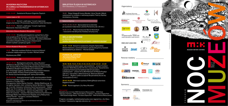 17.00–24.00 Zwiedzanie Muzeum Organów Śląskich 18.00 Pokaz fotografii Iwony Wander i Anny Tomaki-Wójcik wykonanych w związku z realizacją projektu Twórcy Śląskiej Architektury. Portrety Dom Oświatowy, ul. Francuska 12 Organizatorzy ul. Zacisze 3 18.00–18.30 Koncert ,,wędrujący” muzyki organowej (organy barokowe z Przeszowej). Wykonanie: Julian Gembalski 18.30–19.00 Koncert ,,wędrujący” muzyki organowej Wykonanie: Stanisław Pielczyk Biblioteka Główna Akademii Muzycznej 18.00–23.00 O każdej pełnej godzinie wykład Hanny Bias oraz projekcja filmu Schubert nieznany (dla uczczenia 85. rocznicy urodzin doc. dr. Karola Musioła – dyrektora Biblioteki i prorektora Akademii Muzycznej w Katowicach) Ostatni wykład z projekcją o godz. 22.00 Atrium Akademii Muzycznej 18.30 Wernisaż wystawy Kultura muzyczna Katowic w okresie międzywojennym. Kurator: Michał Cieślak Wystawa prac ZPAP Sala koncertowa AM 20.00–20.20 Wystąpienie patronów ,,Nocy Muzeów” JM Rektora Akademii Muzycznej im. Karola Szymanowskiego prof. Tomasza Miczki, Prezydenta Miasta Katowice Piotra Uszoka, JM Rektora Akademii Sztuk Pięknych w Katowicach prof. Antoniego Cygana, Dyrektora Muzeum Historii Katowic dr. Jacka Siebla, Prezesa Towarzystwa Muzycznego im. Karola Szymanowskiego prof. Joanny Domańskiej 20.20-22.00 Uroczysty koncert w 80. rocznicę pobytu Karola Szymanowskiego w Katowicach. Rekonstrukcja historycznego koncertu z 15 maja 1934 r. W programie: Stefan Marian Stoiński – Wielka Modlitwa op. 14 na sopran, baryton, chór i orkiestrę; Hector Berlioz cz. I Requiem op. 5 na chór mieszany i orkiestrę; Karol Szymanowski – Stabat Mater op. 53 na sopran, alt, baryton, chór mieszany i orkiestrę. Wykonawcy: Iwona Hossa – sopran; Ewa Marciniec – alt; Adam Kruszewski – baryton; Narodowa Orkiestra Symfoniczna Polskiego Radia; Chór Filharmonii Śląskiej; Jerzy Maksymiuk, Maciej Tworek – dyrygenci; Jarosław Wolanin – przygotowanie chóru Bezpłatne wejściówki do odbioru po wcześniejszej rezerwacji telefonicznej 32 779 21 00 Galeria Intymna 19.00, 20.00, 22.00 Oprowadzenie kuratorskie po wystawie malarstwa Ludwika Poniewiery (ok. 20 min.) 19.20-23.30 Akcja artystyczna Nocne Abstrakcje - tworzenie interaktywnej instalacji artystycznej Projekt graficzny: Joanna Sowa I piętro (sala nr 12) WILLA GOLDSTEINÓW pl. Wolności 12a ZESPÓŁ ŚPIEWAKÓW MIASTA KATOWICE „CAMERATA SILESIA” 18.30 – 19.30 Koncert w wykonaniu Zespołu Śpiewaków Miasta Katowice „Camerata Silesia” pod dyrekcją Anny Szostak. Oprowadzanie po obiekcie – Michał Dzióbek FUNDACJA „GIESCHE” „Porcelana Śląska Park” ul. Porcelanowa 23 Patronat medialny 17-18 maja 2014 18.00, 18.50, 19.25, 21.00, 21.40, 22.20, 23.00, 23.40 – 24.00 Tury zwiedzania obejmujące: wprowadzenie – prezes Fundacji „Giesche” Rafał Wyszyński (15 min.); wycieczkę pt. Kawał terenu z potężną historią po kompleksie fabryki porcelany w Katowicach – prezes firmy BGH Network SA Marek Przybył (30 min.), warsztaty z dekorowania pt. Kolorowe filiżanki (10 min.), ...Wytłucz sobie szczęście! Bo porcelanę tłucze się na szczęście (5 min.) 20.45–24.00 Wernisaż wystawy Elektryfikacja autorstwa Bogdana Kosaka 21.00 Rozstrzygnięcie „Gry Nocy Muzeów” Skorzystaj! Bezpłatny bus na trasie: MHK Kamienica Mieszczańska – MHK Dział Teatralno-Filmowy – MHK Dział Grafiki im. P. Stellera – Porcelana Śląska Park – MHK Dział Etnologii Miasta – Porcelana Śląska Park – MHK Kamienica Mieszczańska Program, szczegóły, rozkład jazdy busów oraz regulaminy: „Gry Nocy Muzeów” i losowania nagrody wieczoru na www.mhk.katowice.pl NOC MUZEÓW BIBLIOTEKA ŚLĄSKA W KATOWICACH Sponsorzy P R O G R A M AKADEMIA MUZYCZNA IM. KAROLA SZYMANOWSKIEGO W KATOWICACH KATOWICE-SZOPIENICE ul. Wiosny Ludów 1 (boczna ściana dawnego kina „Blask”) 17-18 maja 2014 16.00 Uroczyste odsłonięcie muralu inspirowanego twórczością Haliny Lerman. W programie m.in. minikoncert na trąbce w wykonaniu Grzegorza Szczyrby MUZEUM HISTORII KATOWIC Dział Sztuki (I piętro) 17.00–24.00 Wystawa stała W kamienicy mieszczańskiej 19.30, 21.30 Zwiedzanie wystawy stałej z historykiem sztuki Eweliną Krzeszowską (45 min.) 18.00, 19.00, 20.00, 21.00, 22.00, 23.00 Muzyka we wnętrzach mieszczańskich – 20-minutowe koncerty. Wykonanie: studenci Akademii Muzycznej w Katowicach (pod opieką Katarzyny Drogosz) ul. ks. J. Szafranka 9 Dział Sztuki (II piętro) Sala im. Witkacego (parter) 17.00–24.00 Zwiedzanie wystawy To tylko kolor! Halina Lerman (1928–2013) 17.00–18.00 Wystąpienie prezydenta Piotra Uszoka na temat powstającej tzw. katowickiej strefy kultury 18.00–19.00 Koncert oraz pokaz slajdów pt. Szymanowski/Witkacy, czyli dedykowana Witkacemu I Sonata c-moll op. 8 Karola Szymanowskiego w interpretacji Piotra Kopińskiego – fortepian. Słowo wstępne na temat związków malarza z kompozytorem – Natalia Kruszyna 19.30–20.30 Samochody okresu międzywojennego w Katowicach – wykład i pokaz slajdów: Stefan Arendarczyk (kustosz Automobilklubu Śląskiego) 20.00–21.00 Zwiedzanie wystawy To tylko kolor! Halina Lerman (1928–2013) z kuratorem – Natalią Kruszyną 21.00–22.00 Warsztaty psychologiczno-plastyczne pt. To nie tylko kolor! Prowadzenie: malarka, psycholog Ewa Ludwig Dział Historii (III piętro) 17.00–24.00 Zwiedzanie wystawy stałej Z dziejów Katowic 21.00 Rozstrzygnięcie „Gry Nocy Muzeów” 20.00–20.30 Dirt track, gymkhana i inne motorowe sporty w Katowicach – prezentacja multimedialna z quizem. Prowadzenie: Antoni Steuer, Michał Musioł 21.15–23.00 Nauka tańca – jive. Prowadzenie: Katarzyna Betleja-Kosubek, Henryk Kosubek – zawodowa para tancerzy 21.00–21.30 Wielobarwny świat katowickich firm – zapowiedź wystawy Made in Katowice oraz prezentacja multimedialna z quizem. Prowadzenie: Joanna Popanda 23.30 Losowanie nagród wieczoru (szczegóły na stronie www.mhk.