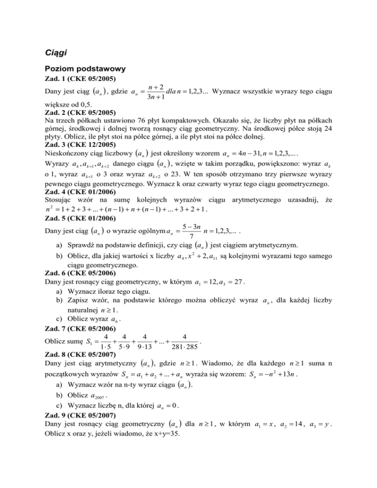 Ciągi Poziom podstawowy Zad. 1 (CKE 05/2005) Dany jest ciąg (a n ) , gdzie a n = n+2 dla n = 1,2,3... Wyznacz wszystkie wyrazy tego ciągu 3n + 1 większe od 0,5. Zad. 2 (CKE 05/2005) Na trzech półkach ustawiono 76 płyt kompaktowych. Okazało się, że liczby płyt na półkach górnej, środkowej i dolnej tworzą rosnący ciąg geometryczny. Na środkowej półce stoją 24 płyty. Oblicz, ile płyt stoi na półce górnej, a ile płyt stoi na półce dolnej. Zad. 3 (CKE 12/2005) Nieskończony ciąg liczbowy (a n ) jest określony wzorem a n = 4n − 31, n = 1,2,3,... . Wyrazy a k , a k +1 , a k + 2 danego ciągu (a n ) , wzięte w takim porządku, powiększono: wyraz a k o 1, wyraz a k +1 o 3 oraz wyraz a k + 2 o 23. W ten sposób otrzymano trzy pierwsze wyrazy pewnego ciągu geometrycznego. Wyznacz k oraz czwarty wyraz tego ciągu geometrycznego. Zad. 4 (CKE 01/2006) Stosując wzór na sumę kolejnych wyrazów ciągu arytmetycznego uzasadnij, że n 2 = 1 + 2 + 3 + ... + (n − 1) + n + (n − 1) + ... + 3 + 2 + 1 . Zad. 5 (CKE 01/2006) 5 − 3n Dany jest ciąg (a n ) o wyrazie ogólnym a n = n = 1,2,3,... . 7 a) Sprawdź na podstawie definicji, czy ciąg (a n ) jest ciągiem arytmetycznym. b) Oblicz, dla jakiej wartości x liczby a 4 , x 2 + 2, a11 są kolejnymi wyrazami tego samego ciągu geometrycznego. Zad. 6 (CKE 05/2006) Dany jest rosnący ciąg geometryczny, w którym a1 = 12, a 3 = 27 . a) Wyznacz iloraz tego ciągu. b) Zapisz wzór, na podstawie którego można obliczyć wyraz a n , dla każdej liczby naturalnej n ≥ 1 . c) Oblicz wyraz a 6 . Zad. 7 (CKE 05/2006) 4 4 4 4 Oblicz sumę S1 = + + + ... + . 1 ⋅ 5 5 ⋅ 9 9 ⋅13 281 ⋅ 285 Zad. 8 (CKE 05/2007) Dany jest ciąg arytmetyczny (a n ) , gdzie n ≥ 1 . Wiadomo, że dla każdego n ≥ 1 suma n początkowych wyrazów S n = a1 + a 2 + ... + a n wyraża się wzorem: S n = −n 2 + 13n . a) Wyznacz wzór na n-ty wyraz ciągu (a n ) . b) Oblicz a 2007 . c) Wyznacz liczbę n, dla której a n = 0 . Zad. 9 (CKE 05/2007) Dany jest rosnący ciąg geometryczny (a n ) dla n ≥ 1 , w którym a1 = x , a 2 = 14 , a3 = y . Oblicz x oraz y, jeżeli wiadomo, że x+y=35. Zad. 10 (CKE 05/2008) 1 Nieskończony ciąg liczbowy (a n ) jest określony wzorem a n = 2 − , n = 1,2,3,... . n a) Oblicz, ile wyrazów ciągu (a n ) jest mniejszych od 1,975. b) Dla pewnej liczby x trzywyrazowy ciąg (a 2 , a7 , , x ) jest arytmetyczny. Oblicz x. Zad. 11 (CKE 05/2009) Dany jest ciąg arytmetyczny (a n ) dla n ≥ 1 , w którym a 7 = 1, a11 = 9 . a) Oblicz pierwszy wyraz a1 i różnicę r ciągu (a n ) . b) Sprawdź, czy ciąg (a7 , a8 , a11 ) jest geometryczny. c) Wyznacz takie n, aby suma n początkowych wyrazów ciągu (a n ) miała wartość najmniejszą. Zad. 12 (CKE 11/2009) n Dla n=1,2,3,… ciąg (a n ) jest określony wzorem: a n = (− 1) ⋅ (3 − n ) . Oblicz a3 . Zad. 13 (CKE 11/2009) W ciągu arytmetycznym trzeci wyraz jest równy 14, a jedenasty jest równy 34. Oblicz różnicę tego ciągu. Zad. 14 (CKE 11/2009) W ciągu geometrycznym (a n ) dane są: a1 = 32 i a 4 = −4 . Oblicz iloraz tego ciągu. Zad. 15 (CKE 11/2009) m +1 m + 3 m + 9 Wykaż, że dla każdego m ciąg , , jest arytmetyczny. 6 12 4 Zad. 16 (CKE 05/2010) W ciągu arytmetycznym (a1 ) dane są a3 = 13 i a5 = 39 . Oblicz a1 . Zad. 17 (CKE 05/2010) W ciągu geometrycznym (a n ) dane są: a1 = 3 i a 4 = 24 . Oblicz iloraz tego ciągu. Zad. 18 (CKE 11/2010) W ciągu geometrycznym (a n ) dane są: a1 = 2 i a2 = 12 . Oblicz a4 . Zad. 19 (CKE 11/2010) W ciągu arytmetycznym a1 = 3 oraz a 20 = 7 . Oblicz S 20 . Zad. 20 (CKE 11/2010) Ciąg (1, x, y − 1) jest arytmetyczny, natomiast ciąg ( x, y,12) jest geometryczny. Oblicz x oraz y i podaj ten ciąg geometryczny. Zad. 21 (CKE 11/2011) 2 Dany jest nieskończony ciąg geometryczny (a n ) , w którym a3 = 1 i a 4 = . Oblicz a1 . 3 Zad. 22 (CKE 05/2011) Liczby x, y, 19 w podanej kolejności tworzą ciąg arytmetyczny, przy czym x+y=8. Oblicz x i y. Zad. 23 (CKE 05/2012) Miary kątów czworokąta tworzą ciąg arytmetyczny o różnicy 20 0 . Oblicz miarę najmniejszego kąta tego czworokąta. Zad. 24 (CKE 05/2012) n 2−n Dany jest ciąg (a n ) określony wzorem a n = (− 1) ⋅ 2 dla n ≥ 1 . Oblicz a5 . n Zad. 25 (CKE 05/2012) Ciąg (9,x,19) jest arytmetyczny, a ciąg (x,42,y,z) jest geometryczny. Oblicz x, y oraz z. Zad. 26 (CKE 06/2012) Ciąg (a n ) jest określony wzorem a n = 2n + 4 dla n ≥ 1 . Oblicz (a8 ) . Zad. 27 (CKE 06/2012) Ciąg 2 2 ,4, a jest geometryczny. Wyznacz a. Zad. 28 (CKE 06/2012) Suma S n = a1 + a 2 + ... + a n początkowych n wyrazów pewnego ciągu arytmetycznego (a n ) ( ) jest określona wzorem S n = n 2 − 2n dla n ≥ 1 . Wyznacz wzór na n-ty wyraz tego ciągu. Poziom rozszerzony Zad. 1 (CKE 01/2006) Dany jest ciąg trójkątów równobocznych takich, że bok następnego trójkąta jest wysokością poprzedniego. Oblicz sumę pól wszystkich tak utworzonych trójkątów, przyjmując, że bok pierwszego trójkąta ma długość a (a>0). Zad. 2 (CKE 11/2006) Ciąg liczbowy (a n ) jest określony dla każdej liczby naturalnej n ≥ 1 wzorem ( ) a n = (n − 3) 2 − p 2 , gdzie p ∈ R . a) Wykaż, że dla każdej wartości p ciąg (a n ) jest arytmetyczny. b) Dla p=2 oblicz sumę a 20 + a 21 + a 22 + ... + a 40 . c) Wyznacz wszystkie wartości p, dla których ciąg (bn ) określony wzorem bn = a n − pn jest stały. Zad. 3 (CKE 05/2008) Udowodnij, że jeżeli ciąg (a,b,c) jest jednocześnie arytmetyczny i geometryczny, to a=b=c. Zad. 4 (CKE 05/2009) W skarbcu królewskim było k monet. Pierwszego dnia rano skarbnik dorzucił 25 monet, a każdego następnego ranka dorzucał o 2 monety więcej niż dnia poprzedniego. Jednocześnie ze skarbca król zabierał w południe każdego dnia 50 monet. Oblicz najmniejszą liczbę k, dla której w każdym dniu w skarbcu była co najmniej jedna moneta, a następnie dla tej wartości k oblicz, w którym dniu w skarbcu była najmniejsza liczba monet. Zad