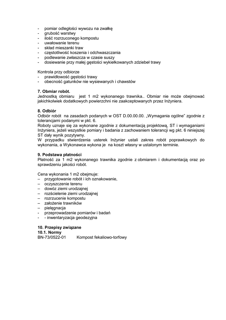 - pomiar odległości wywozu na zwałkę grubość warstwy ilość rozrzuconego kompostu uwałowanie terenu skład mieszanki traw częstotliwość koszenia i odchwaszczania podlewanie zwłaszcza w czasie suszy dosiewanie przy małej gęstości wykiełkowanych zdziebeł trawy Kontrola przy odbiorze - prawidłowość gęstości trawy - obecność gatunków nie wysiewanych i chawstów 7. Obmiar robót. Jednostką obmiaru jest 1 m2 wykonanego trawnika.. Obmiar nie moŜe obejmować jakichkolwiek dodatkowych powierzchni nie zaakceptowanych przez InŜyniera. 8. Odbiór Odbiór robót na zasadach podanych w OST D.00.00.00. „Wymagania ogólne” zgodnie z tolerancjami podanymi w pkt. 6. Roboty uznaje się za wykonane zgodnie z dokumentacją projektową, ST i wymaganiami InŜyniera, jeŜeli wszystkie pomiary i badania z zachowaniem tolerancji wg pkt. 6 niniejszej ST dały wynik pozytywny. W przypadku stwierdzenia usterek InŜynier ustali zakres robót poprawkowych do wykonania, a Wykonawca wykona je na koszt własny w ustalonym terminie. 9. Podstawa płatności Płatność za 1 m2 wykonanego trawnika zgodnie z obmiarem i dokumentacją oraz po sprawdzeniu jakości robót. Cena wykonania 1 m2 obejmuje: – przygotowanie robót i ich oznakowanie, – oczyszczenie terenu – dowóz ziemi urodzajnej – rozścielenie ziemi urodzajnej – rozrzucenie kompostu – załoŜenie trawników – pielęgnacja - przeprowadzenie pomiarów i badań - - inwentaryzacja geodezyjna 10. Przepisy związane 10.1. Normy BN-73/0522-01 Kompost fekaliowo-torfowy 3. Sprzęt Sprzęt powinien odpowiadać wymaganiom OST D-M-00.00.00. „Wymagania ogólne”. Sprzęt uŜywany przez Wykonawcę powinien uzyskać akceptację InŜyniera. Jakikolwiek sprzęt, maszyny i urządzenia nie gwarantujące zachowania wymagań jakościowych robót zostaną przez InŜyniera zdyskwalifikowane i niedopuszczone do robót. Do wykonania robót Wykonawca powinien dysponować następującym sprzętem: - glebogryzarka, pług, brona - wał kolczatki oraz wał gładki - kosiarka spalinowa - spycharka - koparka - przewoŜny zbiornik na wodę 4. Transport Ogólne wymagania dotyczace transportu podano w OST D-M.-00.00.00 „Wymagania ogólne”. Przy wykonywaniu robót moŜna korzystać z dowolnych środków transportowych. 5. Wykonanie robót 5.1 Ogólne zasady wykonania robót Ogólne zasady wykonania robót podano w OST D.00.00.00 „Wymagania ogólne”. 5.2. Trawniki Wymagania dotyczące wykonania trawników - teren pod trawniki musi być oczyszczony z gruzu i zanieczyszczeń teren powinien być obnizony w stosunku do krawęŜników o 15 cm - teren powinien być wyrównany i splantowany - ziemia urodzajna powinna być rozścielona równą warstwą i wymieszana z kompostem , nawozami mineralnymi oraz starannie wyrównana - przed siewem nasion trawy ziemię naleŜy wałować wałem gładkim, a potem wałem kolczatka lub zagrabić - siew powinien być wykonany w dni bezwietrzne - najlepszy okres siania to wiosna, nie naleŜy siać pózniej niŜ w m-cu wrześniu - na terenie płaskim nasiona traw wysiewane są w ilości 1 d0 4 kg na 100 m2 5.2.1 Pielęgnacja trawników NajwaŜniejszym zabiegiem pielęgnacyjnym jest koszenie. Pierwsze koszenie powinno być wykonane gdy trawa osiągnie wysokość 10 cm. Następne koszenia w takich odstępach czasu aby wysokość trawy przed koszeniem nie przekraczała wysokości 10 do 12 cm Ostatnie przedzimowe koszenie 1 miesiąc przed spodziewanymi mrozami Chwasty trwałe w pierwszym okresie naleŜy usuwać ręcznie, środki chwastobójcze naleŜy stosować z wielką ostroŜnością dopiero 6 m-cy od załoŜenia trawników. Trawniki wymagają nawoŜenia mineralnego około 3 kg NPK na 1 ar5 w ciągu roku. 6. Kontrola jakości robót Ogólne zasady kontroli jakości robót podano w OST D-M.-00.00.00 „Wymagania ogólne”. Kontrola w czasie wykonania trawników: - oczyszczenie terenu - określenie ilości zanieczyszczeń w m3 D.09.01.01 Wykonanie trawników 1.Wstęp 1.1. Przedmiot ST Przedmiotem niniejszej specyfikacji technicznej są wymagania dotyczące wykonania i odbioru robót związanych z wykonaniem trawników przy budowie chodnika w ciągu drogi Błaszki – Gruszczyce na odcinku od km 2+206 do km 2+715 w m-ści śelisław , zgodnie z Dokumentacja Projektową . 1.2. Zakres stosowania ST Specyfikacja techniczna jest stosowana jako dokument przetargowy i kontraktowy przy zlecaniu robót wymienionych w pkt. 1.1. 1.3. Zakres robót objętych ST Ustalenia zawarte w niniejszej specyfikacji dotyczą humusowania o grubości 10 cm i obsiania trawą trawników . Roboty ziemne dotyczące wykonania trawników ujęto w ST D.02.01.01 i 02.03.01. 1.4. Określenia podstawowe 1.4.1 Ziemia urodzajna Ziemia posiadająca właściwości zapewniające roślinom prawidłowy rozwój. 1.4.2 Pozostałe określenia podstawowe są zgodne z obowiązującymi odpowiednimi normami i definicjami podanymi w OST D-M.-00.00.00 „Wymagania ogólne” 1.5. Ogólne wymagania dotyczące robót Wykonawca robót jest odpowiedzialny za jakość ich wykonania oraz za zgodność z Dokumentacją Projektową, ST i poleceniami InŜyniera. Ogólne wymagania podano w OST D.00.00.00. „Wymagania ogólne”. 2. Materiały 2.1 Ogólne wymagania dotyczace materiałów , ich pozyskiwania i składowania podano w OST D.M.00.00.00 „ Wymagania ogólne „ 2.2 Ziemia urodzajna w zaleŜności od miejsca pozyskiwania powinna posiadać następujace charakterystyki : - ziemia urodzajna – powinna być zdjeta przed rozpoczęciem robót budowlanych i zmagazynowana w pryzmach nie przekraczających 2 m wysokości - ziemia pozyskana w innym miejscu i dostarczona na plac budowy nie moŜe być zagruzowana , przerośnięta korzeniami , zasolona lub zanieczyszczona chemicznuie NaleŜy uzyć gruntu pozyskanego przy zdjęciu humusu. 2.3 nasiona traw najczęściej występują w postaci gotowych mieszanek z nasion róŜnych gatunków. Gotowa mieszanka traw powinna mieć oznaczony pro