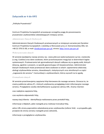 Załącznik nr 4 do OPZ „Polityka Prywatności” Centrum Projektów Europejskich przywiązuje szczególną wagę do poszanowania prywatności użytkowników odwiedzających niniejszy serwis. Administrator Danych Osobowych Administratorem Danych Osobowych przetwarzanych w niniejszym serwisie jest Dyrektor Centrum Projektów Europejskich z siedzibą w Warszawie przy ul. Domaniewskiej 39A, tel. +48 22 378 31 00, e-mail: [email protected], strona: http://www.cpe.gov.pl Wykorzystywanie danych W serwisie (podajemy nazwę serwisu np.: www.plsk.eu) wykorzystywane są tzw. ciasteczka (z ang. Cookies) oraz dane osobowe, które przechowywane mogą być w dziennikach logów systemowych. Przetwarzanie tak zgromadzonych danych odbywa się za zgodą osób, których dotyczą, zgodnie z prawem, w sposób gwarantujący ich bezpieczeństwo. Administrator Danych Osobowych może przetwarzać dane osobowe w celach: zapewnienia właściwej obsługi użytkowników serwisu, dowodowych, statystycznych oraz określonych w części „Logowanie do serwisu” i komunikacji z użytkownikami, którzy wyrazili na to zgodę. Gromadzenie danych W serwisie przechowujemy zapytania http kierowane do naszego serwera. Oznacza to, że znamy publiczne adresy IP, z których użytkownicy przeglądają treści informacyjne naszego serwisu. Przeglądane zasoby identyfikowane są poprzez adresy URL. Znamy również: czas nadejścia zapytania http, czas wysłania odpowiedzi http, nazwę stacji klienta - identyfikacja realizowana przez protokół http, informacje o błędach, jakie nastąpiły przy realizacji transakcji http, adres URL strony poprzednio odwiedzanej przez użytkownika (referer link) - w przypadku gdy przejście do strony serwisu nastąpiło przez odnośnik, informacje o przeglądarce użytkownika. Dane te nie są kojarzone z konkretnymi osobami przeglądającymi stronę IP z zastrzeżeniem, o którym mowa w punkcie „Logowanie do serwisu”. Dla zapewnienia jak najwyższej jakości serwisu, okazjonalnie analizujemy pliki z logami w celu określenia, które strony odwiedzane są najczęściej, jakie przeglądarki stron WWW są stosowane, czy struktura strony nie zawiera błędów, itp. Mechanizm Cookies w serwisie. Mechanizm Cookies nie jest wykorzystywany do pozyskiwania jakichkolwiek informacji o użytkownikach serwisu ani śledzenia ich nawigacji. Pliki Cookies stosowane w serwisie nie przechowują danych osobowych użytkowników. Dla niniejszego serwisu przechowujemy następujące pliki Cookies, które tworzone są i istnieją tylko w określonym odpowiednio czasie. Są one niezbędne dla prawidłowego działania poszczególnych elementów serwisu. Nazwa Cookie1 Rodzaj Cel i zawartość INFO Sesyjne Wykorzystywany do zapisania faktu zapoznania się z wyróżnionymi informacjami. Jest tworzone w celu ograniczania ilości emisji okresowo pojawiających się ogłoszeń. Dzięki zastosowaniu pliku Cookie informacja wyświetla się tylko raz dla jednej sesji użytkownika i nie ukazuje się ponownie po przejściu na kolejną stronę serwisu. GSES Sesyjne Przechowuje wartość liczbową wykorzystywaną przez licznik odwiedzanych stron. RABAN Sesyjne Przechowuje na czas sesji informacje o wersji używanej przez użytkownika platformy i jej wersji językowej JSESSIONID Sesyjne Przechowuje identyfikator sesji. Jest niezbędny do zachowania spójności wypełnianego wniosku. Zakładane tylko jeśli połączenie jest szyfrowane protokołem SSL MoodleSession Sesyjne Przechowuje identyfikator sesji. Jest niezbędny do przechowania informacji o fakcie bycia zalogowanym w serwisie. PHPSESSID Sesyjne Przechowuje identyfikator sesji. Jest niezbędny do przechowania informacji o fakcie bycia 1 Nazwy Cookies, rodzaj, cel i zawartość - należy odpowiednio dostosować do danej strony. zalogowanym w serwisie. Przechowuje identyfikator sesji. Jest niezbędny do sprawdzenie czy odwiedzający nie jest automatycznym skryptem wypełniającym formularz Odnośniki do innych stron Serwis zawiera odnośniki do innych stron WWW. Nie ponosimy odpowiedzialności za zasady zachowania prywatności obowiązujące na tych stronach. Namawiamy, by po przejściu na inne strony, zapoznać się z polityką prywatności tam ustaloną. Bieżąca polityka prywatności dotyczy tylko niniejszego serwisu. Logowanie do serwisu Wyjątkiem od przedstawionych wyżej zasad jest rejestracja użytkowników w serwisie. Dane osobowe wykorzystane podczas logowania są przetwarzane w celu, dla którego został przygotowany serwis oraz do archiwizacji. W odniesieniu do podmiotów i osób, które skorzystały z usługi rejestracji w serwisie, odnotowywane są następujące dane osobowe: imię, nazwisko, adres zamieszkania, adres email, nr telefonu itd.2 Dodatkowo dla każdej osoby zarejestrowanej w serwisie, rejestrowane jest hasło dostępu. W odniesieniu do osób lub podmiotów, którym wysyłane są wiadomości na wskazane skrzynki mailowe odnotowywane są informacje o adresach IP komputerów oraz dacie i czasie odczytywania wiadomości. Odbiorca informacji otrzymuje na skrzynkę pocztową informację awizo o adresowanej do niego wiadomości, do której dostęp może uzyskać po kliknięciu zaznaczonego w informacji awizo odnośnika. Kliknięcie podanego odnośnika kieruje odbiorcę na stronę serwisu, z którego odbiorca odczytuje przeznaczoną dla niego wiadomość. Jednocześnie w logach serwera odnotowywane są: numer IP komputera, z którego nastąpiło połączenie oraz data i godzina wykonania tej operacji oraz powiadomienie, że informacja została odczytana. Informacje zawarte w logach, rejestrujących informacje o odczytaniu wysłanych wiadomości, wykorzystywane są w celu stwierdzenia, że wysłana do adresata informacja została poprawnie dostarczona i w konsekwencji odnotowywana jest w serwisie. Zgoda użytkownika serwisu Użytkownik wyraża zgodę na dostęp do informacji przechowywanej na jego urządzeniu końcowym (komputerze, telefonie itp.) lub przec