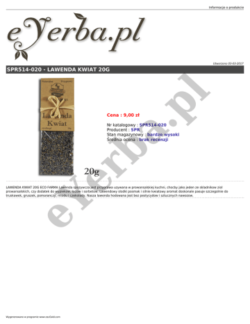 Informacje o produkcie Utworzono 03-03-2017 a. pl SPR514-020 - LAWENDA KWIAT 20G Cena : 9,00 zł er b Nr katalogowy : SPR514-020 Producent : SPR Stan magazynowy : bardzo wysoki Średnia ocena : brak recenzji eY LAWENDA KWIAT 20G ECO FARMA Lawenda spozywcza jest przyprawa uzywana w prowansalskiej kuchni, chocby jako jeden ze skladnikow ziol prowansalskich, czy dodatek do wypiekow, lodow i sorbetow. Lawendowy slodki posmak i silnie kwiatowy aromat doskonale pasuje szczegolnie do truskawek, gruszek, pomaranczy, miodu i czekolady. Nasza lawenda hodowana jest bez pestycydow i sztucznych nawozow. Wygenerowano w programie www.oscGold.com