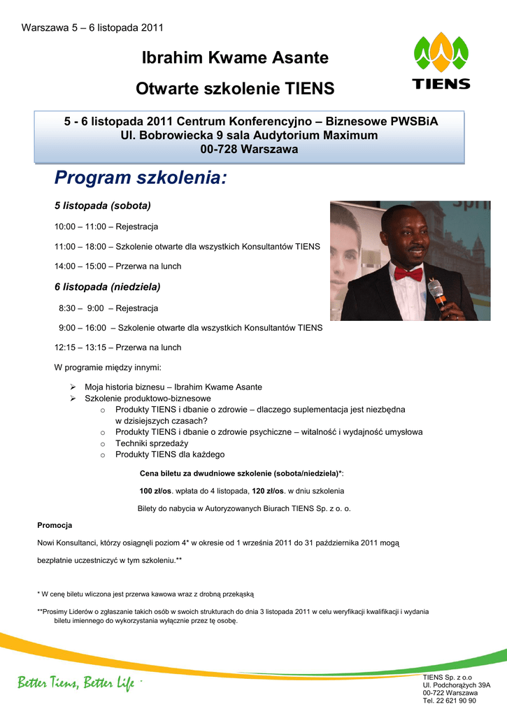 Warszawa 5 – 6 listopada 2011 Ibrahim Kwame Asante Otwarte szkolenie TIENS 5 - 6 listopada 2011 Centrum Konferencyjno – Biznesowe PWSBiA Ul. Bobrowiecka 9 sala Audytorium Maximum 00-728 Warszawa Program szkolenia: 5 listopada (sobota) 10:00 – 11:00 – Rejestracja 11:00 – 18:00 – Szkolenie otwarte dla wszystkich Konsultantów TIENS 14:00 – 15:00 – Przerwa na lunch 6 listopada (niedziela) 8:30 – 9:00 – Rejestracja 9:00 – 16:00 – Szkolenie otwarte dla wszystkich Konsultantów TIENS 12:15 – 13:15 – Przerwa na lunch W programie między innymi: Moja historia biznesu – Ibrahim Kwame Asante Szkolenie produktowo-biznesowe o Produkty TIENS i dbanie o zdrowie – dlaczego suplementacja jest niezbędna w dzisiejszych czasach? o Produkty TIENS i dbanie o zdrowie psychiczne – witalność i wydajność umysłowa o Techniki sprzedaży o Produkty TIENS dla każdego Cena biletu za dwudniowe szkolenie (sobota/niedziela)*: 100 zł/os. wpłata do 4 listopada, 120 zł/os. w dniu szkolenia Bilety do nabycia w Autoryzowanych Biurach TIENS Sp. z o. o. Promocja Nowi Konsultanci, którzy osiągnęli poziom 4* w okresie od 1 września 2011 do 31 października 2011 mogą bezpłatnie uczestniczyć w tym szkoleniu.** * W cenę biletu wliczona jest przerwa kawowa wraz z drobną przekąską **Prosimy Liderów o zgłaszanie takich osób w swoich strukturach do dnia 3 listopada 2011 w celu weryfikacji kwalifikacji i wydania biletu imiennego do wykorzystania wyłącznie przez tę osobę. TIENS Sp. z o.o Ul. Podchorążych 39A 00-722 Warszawa Tel. 22 621 90 90 www.tiens.pl
