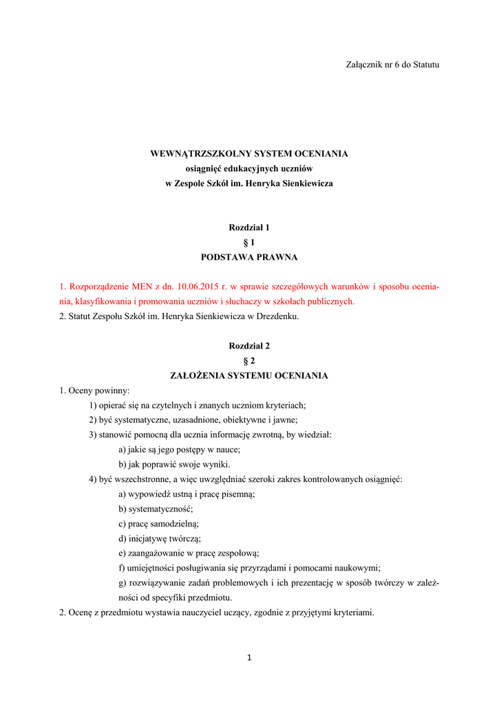 Załącznik nr 6 do Statutu WEWNĄTRZSZKOLNY SYSTEM OCENIANIA osiągnięć edukacyjnych uczniów w Zespole Szkół im. Henryka Sienkiewicza Rozdział 1 §1 PODSTAWA PRAWNA 1. Rozporządzenie MEN z dn. 10.06.2015 r. w sprawie szczegółowych warunków i sposobu oceniania, klasyfikowania i promowania uczniów i słuchaczy w szkołach publicznych. 2. Statut Zespołu Szkół im. Henryka Sienkiewicza w Drezdenku. Rozdział 2 §2 ZAŁOŻENIA SYSTEMU OCENIANIA 1. Oceny powinny: 1) opierać się na czytelnych i znanych uczniom kryteriach; 2) być systematyczne, uzasadnione, obiektywne i jawne; 3) stanowić pomocną dla ucznia informację zwrotną, by wiedział: a) jakie są jego postępy w nauce; b) jak poprawić swoje wyniki. 4) być wszechstronne, a więc uwzględniać szeroki zakres kontrolowanych osiągnięć: a) wypowiedź ustną i pracę pisemną; b) systematyczność; c) pracę samodzielną; d) inicjatywę twórczą; e) zaangażowanie w pracę zespołową; f) umiejętności posługiwania się przyrządami i pomocami naukowymi; g) rozwiązywanie zadań problemowych i ich prezentację w sposób twórczy w zależności od specyfiki przedmiotu. 2. Ocenę z przedmiotu wystawia nauczyciel uczący, zgodnie z przyjętymi kryteriami. 1 Rozdział 3 §3 CELE WEWNĄTRZSZKOLNEGO OCENIANIA OSIĄGNIĘĆ EDUKACYJNYCH UCZNIÓW 1.Poinformowanie ucznia o postępach i poziomie jego osiągnięć edukacyjnych. 2. Motywowanie ucznia do dalszej pracy. 3. Pomoc uczniowi w samodzielnym planowaniu jego rozwoju. 4. Dostarczanie rodzicom (opiekunom) i nauczycielom informacji o postępach, trudnościach i specjalnych uzdolnieniach ucznia. 5. Umożliwienie nauczycielom dostosowania organizacji i metod pracy wychowawczo – dydaktycznej do poziomu ucznia i ich doskonalenia. Rozdział 4 §4 ZASADY WEWNĄTRZSZKOLNEGO SYSTEMU OCENIANIA OSIĄGNIĘĆ EDUKACYJNYCH UCZNIÓW FORMUŁOWANIE PRZEZ NAUCZYCIELI WYMAGAŃ EDUKACYJNYCH ORAZ INFORMOWANIE O NICH 1. Nauczyciele przedmiotów przedstawiają uczniom i rodzicom wymagania edukacyjne na poszczególne poziomy w zależności od specyfiki przedmiotu i dziedziny aktywności – informacje te złożone są w bibliotece szkolnej. 2. Kryteria oceniania powinny być podane uczniom i ich rodzicom na początku roku szkolnego. 3. Sposobem przekazywania rodzicom wiadomości o postępach ucznia są: karta ucznia, konsultacje, zebrania, przewidywane oceny semestralne i roczne zapisane w dzienniku na 4 tygodnie przed radą klasyfikacyjną. 4. Uczeń powinien być oceniany regularnie, wszystkie formy kontroli poziomu osiągnięć winny być równo rozłożone w czasie. 5. Na podstawie opinii poradni pedagogiczno – psychologicznej, przedstawionej przez ucznia lub jego rodziców, nauczyciel powinien dostosować wymagania edukacyjne do indywidualnych potrzeb rozwojowych i edukacyjnych oraz możliwości psychofizycznych ucznia. 6. Oceny są jawne. 7. Nauczyciel powinien na bieżąco informować ucznia o jego postępach lub problemach w nauce, na prośbę ucznia lub jego rodziców powinien umotywować wystawioną ocenę. 8. Nauczyciel powinien przestrzegać higieny pracy umysłowej uczniów, co oznacza, iż: a) w tygodniu można przeprowadzić co najwyżejtrzy prace klasowe; 2 b) termin pracy klasowej musi być podany z tygodniowym wyprzedzeniem i zapisany w dzienniku; c) w jednym dniu może odbyć się co najwyżej jeden sprawdzian, nie uwzględniając sprawdzianów przełożonych na prośbę uczniów. 9. Kartkówka jest formą sprawdzenia przygotowania uczniów do danej lekcji i nie musi być zapowiadana. 10. Nauczyciel jest zobowiązany sprawdzić i omówić wyniki prac najpóźniej w ciągu dwóch tygodni po ich napisaniu przez uczniów, dokonuje wpisu „poprawa pracy klasowej”. Oceniane prace pisemne uczeń otrzymuje do wglądu w obecności nauczyciela. Rodzice ucznia mogą otrzymać do wglądu sprawdziany w obecności nauczyciela w trakcie zebrań z rodzicamilub na pisemną prośbę do domu. 11. Uczeń ma obowiązek pisania lub zaliczania materiału ze wszystkich przeprowadzanych w danym semestrze sprawdzianów. 12. Jeżeli uczeń nie pisał sprawdzianu z całą klasą, ma obowiązek na pierwszej lekcji po powrocie do szkoły ustalić z nauczycielem termin i miejsce pisania sprawdzianu lub zaliczenia danego materiału. Jeżeli uczeń był nieobecny tylko 1 dzień, może być odpytany na najbliższej godzinie lekcyjnej. 13. Gdy uczeń nie dopełni obowiązku wynikającego z punktu 12, nauczyciel ma prawo do natychmiastowego sprawdzenia wiadomości. 14. W przypadku, gdy uczeń był nieobecny minimum tydzień, ma prawo być nieprzygotowany pierwszego dnia po powrocie. 15. Uczeń ma prawo poprawić jeden raz każdy sprawdzian napisany na ocenę niezadawalającą go w ciągu 14 dni od otrzymania oceny. Termin poprawy musi być uzgodniony z nauczycielem. 16. Każdy stopień uzyskany z poprawy sprawdzianu wpisuje się obok pierwszego stopnia. 17. Przy ustalaniu oceny z wychowania fizycznego, zajęć technicznych, muzyki, plastyki, zajęć artystycznych należy przede wszystkim brać pod uwagę wysiłek wkładany przez ucznia w wywiązywanie się z obowiązków wynikających ze specyfiki tych zajęć. Istotą sprawy na tych zajęciach jest zachowanie ucznia oraz jego aktywność na lekcji. Uczeń może otrzymać ocenę niedostateczną za niewykonanie poleceń nauczyciela, zachowanie zagrażające bezpieczeństwu oraz niewykonanie obowiązkowej pracy plastycznej, technicznej lub odmowę ćwiczenia na lekcji w-f, bez uzasadnionej przyczyny. Ocena czynności ucznia lub aktywności w czasie lekcji nie może być ze zrozumiałych względów poprawiona, natomiast wykonanie obowiązkowej pracy w innym terminie dokonuje się jak w przypadku sprawdzianów tzn. po uzgodnieniu z nauczycielem w ciągu dwóch tygodni od otrzymania oceny niedostatecznej. 18.Uczeń może zostać zwolniony przez dyrektora z wykonywania określonych ćwiczeń fizycznych na zajęciach wychowaniafizycznego, na podstawie opinii o o