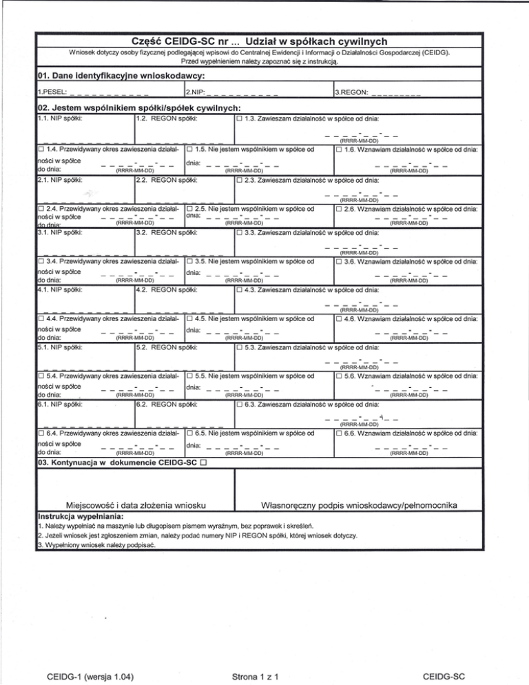 Część CEIDG-SC nr ... Udział w spółkach cywilnych Wniosek dotyczy osoby fizycznej podlegającej wpisowi do Centralnej Ewidencji i Informacji o Działalności Gospodarczej (CEIDG). Przed wypełnieniem należy zapoznać się z instrukcją. 01. Dane identyfikacyjne wnioskodawcy: 1.PESEL: 2.NIP: 02. Jestem wspólnikiem spółki/spółek 1.1. NIP spółki: 1.2. REGON spółki: 3.REGON: cywilnych: D 1.3. Zawieszam działalność w spółce od dnia: - D 1.4. Przewidywany okres zawieszenia działałności w spółce do dnia: -- - - -- --- - D 1.5. Nie jestem wspólnikiem w spółce od dnia: - - - - (RRRR-MM-OO) 2.1. NIP spółki: -- - - - - - - (RRRR-MM-OO) D 1.6. Wznawiam działalność w spółce od dnia: - --- - - - -- (RRRR-MM-OO) -- - -- - (RRRR-MM-OO) D 2.3. Zawieszam działalność w spółce od dnia: 2.2. REGON spółki: -" - - , - - -- - - - - - - (RRRR-MM-OO) D 2.4. Przewidywany okres zawieszenia działal- O 2.5. Nie jestem wspólnikiem w spółce od D 2.6. Wznawiam działalność w spółce od dnia: dnia: ności w spółce - - -- - -- -(RRRR-MM-OO) (RRRR-MM-OO) (RRRR-MM-OO) Irlnrlni,,· 3.1. NIP spółki: 3.2. REGON spółki: D 3.3. Zawieszam działalność w spółce od dnia: - - -- -- - - - - - -- -- - - -- -- --- - (RRRR-MM-OO) D 3.4. Przewidywany okres zawieszenia działalności w spółce do dnia: -- - - -- - -- - D 3.5. Nie jestem wspólnikiem w spółce od dnia: - - -- (RRRR-MM-OO) 14.1. NIP spółki: -- D 3.6. Wznawiam działalność w spółce od dnia: - -- - - (RRRR-MM-OO) - (RRRR-MM-OD) -- - - - - - - D 4.3. Zawieszam działalność w spółce od dnia: 4.2. REGON spółki: - - -- - - - - - - (RRRR-MM-OO) D 4.4. Przewidywany okres zawieszenia działalności w spółce do dnia: - - -- - - --- - D 4.5. Nie jestem wspólnikiem w spółce od dnia: - - -- (RRRR-MM-OO) 5.1. NIP spółki: - - D 4.6. Wznawiam działalność w spółce od dnia: -- - - -- (RRRR-MM-OO) -- - - -- - - (RRRR-MM-OD) D 5.3. Zawieszam działalność w spółce od dnia: 5.2. REGON spółki: - - -- -- --- - (RRRR-MM-OO) D 5.4. Przewidywany okres zawieszenia działalności w spółce do dnia: . -- - - -- --- - D 5.5. Nie jestem wspólnikiem w spółce od D 5.6. Wznawiam działalność w spółce od dnia: -(RRRR-MM-DD) -- - -- - - -- - - - - - - (RRRR-MM-DO) dnia: - - (RRRR-MM-OO) 6.1. NIP spółki: - D 6.3. Zawieszam działalność w spółce od dnia: 6.2. REGON spółki: - - -- - - - -\ - - (RRRR-MM-OD) O 6.4. Przewidywany okres zawieszenia działalnoś ci w spółce do dnia: - - -- -- --- - D 6.5. Nie jestem wspólnikiem w spółce od -- --- - - -(RRRR-MM-OO) dnia: (RRRR-MM-OO) 03. Kontynuacja w dokumencie CEIDG-SC D 6.6. Wznawiam działalność w spółce od dnia: - - -- -- - - - - (RRRR-MM-OO) D Miejscowość i data złożenia wniosku Własnoręczny podpis wnioskodawcy/pełnomocnika Instrukcja wypełniania: 1. Należy wypełniać na maszynie lub długopisem pismem wyraźnym, bez poprawek i skreśleń. 2. Jeżeli wniosek jest zgłoszeniem zmian, należy podać numery NIP i REGON spółki, której wniosek dotyczy. 3. Wypełniony wniosek należy podpisać. CEIDG-1 (wersja 1.04) Strona 1 z 1 CEIDG-SC