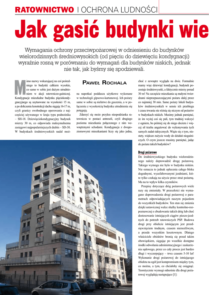 RATOWNICTWO I OCHRONA LUDNOŚCI Jak gasić budynki wiel Wymagania ochrony przeciwpożarowej w odniesieniu do budynków wielorodzinnych średniowysokich (od pięciu do dziewięciu kondygnacji) wyraźnie rosną w porównaniu do wymagań dla budynków niskich, jednak nie tak, jak byśmy się spodziewali. M imo nazwy wskazującej na coś pośredniego to budynki całkiem wysokie, co samo w sobie jest dużym utrudnieniem w akcji ratowniczo-gaśniczej. Kondygnacje mieszkalne budynku pięciokondygnacyjnego są usytuowane na wysokości 15 m, a po doliczeniu konstrukcji dachu sięgają 16-17 m, czyli granicy swobodnego operowania z najczęściej używanego w kraju typu podnośnika – SH-18. Dziewięciokondygnacyjny budynek mierzy 30 m, co odpowiada maksymalnemu zasięgowi najpopularniejszych drabin – SD-30. W budynkach średniowysokich nadal moż- Paweł Rochala na napotkać poddasza użytkowe wykonane w technologii gipsowo-kartonowej. Ich pożary same w sobie są niełatwe do gaszenia, a w połączeniu z wysokością budynku utrudnienia się potęgują. Zdarzyć się może przykra niespodzianka ratownicza w postaci antresoli, czyli drugiego poziomu mieszkania połączonego z nim wewnętrznymi schodami. Kondygnacja z dwupoziomowymi mieszkaniami liczy się jako jedna, choć z zewnątrz wygląda na dwie. Formalnie mamy więc dziewięć kondygnacji, budynek pozostaje średniowysoki, a faktycznie mierzy ponad 30 m! Na szczęście mieszkania są małymi twierdzami nieprzepuszczającymi pożaru dalej przez co najmniej 30 min. Same pożary lokali budynków średniowysokich w sensie ich przebiegu i czasu trwania nie różnią się niczym od pożarów w budynkach niskich. Musimy jednak pamiętać, że im wyżej coś się pali, tym trudniej walczyć z ogniem, bo później się do niego dociera i więcej sił trzeba angażować do wykonywania tych samych zadań taktycznych. Wiąże się z tym, niestety, większe zużycie wody do działań niegaśniczych. O czym jeszcze musimy pamiętać, jadąc do pożaru takich budynków? Drogi pożarowe Do średniowysokiego budynku wielorodzinnego należy doprowadzić drogę pożarową. Takiego wymogu nie było w budynku niskim. Nie oznacza to jednak oplecenia całego bloku dogodnymi, wyasfaltowanymi jezdniami, które tylko czekają na użycie przez straż pożarną. Ma na to wpływ kilka czynników. Przepisy dotyczące dróg pożarowych wiele razy się zmieniały. W przeszłości nie wymagano doprowadzenia drogi pożarowej o parametrach odpowiadających naszym pojazdom do wszystkich budynków. Ten stan się zmienia dzięki ustawicznej walce służby kontrolno-rozpoznawczej o zbudowanie takich dróg lub choć dostosowanie istniejących ciągów pieszo-jezdnych do potrzeb ratowniczych PSP. Budowa drogi przy obiekcie istniejącym jest przedsięwzięciem trudnym, czasem niemożliwym, a przede wszystkim kosztownym. Dlatego właściciele obiektów bronią się przed takim obowiązkiem, sięgając po wszelkie dostępne środki odwołania administracyjnego i zaskarżenia sądowego, przez co cały proces jest bardzo długi i wyczerpujący – trwa czasem 5-10 lat! Wykonanie drogi pożarowej do istniejącego obiektu na ogół jest kompromisem między tym, co można, a tym, co chciałoby się osiągnąć. Teoretycznie wymogi odnośnie dla drogi pożarowej wyglądają następująco [1]: 22 5/2013 elorodzinne (cz. 4) powinna przebiegać wzdłuż dłuższego boku budynku (…) na całej jego długości, a w przypadku gdy krótszy bok budynku ma więcej niż 60 m – z jego dwóch stron; bliższa krawędź drogi pożarowej musi być oddalona od ściany budynku o 5-15 m; pomiędzy tą drogą i ścianą budynku nie mogą występować stałe elementy zagospodarowania terenu lub drzewa i krzewy o wysokości przekraczającej 3 m; powinna zapewniać przejazd bez cofania lub być zakończona placem manewrowym o wymiarach 20 m x 20 m, względnie można przewidzieć inne rozwiązania umożliwiające zawrócenie pojazdu; jej minimalna szerokość powinna wynosić co najmniej 4 m, a jej nachylenie podłużne nie może przekraczać 5%; przejazdy na dziedzińce i inne tereny obudowane powinny odpowiadać następującym warunkom: – wysokość przejazdu nie mniejsza niż 4,2 m, – szerokość przejazdu nie mniejsza niż 3,6 m. W praktyce trzeba liczyć się z tym, że jedyną drogą pożarową do budynku będzie ulica, przy której on stoi, w dodatku z ograniczeniami w postaci słupów, sieci elektrycznych, drzew i parkujących samochodów. Funkcję drogi pożarowej może też pełnić tzw. ciąg pieszo-jezdny, zastawiony w całości samochodami, szczególnie w porze nocnej. Jeśli chodzi o parkujące samochody, zawsze istnieje możliwość ich usunięcia, podyktowana stanem wyższej konieczności, niezależnie od tego, czy pasujący nam kawałek jezdni jest drogą pożarową, czy nie – ale później PSP musi płacić odszkodowanie. Parkowanie pojazdów na drodze odpowiednio oznakowanej jest wykroczeniem, więc ich usuwanie w asyście policji czy straży gminnej lub miejskiej jest dużo łatwiejsze, a i czynności odszkodowawcze nie są dla właścicieli pojazdów takie proste. Właściciele samochodów muszą też liczyć się z oskarżeniem o utrudnianie akcji ratowniczo-gaśniczej. Po więcej informacji na ten temat odsyłam do artykułu pt. „Strażak egzekutor” (PP 10/12 i 11/12). Niezależnie od warunków najistotniejszą kwestią w dotarciu do budynku jest wcześniejsze zapoznanie się nie tylko ze stanem wiodących do niego dróg, lecz także możliwych miejsc rozstawienia sprzętu. Musimy pamiętać, że nawet jeśli jest droga pożarowa, to zgodnie z przepisami poprowadzono ją tylko przy jednym – dłuższym boku; dobrze, jeśli od strony wejść do klatek schodowych. Oznacza to, że do trzech boków budynku, czyli do jego trzech elewacji, nie będzie żadnego wymaganego przepisami dostępu, bo nie musi go być. Taka sytuacja nie zwalnia jednak z prób dotarcia do tych miejsc, g