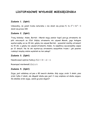 LISTOPADOWE WYDANIE MIESIĘCZNIKA Zadanie 1. (3pkt) Udowodnij, że jeżeli liczba naturalna n nie dzieli się przez 5, to dzieli się przez 100 Zadanie 2. (3pkt) Trzej koledzy: Adam, Bartek i Marek mają zamiar kupić porcję atramentu do piór wiecznych za 22zł. Gdyby atramentu nie używał Marek, jego kolegom wystarczyłby on na 30 dni; gdyby nie używał Bartek - pozostali mieliby atrament na 15 dni; a gdyby nie używał atramentu Adam, to wspólnicy wyczerpaliby zapas po 12 dniach. Na ile dni wystarczy atramentu wszystkim trzem i jak powinni rozłożyć między siebie wydatek na ten zakup? Zadanie 3. (2pkt) Naszkicować wykres funkcji Rozwiązać nierówność Zadanie 4. (2pkt) Zając jest oddalony od psa o 80 swoich skoków. Gdy zając zrobi 3 skoki, pies zrobi tylko 2 skoki, ale długość skoku psa jest 2 razy większa od skoku zająca. Ile skoków zrobi zając, zanim go pies dogoni?