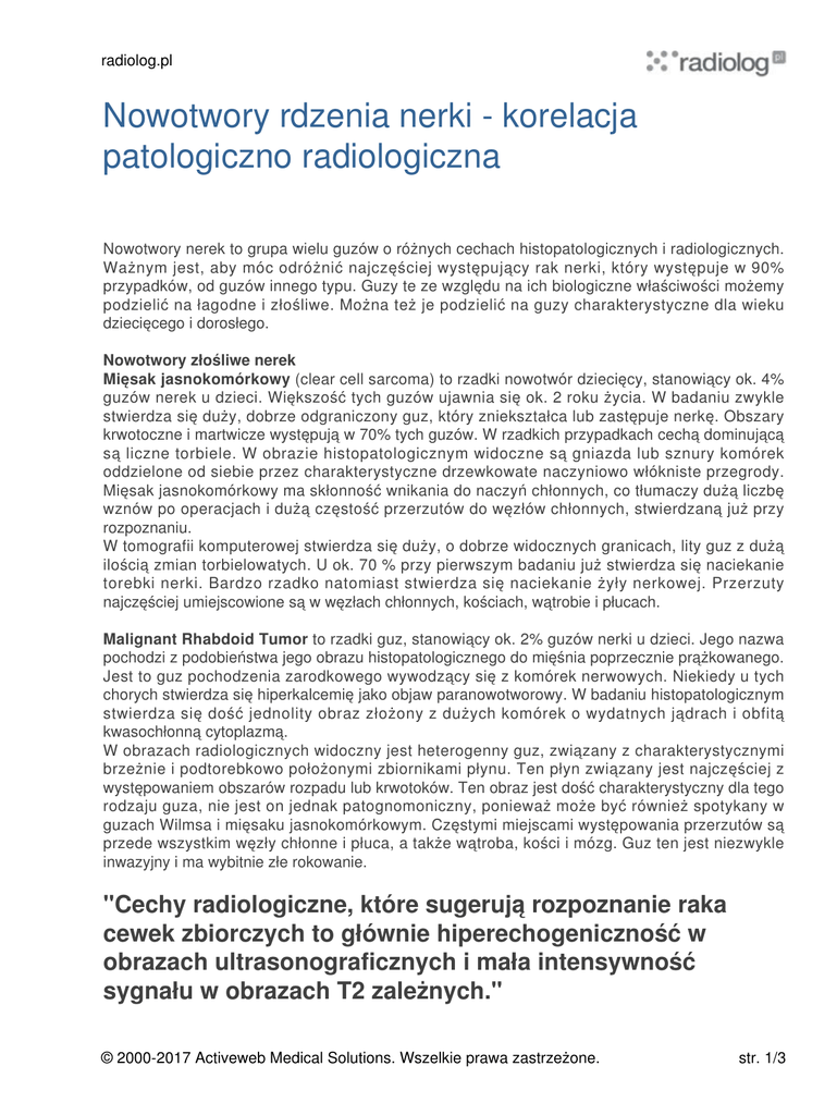 radiolog.pl Nowotwory rdzenia nerki - korelacja patologiczno radiologiczna Nowotwory nerek to grupa wielu guzów o różnych cechach histopatologicznych i radiologicznych. Ważnym jest, aby móc odróżnić najczęściej występujący rak nerki, który występuje w 90% przypadków, od guzów innego typu. Guzy te ze względu na ich biologiczne właściwości możemy podzielić na łagodne i złośliwe. Można też je podzielić na guzy charakterystyczne dla wieku dziecięcego i dorosłego. Nowotwory złośliwe nerek Mięsak jasnokomórkowy (clear cell sarcoma) to rzadki nowotwór dziecięcy, stanowiący ok. 4% guzów nerek u dzieci. Większość tych guzów ujawnia się ok. 2 roku życia. W badaniu zwykle stwierdza się duży, dobrze odgraniczony guz, który zniekształca lub zastępuje nerkę. Obszary krwotoczne i martwicze występują w 70% tych guzów. W rzadkich przypadkach cechą dominującą są liczne torbiele. W obrazie histopatologicznym widoczne są gniazda lub sznury komórek oddzielone od siebie przez charakterystyczne drzewkowate naczyniowo włókniste przegrody. Mięsak jasnokomórkowy ma skłonność wnikania do naczyń chłonnych, co tłumaczy dużą liczbę wznów po operacjach i dużą częstość przerzutów do węzłów chłonnych, stwierdzaną już przy rozpoznaniu. W tomografii komputerowej stwierdza się duży, o dobrze widocznych granicach, lity guz z dużą ilością zmian torbielowatych. U ok. 70 % przy pierwszym badaniu już stwierdza się naciekanie torebki nerki. Bardzo rzadko natomiast stwierdza się naciekanie żyły nerkowej. Przerzuty najczęściej umiejscowione są w węzłach chłonnych, kościach, wątrobie i płucach. Malignant Rhabdoid Tumor to rzadki guz, stanowiący ok. 2% guzów nerki u dzieci. Jego nazwa pochodzi z podobieństwa jego obrazu histopatologicznego do mięśnia poprzecznie prążkowanego. Jest to guz pochodzenia zarodkowego wywodzący się z komórek nerwowych. Niekiedy u tych chorych stwierdza się hiperkalcemię jako objaw paranowotworowy. W badaniu histopatologicznym stwierdza się dość jednolity obraz złożony z dużych komórek o wydatnych jądrach i obfitą kwasochłonną cytoplazmą. W obrazach radiologicznych widoczny jest heterogenny guz, związany z charakterystycznymi brzeżnie i podtorebkowo położonymi zbiornikami płynu. Ten płyn związany jest najczęściej z występowaniem obszarów rozpadu lub krwotoków. Ten obraz jest dość charakterystyczny dla tego rodzaju guza, nie jest on jednak patognomoniczny, ponieważ może być również spotykany w guzach Wilmsa i mięsaku jasnokomórkowym. Częstymi miejscami występowania przerzutów są przede wszystkim węzły chłonne i płuca, a także wątroba, kości i mózg. Guz ten jest niezwykle inwazyjny i ma wybitnie złe rokowanie. "Cechy radiologiczne, które sugerują rozpoznanie raka cewek zbiorczych to głównie hiperechogeniczność w obrazach ultrasonograficznych i mała intensywność sygnału w obrazach T2 zależnych." © 2000-2017 Activeweb Medical Solutions. Wszelkie prawa zastrzeżone. str. 1/3 radiolog.pl Rak cewek zbiorczych (Collecting duct carcinoma) stanowi ok. 1% złośliwych nowotworów nerek stwierdzanych u dorosłych. Ten guz w obrazie histopatologicznym charakteryzuje się wzrostem cewkowo brodawkowatym, nacieczeniem przez neutrofile i niekiedy produkcją śluzu. Większość z tych nowotworów wykazuje sporą złośliwość, u 40% pacjentów już przy rozpoznaniu stwierdza się przerzuty. W obrazach radiologicznym guzy te mogą mieć różnorodny wygląd. Mogą one przedstawiać się jako wzrastające ekspansywnie lub naciekająco. W ultrasonografii może być jednorodnie hiper- lub hipoechogenny w stosunku do nerki. W CT masa guza jest gorzej cieniująca od otoczenia i mało unaczyniona. U ok. 25% pacjentów stwierdza się zwapnienia. W MR sygnał w obrazach T1 zależnych może być różnej intensywności, z natomiast w T2 zależnych jest zwykle hipointensywny. Mogą być stwierdzane zmiany torbielowate z przyściennymi guzkami. Cechy radiologiczne, które sugerują rozpoznanie raka cewek zbiorczych to głównie hiperechogeniczność w obrazach ultrasonograficznych i mała intensywność sygnału w obrazach T2 zależnych. Jest to nowotwór o dużej złośliwości i złym rokowaniu. Rak rdzeniasty nerki (Renal medullary carcinoma) jest bardzo złośliwym nowotworem rozwijającym się u młodych osób (2-4 dekada). Zbudowany jest z komórek o sierpowatym kształcie, poza tym ma on wiele wspólnych histopatologicznych cech z opisanym powyżej rakiem cewek zbiorczych, takich jak naciek zapalny i produkcja śluzu. Nowotwór ten powoduje stałe niedotlenienie w środowisku rdzenia nerki, który prowadzi do nasilonej proliferacji nabłonka przejściowego cewek zbiorczych i brodawek nerkowych. Rak rdzeniasty nerki zwykle lokalizuje się centralnie i zwykle ma kilka satelitarnych guzków w korze i wnęce. Zwykle w obrębie guza stwierdza się ogniska krwotoczne i martwicze. Przerzuty najczęściej zlokalizowane są w węzłach chłonnych, płucach, nadnerczach i wątrobie. W CT widoczny jest zwykle guz wychodzący z rdzenia nerki i intensywnie naciekający sąsiedztwo. Rak przejściowokomórkowy zlokalizowany w obrębie miedniczki nerkowej jest niezwykle rzadkim nowotworem. Zwykle wiodącym objawem jest bezobjawowy krwinkomocz. Daje przerzuty do regionalnych węzłów chłonnych, wątroby i płuc. Charakterystyczną cechą jest wieloogniskowość zmian. Większość tych nowotworów rośnie w sposób egzofityczny. W obrazie histopatologicznym dominują komórki układające się w gniazda i sznury. W obrazach radiologicznych nowotwór ten widoczny jest w miedniczce nerkowej i może szerzyć się do rdzenia nerki. W USG zwykle wykazują mieszany hiper- i hipoechogeniczny obraz. W CT charakteryzują się słabym wzmocnieniem kontrastowym, natomiast w MR wykazują heterogenny sygnał w T1 i T2 zależnych obrazach. Pierwotny mięsak nerki jest rzadkim guzem st