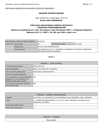 Strona 1 z 7 Identyfikator wydruku: RP/386709/10/20161201143716 CENTRALNA INFORMACJA KRAJOWEGO REJESTRU SĄDOWEGO KRAJOWY REJESTR SĄDOWY Stan na dzień 01.12.2016 godz. 14:37:16 Numer KRS: 0000386709 Informacja odpowiadająca odpisowi aktualnemu Z REJESTRU PRZEDSIĘBIORCÓW pobrana na podstawie art. 4 ust. 4aa ustawy z dnia 20 sierpnia 1997 r. o Krajowym Rejestrze Sądowym (Dz. U. z 2007 r. Nr 168, poz.1186, z późn. zm.) Data rejestracji w Krajowym Rejestrze Sądowym 19.05.2011 Ostatni wpis Numer wpisu 10 Sygnatura akt WA.XII NS-REJ.KRS/66596/16/287 Oznaczenie sądu SĄD REJONOWY DLA M. ST. WARSZAWY W WARSZAWIE, XII WYDZIAŁ GOSPODARCZY KRAJOWEGO REJESTRU SĄDOWEGO Data dokonania wpisu 19.10.2016 Dział 1 Rubryka 1 - Dane podmiotu 1.Oznaczenie formy prawnej SPÓŁKA AKCYJNA 2.Numer REGON/NIP REGON: 301744029, NIP: 7811864293 3.Firma, pod którą spółka działa WALUCIARZ.PL SPÓŁKA AKCYJNA 4.Dane o wcześniejszej rejestracji ------ 5.Czy przedsiębiorca prowadzi działalność gospodarczą z innymi podmiotami na podstawie umowy spółki cywilnej? NIE 6.Czy podmiot posiada status organizacji pożytku publicznego? NIE Rubryka 2 - Siedziba i adres podmiotu 1.Siedziba kraj POLSKA, woj. MAZOWIECKIE, powiat WARSZAWA, gmina WARSZAWA, miejsc. WARSZAWA 2.Adres ul. STANISŁAWA NOAKOWSKIEGO, nr 12, lok. 61, miejsc. WARSZAWA, kod 00-666, poczta WARSZAWA, kraj POLSKA 3.Adres poczty elektronicznej ------ 4.Adres strony internetowej ------ Rubryka 3 - Oddziały Brak wpisów Strona 2 z 7 Identyfikator wydruku: RP/386709/10/20161201143716 Rubryka 4 - Informacje o statucie 1.Informacja o sporządzeniu lub zmianie statutu 1 01.04.2011 R., REP. A NR 3184/2011, NOTARIUSZ WOJCIECH KWARCIŃSKI, KANCELARIA NOTARIALNA W POZNANIU. 2 30.12.2013 R., REP. A NR 7665/2013, NOTARIUSZ AGNIESZKA SZTYLAK, KANCELARIA NOTARIALNA W POZNANIU PRZY UL. GARBARY 95 WEJŚCIE C LOK.7 ZMIENIONO § 1, § 3, § 6 STATUTU 3 30.12.2013 R., REP. A NR 7665/2013, NOTARIUSZ AGNIESZKA SZTYLAK PROWADZĄCA KANCELARIĘ NOTARIALNĄ W POZNANIU PRZY UL. GARBARY 95, WEJŚCIE C, LOKAL NUMER 7, ZMIENIONO § 5 STATUTU SPÓŁKI. 05.03.2014 R., REP. A NR 1347/2014, NOTARIUSZ AGNIESZKA SZTYLAK PROWADZĄCA KANCELARIĘ NOTARIALNĄ W POZNANIU PRZY UL. GARBARY 95, WEJŚCIE C, LOKAL NUMER 7, PRZYJĘTO JEDNOLITY TEKST STATUTU SPÓŁKI. 4 25.08.2015 R., REP. A NR 5865/2015, NOTARIUSZ AGNIESZKA ZIELIŃSKA-JAROCHA, KANCELARIA NOTARIALNA W POZNANIU, ZMIANA: § 1 PKT. 4. 24.09.2015 R., REP. A NR 6739/2015, NOTARIUSZ AGNIESZKA ZIELIŃSKA-JAROCHA, KANCELARIA NOTARIALNA W POZNANIU, ZMIANA: § 5 UST. 1, § 5 UST. 2, § 5 UST. 2B, § 8 UST. 1, § 9 UST. 1, DODANO: § 9 UST. 1A. Rubryka 5 1.Czas, na jaki została utworzona spółka NIEOZNACZONY 2.Oznaczenie pisma innego niż Monitor Sądowy i Gospodarczy, przeznaczonego do ogłoszeń spółki ------ 4.Czy statut przyznaje uprawnienia osobiste określonym akcjonariuszom lub tytuły uczestnictwa w dochodach lub majątku spółki nie wynikających z akcji? NIE 5.Czy obligatoriusze mają prawo do udziału NIE w zysku? Rubryka 6 - Sposób powstania spółki Brak wpisów Rubryka 7 - Dane jedynego akcjonariusza Brak wpisów Rubryka 8 - Kapitał spółki 1.Wysokość kapitału zakładowego 1 960 785,00 ZŁ 2.Wysokość kapitału docelowego ------ 3.Liczba akcji wszystkich emisji 1960785 4.Wartość nominalna akcji 1,00 ZŁ 5.Kwotowe określenie części kapitału wpłaconego 1 960 785,00 ZŁ 6.Wartość nominalna warunkowego podwyższenia ------ Strona 3 z 7 Identyfikator wydruku: RP/386709/10/20161201143716 kapitału zakładowego Podrubryka 1 Informacja o wniesieniu aportu 1.Określenie wartości akcji objętych za aport 1 960 785,00 ZŁ Rubryka 9 - Emisja akcji 1 2 1.Nazwa serii akcji A 2.Liczba akcji w danej serii 1000000 3.Rodzaj uprzywilejowania i liczba akcji uprzywilejowanych lub informacja, że akcje nie są uprzywilejowane AKCJE NIE SĄ UPRZYWILEJOWANE 1.Nazwa serii akcji AKCJE NA OKAZICIELA SERIA B 2.Liczba akcji w danej serii 960785 3.Rodzaj uprzywilejowania i liczba akcji uprzywilejowanych lub informacja, że akcje nie są uprzywilejowane AKCJE NIE SĄ UPRZYWILEJOWANE Rubryka 10 - Wzmianka o podjęciu uchwały o emisjach obligacji zamiennych Brak wpisów Rubryka 11 1.Czy zarząd lub rada administrująca są upoważnieni do emisji warrantów subskrypcyjnych? NIE Dział 2 Rubryka 1 - Organ uprawniony do reprezentacji podmiotu 1.Nazwa organu uprawnionego do reprezentowania podmiotu ZARZĄD 2.Sposób reprezentacji podmiotu W PRZYPADKU ZARZĄDU WIELOOSOBOWEGO DO REPREZENTOWANIA SPÓŁKI UPOWAŻNIONYCH JEST DWÓCH CZŁONKÓW ZARZĄDU ŁĄCZNIE LUB JEDEN CZŁONEK ZARZĄDU ŁĄCZNIE Z PROKURENTEM. Podrubryka 1 Dane osób wchodzących w skład organu 1 1.Nazwisko / Nazwa lub firma PALUSZKIEWICZ 2.Imiona RAFAŁ 3.Numer PESEL/REGON 81072900496 4.Numer KRS **** Strona 4 z 7 Identyfikator wydruku: RP/386709/10/20161201143716 2 5.Funkcja w organie reprezentującym PREZES ZARZĄDU 6.Czy osoba wchodząca w skład zarządu została zawieszona w czynnościach? NIE 7.Data do jakiej została zawieszona ------ 1.Nazwisko / Nazwa lub firma LIPIEC 2.Imiona DOMINIK 3.Numer PESEL/REGON 83040700433 4.Numer KRS **** 5.Funkcja w organie reprezentującym WICEPREZES ZARZĄDU 6.Czy osoba wchodząca w skład zarządu została zawieszona w czynnościach? NIE 7.Data do jakiej została zawieszona ------ Rubryka 2 - Organ nadzoru 1 1.Nazwa organu RADA NADZORCZA Podrubryka 1 Dane osób wchodzących w skład organu 1 2 3 4 5 1.Nazwisko KUCIEL 2.Imiona TOMASZ ADAM 3.Numer PESEL 70051208856 1.Nazwisko PALUSZKIEWICZ 2.Imiona RAFAŁ 3.Numer PESEL 51110106276 1.Nazwisko ODRAKIEWICZ 2.Imiona DAVID 3.Numer PESEL 89111415493 1.Nazwisko KOWALCZYK 2.Imiona PIOTR JAN 3.Numer PESEL 83100802394 1.Nazwisko MYRNA 2.Imiona MIROSŁAW 3.Numer PESEL 76041005997 Rubryka 3 - Prokurenci Brak wpisów Dział 3 Rubryka 1 - Przedmiot działalności 1.Przedmiot przeważającej działalności 1 66, 19, Z, POZOSTAŁA DZIAŁALNOŚĆ WSPOMAGAJĄCA USŁUGI FINANSOWE, Z WYŁĄCZENI