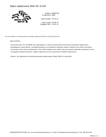 fajka zapłonowa NGK RC-X140 Indeks: SM20722 Producent: NGK Cena brutto: 79.75 zł Cena netto: 64.84 zł Podatek VAT: 14.91 zł Link do produktu: serwismotocyklowy.pl/fajka-zaplonowa-NGK-RC-X140,p,20722.html Opis produktu: Kod producenta: RC-X140NGK jest największym w świecie producentem końcówek przewodów zapłonowych, posiadającym swoje fabryki i przedstawicielstwa we wszystkich częściach świata. Produkty firmy NGK są seryjnie montowane przez wielu producentów. Firma NGK dokłada wielu starań, aby jej produkty spełniały najwyższe normy i wymagania stawiane świecom i fajkom zapłonowym do nowoczesnych silników spalinowych. Zobacz: Jak dopasować końcówkę przewodu zapłonowego (fajkę) NGK do motocykla. SERWISMOTOCYKLOWY.pl | www.serwismotocyklowy.pl | e-mail: [email protected] | tel. 606 814 814 Strona 1 z 1