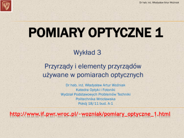 Dr hab. inż. Władysław Artur Woźniak POMIARY OPTYCZNE 1 Wykład 3 Przyrządy i elementy przyrządów używane w pomiarach optycznych Dr hab. inż. Władysław Artur Woźniak Katedra Optyki i Fotoniki Wydział Podstawowych Problemów Techniki Politechnika Wrocławska Pokój 18/11 bud. A-1 http://www.if.pwr.wroc.pl/~wozniak/pomiary_optyczne_1.html Dr hab. inż. Władysław Artur Woźniak KOLIMATORY Kolimator – przyrząd przetwarzający padające światło w równoległą wiązkę (skolimowaną) lub w wiązkę o określonej zbieżności. Padający strumień może być rozbieżny, zbieżny lub może nie mieć ustalonej zbieżności. Kolimator jest zwykle częścią składową większych przyrządów. (Wikipedia) Kolimator – instrument optyczny tworzący obrazy punktów lub testów w bardzo dużej odległości; używa się ich do pomiaru i kontroli charakterystyk różnych przyrządów optycznych. Składa się on z bardzo dobrze skorygowanego, długoogniskowego obiektywu, w którego płaszczyźnie ogniskowej przedmiotowej znajduje się płytka ogniskowa. (Hanc) Kolimator = „urównoleglacz”?! Dr hab. inż. Władysław Artur Woźniak KOLIMATORY Kolimator składa się z bardzo dobrze skorygowanego, długoogniskowego obiektywu Ob, w którego płaszczyźnie ogniskowej przedmiotowej znajduje się płytka ogniskowa Pk. Oba te elementy w najprostszym przypadku znajdują się w rurze, przy czym oprawa płytki ogniskowej może być przesuwana w płaszczyźnie prostopadłej do osi kolimatora (po co?). Dr hab. inż. Władysław Artur Woźniak KOLIMATORY Oświetlacz zapewnia równomierne oświetlenie płytki ogniskowej. Składa się on najczęściej z dwóch płasko-wypukłych soczewek, zwróconych do siebie wypukłościami (kondensor). Soczewki te powinny znajdować się jak najbliżej płytki ogniskowej (Zwrócić uwagę na umieszczenie oprawy obiektywu na przesuwnym gwincie – po co?) Dr hab. inż. Władysław Artur Woźniak KOLIMATORY Jeśli nie stosujemy oświetlacza, to rurę kolimatora można zamknąć matówką (po co?). W wielu przypadkach między oświetlacz a płytkę ogniskową wstawia się zielony (dlaczego zielony?) filtr świetlny. Zamiast matówki można nałożyć na kolimator okular, nastawiony na ostre widzenie płytki ogniskowej (w jakim celu?). Rysunek płytki ogniskowej ustawia się w jego płaszczyźnie ogniskowej z dokładnością nie mniejszą niż 0,001 dioptrii (bo tak). Dr hab. inż. Władysław Artur Woźniak KOLIMATORY Rysunek płytki ogniskowej kolimatora wykonuje się zwykle metodą fotograficzną lub przez rysowanie na warstwie srebra i trawienie kwasem lub też napylanie (chromem) w aparaturze próżniowej. Dr hab. inż. Władysław Artur Woźniak KOLIMATORY Obiektywy kolimatorów muszą być doskonale skorygowane (na korekcję jakich aberracji należy zwrócić szczególną uwagę?) a ich zdolność rozdzielcza w zakresie wykorzystywanego pola powinna być równa teoretycznej. Dla niewielkiego pola widzenia (2-3) używane są na ogół dwusoczewkowe obiektywy aplanatyczne* o sile światła od 1:12 do 1:8 i o ogniskowej 300, 1200 i 1500 mm. Mimo niewielkiego pola widzenia kolimatora należy zwrócić uwagę na dobre skorygowanie krzywizny pola, które może być źródłem paralaksy na brzegu pola. Ogólną zasadą, która kierujemy się przy wyborze obiektywu kolimatora jest konieczność stosowania obiektywu o dłuższej ogniskowej niż ogniskowa obiektywu przyrządu sprawdzanego przy użyciu kolimatora. Im dłuższa ogniskowa obiektywu, tym „lepszą nieskończoność” daje kolimator. * Aplanat – obiektyw fotograficzny opracowany w 1866 roku w zakładach Carl August Steinheil & Söhne w Monachium, składał się z dwóch dubletów achromatycznych ustawionych symetrycznie wobec apertury. Jego projektantem był Hugo Adolf Steinheil. Użycie dwóch symetrycznych dubletów pozwoliło na wyeliminowanie większości wad optycznych (aberracja sferyczna, aberracja chromatyczna, koma i dystorsja). Dr hab. inż. Władysław Artur Woźniak KOLIMATORY Specjalny rodzaj kolimatorów: szerokokątne (pole widzenia 2w=30-45). Kolimatorów tych używa się do: - pomiarów kąta pola widzenia lunet; - sprawdzania mechanizmów pomiaru kąta w przyrządach celowniczych; - sprawdzania „martwych” ruchów przyrządach celowniczych; - sprawdzania kątowej wartości działek w tychże przyrządach. Kolimatory te muszą mieć bardzo dobrze skorygowane wszystkie aberracje osiowe i pozaosiowe (w szczególności dystorsję, krzywiznę pola i astygmatyzm). Dr hab. inż. Władysław Artur Woźniak KOLIMATORY Ustawianie kolimatorów „na nieskończoność”: 1) Autokolimacja (patrz: lunety autokolimacyjne); 2) Obserwacja bardzo dalekiego punktu; 3) Metoda pentagonu i lunety; 4) Metoda trzech kolimatorów. Można pokazać, że dokładność ustawienia kolimatora „na nieskończoność” zależy od wielkości źrenicy wyjściowej. Ad. 3) Stosowana do ustawiania kolimatorów o dużej średnicy. Dr hab. inż. Władysław Artur Woźniak LUNETY Podstawowa konfiguracja lunet używanych w pomiarach: Keplera. Czasami zaopatruje się ją w układ odwracający – ale w praktyce rzadko (czemu?). Lunety instrumentów geodezyjnych wyposażone są w wewnętrzne układy ogniskujące lub (rzadziej) przesuwną poosiowo część okularową wraz z płytką ogniskową. (Po co ta zmiana ogniskowej?) Stosunkowo rzadko w przyrządach mierniczych stosuje się tzw. lunety pankratyczne o zmiennym powiększeniu. Lunety takie umożliwiają ciągłą zmianę powiększenia bez przerywania obserwacji. Dr hab. inż. Władysław Artur Woźniak LUNETY Przyrządy kontrolno-justerskie zaopatrzone są zwykle w najprostsze lunety typu Keplera, składające się z dodatniego obiektywu i okularu oraz płytki ogniskowej. Oprawa obiektywu stanowi najczęściej źrenicę wejściową i przesłonę aperturową. Oprawa płytki ogniskowej określa z kolei kąt pola widzenia lunety (jaka to przesłona?). Zdolność rozdzie