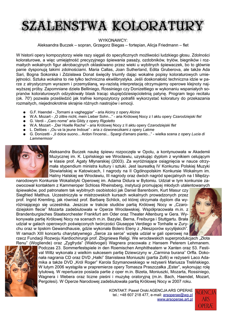 SZALENSTWA KOLORATURY WYKONAWCY: Aleksandra Buczek – sopran, Grzegorz Biegas – fortepian, Alicja Friedmann – flet W historii opery kompozytorzy wiele razy sięgali do specyficznych możliwości ludzkiego głosu. Zdolności koloraturowe, a więc umiejętność precyzyjnego śpiewania pasaży, ozdobników, trylów, biegników i rozmaitych wokalnych figur akrobacyjnych oklaskiwano przez wieki u wybitnych śpiewaczek, bo to głównie panie dysponują takimi zdolnościami. Maria Callas, Joan Sutherland, Edita Gruberova, ale także Ada Sari, Bogna Sokorska i Zdzisława Donat święciły triumfy dając wokalne popisy koloraturowych umiejętności. Sztuka wokalna to nie tylko techniczna ekwilibrystyka. Jeśli doskonałość techniczna idzie w parze z atrystycznym wyrazem i przemyślaną, wy-razistą interpretacją otrzymujemy operowe klejnoty najwyższej próby. Zapomniane dzieła Belliniego, Rossiniego czy Donizettiego w wykonaniu wspaniałych sopranów koloraturowych odzyskiwały blask tracąc stupięćdziesięcioletnią patynę. Program tego recitalu (ok. 70') pozwala prześledzić jak trafnie kompozytorzy potrafili wykorzystać koloratury do przekazania rozmaitych, niejednokrotnie skrajnie różnych nastrojów i emocji. ● ● ● ● ● ● G.F. Haendel - „Tornami a vagheggiar” - aria Alciny z opery Alcina W.A. Mozart - „O zittre nicht, mein Lieber Sohn...” - aria Królowej Nocy z I aktu opery Czarodziejski flet G. Verdi - „Caro nome” aria Gildy z opery Rigoletto W.A. Mozart - „Der Hoelle Rache” - aria Królowej Nocy z II aktu opery Czarodziejski flet L. Delibes - „Ou va la jeune Indoue” - aria z dzwoneczkami z opery Lakme G. Donizetti - „Il dolce suono... Ardon l'incensi... Spargi d'amaro pianto...” - wielka scena z opery Lucia di Lammermoor Aleksandra Buczek naukę śpiewu rozpoczęła w Opolu, a kontynuowała w Akademii Muzycznej im. K. Lipińskiego we Wrocławiu, uzyskując dyplom z wynikiem celującym w klasie prof. Agaty Młynarskiej (2003). Za wyróżniające osiągnięcia w nauce otrzymała stypendium ministra kultury i sztuki. Jest laureatką IV Konkursu Polskiej Muzyki Słowiańskiej w Katowicach, I nagrody na II Ogólnopolskim Konkursie Wokalnym im. Haliny Halskiej we Wrocławiu, III nagrody oraz dwóch nagród specjalnych na I Międzynarodowym Konkursie Wokalistyki Operowej im. Adama Didura w Bytomiu. Udział w tym konkursie zaowocował kontaktem z Kammeroper Schloss Rheinsberg, instytucji promującej młodych utalentowanych śpiewaków, pod patronatem tak wybitnych osobistości jak Daniel Barenboim, Kurt Masur czy Siegfried Matthus. Uczestniczyła w mistrzowskich kursach wokalnych prowadzonych przez prof. Ingrid Kremling, jak również prof. Barbarę Schlick, od której otrzymała dyplom dla wyróżniającego się uczestnika. Jeszcze w trakcie studiów partią Królowej Nocy w „Czarodziejskim flecie” Mozarta zadebiutowała w Operze Wrocławskiej. Współpracowała m.in. z Brandenburgisches Staatsorchester Frankfurt am Oder oraz Theater Altenburg w Gera. Wykonywała partię Królowej Nocy na scenach m.in. Bazylei, Berna, Freiburga i Stuttgartu. Brała udział w galach operowych poświęconych twórczości Giuseppe Verdiego w Tonhalle w Zurychu oraz w lipskim Gewandhausie, gdzie wykonała Bolero Eleny z „Nieszporów sycylijskich”. W ramach XIII koncertu charytatywnego „Serce za serce” wzięła udział w gali operowej na rzecz Fundacji Rozwoju Kardiochirurgii prof. Zbigniewa Religi. We wrocławskich superprodukcjach „Złota Renu” (Wogliende) oraz „Zygfryda” (Waldvogel) Wagnera pracowała z Hansem Peterem Lehmanem. Podczas 23. Sommerfestspiele in den Roemischen Amphitheatern w Xanten oraz 53. Festival Wiltz wykonała z wielkim sukcesem partię Dziewczyny w „Carmina burana” Orffa. Dokonała nagrania CD oraz DVD „Halki” Stanisława Moniuszki (partia Zofii) w reżyserii Laco Adamika a także DVD „Król Roger” Karola Szymanowskiego w reżyserii Mariusza Trelińskiego. W lutym 2006 wystąpiła w prapremierze opery Tomasza Praszczałka „Ester”, wykonując rolę tytułową. W repertuarze posiada partie z oper m.in. Bizeta, Moniuszki, Mozarta, Rossiniego, Wagnera i Webera oraz liczne pieśni i muzykę oratoryjną (m.in. Bach, Haendel, Mozart, Pergolesi). W Operze Narodowej zadebiutowała partią Królowej Nocy w 2007 roku. KONTAKT: Paweł Orski AGENCJA ARS OPERAE tel.: +48 607 218 477, e-mail: [email protected] www.arsoperae.art.pl