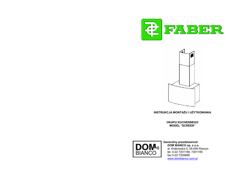 INSTRUKCJA MONTAśU I UśYTKOWANIA OKAPU KUCHENNEGO MODEL “SCREEN” Generalny przedstawiciel DOM BIANCO sp. z o.o. al. Krakowska 5, 05-090 Raszyn tel. 0-22 7201198, 7201199 fax 0-22 7200688 www.dombianco.com.pl -1Spis treści 1. Zalecenia i rady 2. Opis 3. MontaŜ 4. UŜytkowanie 5. Obsługa bieŜąca - 14 - 2 4 6 10 11 Symbol umieszczony na wyrobie lub jego opakowaniu oznacza, Ŝe dany sprzęt po zuŜyciu nie moŜe być traktowany jako odpad komunalny. Powinien być dostarczony do odpowiedniego punktu skupu i recyklingu sprzętu elektrycznego i elektronicznego. Zapewniając prawidłową utylizacje zuŜytego urządzenia pomagamy w zapobieganiu niepoŜądanym konsekwencjom dla środowiska i zdrowia ludzi, które mogłyby powstać w przypadku nieodpowiedniego pozbycia się urządzenia. Więcej szczegółów na temat utylizacji danego sprzętu uzyskacie Państwo w organach samorządu terytorialnego i lokalnej administracji państwowej lub w sklepie, w którym wyrób został zakupiony. Zagadnienia utylizacji tego typu wyrobów w Rzeczpospolitej Polskiej reguluje ustawa z dnia 19 lipca 2005 r. o zuŜytym sprzęcie elektrycznym i elektronicznym wraz z późniejszymi zmianami zgodna z odpowiednią dyrektywą Unii Europejskiej. - 13 Wymiana filtrów • Otworzyć panele Comfort pociągając je w dół. • Wyjąć metalowe filtry przeciw tłuszczowe. • Wyjąć nasycone filtry węglowe w sposób pokazany za pomocą strzałki A. • ZałoŜyć nowe filtry (B). • Zamontować metalowe filtry przeciw tłuszczowe. • Zamknąć panele Comfort. Oświetlenie Wymiana lampek Lampki halogenowe o mocy 20 W. • • Wyjąć osłonki lampek mocowane na zatrzask podwaŜając metalowy pierścień i podtrzymując go jedną ręką. • Wyjąć przepaloną lampkę halogenową z obejmy delikatnie ją ciągnąc. • ZałoŜyć nową lampkę tego samego typu upewniając się, Ŝe oba druciki są prawidłowo umieszczone w obudowie lampki. • ZałoŜyć zatrzaskowy pierścień podtrzymujący. Świetlówki o mocy 11 W. • Wykręcić wkręty mocujące szybkę osłaniającą świetlówkę • Otworzyć panel Comfort i wyjąć filtr przeciw tłuszczowy. • Od wnętrza korpusu okapu jedną ręką przesunąć górną część obejmy świetlówki w celu wyjęcia szybki. • Przesunąć szybkę do przodu aŜ do uwolnienia spodniej jej części tak, aby było moŜliwe jej wyjęcie. • Usunąć szybkę i wymienić świetlówkę na nową o takich samych parametrach. • ZałoŜyć szybkę wykonując powyŜsze czynności w odwrotnej kolejności. -2- 1. ZALECENIA I RADY Niniejsza instrukcja jest opracowana dla wielu wersji urządzenia. W związku z tym mogą się w niej znajdować opisy poszczególnych cech, które nie występują w zakupionym przez Państwa okapie. MontaŜ • Producent i Generalny Przedstawiciel nie ponoszą Ŝadnej odpowiedzialności prawnej i/lub materialnej za szkody powstałe w wyniku niewłaściwego montaŜu okapu. • Minimalna bezpieczna odległość między najwyŜszym punktem płyty grzewczej (gazowej, elektrycznej, ceramicznej) a dolną powierzchnią okapu wynosi 650 mm. • NaleŜy skontrolować, czy napięcie prądu w domowej instalacji elektrycznej odpowiada wskazanemu na tabliczce znamionowej umieszczonej wewnątrz korpusu okapu. • W przypadku urządzeń I klasy ochrony elektrycznej naleŜy sprawdzić, czy domowa instalacja elektryczna jest odpowiednio uziemiona i czy uziemienie funkcjonuje prawidłowo. Okap naleŜy podłączać do właściwych kanałów wentylacyjnych za pomocą rur o średnicy wynoszącej co najmniej 120 mm (lub rur o prostokątnych o równowaŜnym polu przekroju poprzecznego). Nie wolno podłączać okapu do przewodów dymowych, do których podłączone są teŜ urządzenia spalające inne paliwa (podgrzewacze wody, piece c.o., kominki itp.). JeŜeli okap jest uŜywany w jednym pomieszczeniu z innymi urządzeniami nie zasilanymi energią elektryczną (np. urządzenia spalające gaz) naleŜy zapewnić dopływ do pomieszczenia odpowiedniej ilości powietrza w celu zapobieŜenia nawrotowi spalin. Kuchnia musi być wyposaŜona w odpowiednie otwory ścienne prowadzące bezpośrednio na otwartą przestrzeń, co zapewnia napływ czystego powietrza. • • • -3UŜytkowanie • Okap kuchenny został zaprojektowany wyłącznie w celu usuwania z pomieszczeń kuchennych nieprzyjemnych zapachów powstających podczas przyrządzania potraw. • Nigdy nie naleŜy uŜywać okapu do celów innych, niŜ te, dla których został zaprojektowany. • Nigdy nie wolno pozostawiać wysokiego nieosłoniętego płomienia pod okapem w czasie jego działania. • NaleŜy wysokość płomienia regulować tak, aby znajdował się on tylko w obrysie dna naczynia ustawionego na palniku, i upewniać się, czy płomień nie wystaje poza naczynie. • Podczas smaŜenia w głębokim tłuszczu naleŜy cały czas kontrolować proces smaŜenia – przegrzany olej moŜe ulec zapaleniu. • Nie wolno pod okapem przygotowywać potraw flambowanych – grozi to powstaniem poŜaru. • Zakupione urządzenie nie moŜe być obsługiwane przez osoby (włącznie z dziećmi) o ograniczonych zdolnościach psychicznych lub nie mające doświadczenia i odpowiedniej wiedzy, o ile nie zostaną one właściwie przeszkolone i będą wykonywać czynności pod odpowiednią kontrolą z zapewnieniem stosownego poinstruowania co do uŜytkowania urządzenia przez osobę odpowiedzialną za ich bezpieczeństwo. • Cały czas naleŜy kontrolować, czy dzieci nie próbują bawić się okapem. Obsługa bieŜąca • Przed przystąpieniem do jakichkolwiek czynności związanych z obsługą okapu naleŜy go wyłączyć lub odłączyć od źródła zasilania elektrycznego. • Filtry naleŜy czyścić i/lub wymieniać w przepisanych odstępach czasu. • Okap naleŜy czyścić za pomocą wilgotnej szmatki oraz neutralnych detergentów w płynie. - 12 Czyszczenie filtrów • Nacisnąć panele Comfort w celu otworzenia ich. • Wyją