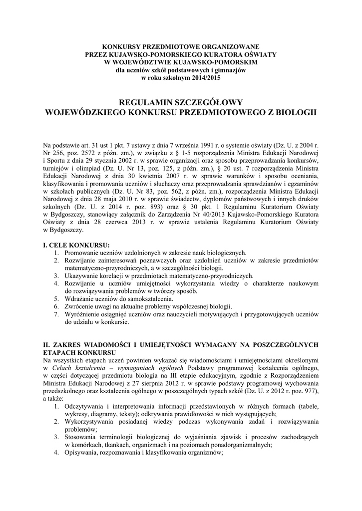 KONKURSY PRZEDMIOTOWE ORGANIZOWANE PRZEZ KUJAWSKO-POMORSKIEGO KURATORA OŚWIATY W WOJEWÓDZTWIE KUJAWSKO-POMORSKIM dla uczniów szkół podstawowych i gimnazjów w roku szkolnym 2014/2015 REGULAMIN SZCZEGÓŁOWY WOJEWÓDZKIEGO KONKURSU PRZEDMIOTOWEGO Z BIOLOGII Na podstawie art. 31 ust 1 pkt. 7 ustawy z dnia 7 września 1991 r. o systemie oświaty (Dz. U. z 2004 r. Nr 256, poz. 2572 z późn. zm.), w związku z § 1-5 rozporządzenia Ministra Edukacji Narodowej i Sportu z dnia 29 stycznia 2002 r. w sprawie organizacji oraz sposobu przeprowadzania konkursów, turniejów i olimpiad (Dz. U. Nr 13, poz. 125, z późn. zm.), § 20 ust. 7 rozporządzenia Ministra Edukacji Narodowej z dnia 30 kwietnia 2007 r. w sprawie warunków i sposobu oceniania, klasyfikowania i promowania uczniów i słuchaczy oraz przeprowadzania sprawdzianów i egzaminów w szkołach publicznych (Dz. U. Nr 83, poz. 562, z późn. zm.), rozporządzenia Ministra Edukacji Narodowej z dnia 28 maja 2010 r. w sprawie świadectw, dyplomów państwowych i innych druków szkolnych (Dz. U. z 2014 r. poz. 893) oraz § 30 pkt. 1 Regulaminu Kuratorium Oświaty w Bydgoszczy, stanowiący załącznik do Zarządzenia Nr 40/2013 Kujawsko-Pomorskiego Kuratora Oświaty z dnia 28 czerwca 2013 r. w sprawie ustalenia Regulaminu Kuratorium Oświaty w Bydgoszczy. I. CELE KONKURSU: 1. Promowanie uczniów uzdolnionych w zakresie nauk biologicznych. 2. Rozwijanie zainteresowań poznawczych oraz uzdolnień uczniów w zakresie przedmiotów matematyczno-przyrodniczych, a w szczególności biologii. 3. Ukazywanie korelacji w przedmiotach matematyczno-przyrodniczych. 4. Rozwijanie u uczniów umiejętności wykorzystania wiedzy o charakterze naukowym do rozwiązywania problemów w twórczy sposób. 5. Wdrażanie uczniów do samokształcenia. 6. Zwrócenie uwagi na aktualne problemy współczesnej biologii. 7. Wyróżnienie osiągnięć uczniów oraz nauczycieli motywujących i przygotowujących uczniów do udziału w konkursie. II. ZAKRES WIADOMOŚCI I UMIEJĘTNOŚCI WYMAGANY NA POSZCZEGÓLNYCH ETAPACH KONKURSU Na wszystkich etapach uczeń powinien wykazać się wiadomościami i umiejętnościami określonymi w Celach kształcenia – wymaganiach ogólnych Podstawy programowej kształcenia ogólnego, w części dotyczącej przedmiotu biologia na III etapie edukacyjnym, zgodnie z Rozporządzeniem Ministra Edukacji Narodowej z 27 sierpnia 2012 r. w sprawie podstawy programowej wychowania przedszkolnego oraz kształcenia ogólnego w poszczególnych typach szkół (Dz. U. z 2012 r. poz. 977), a także: 1. Odczytywania i interpretowania informacji przedstawionych w różnych formach (tabele, wykresy, diagramy, teksty); odkrywania prawidłowości w nich występujących; 2. Wykorzystywania posiadanej wiedzy podczas wykonywania zadań i rozwiązywania problemów; 3. Stosowania terminologii biologicznej do wyjaśniania zjawisk i procesów zachodzących w komórkach, tkankach, organizmach i na poziomach ponadorganizmalnych; 4. Opisywania, rozpoznawania i klasyfikowania organizmów; 5. Formułowania problemów badawczych, uogólniania, uzasadniania i weryfikowania hipotez, wnioskowania z wyników obserwacji i doświadczeń; 6. Przedstawiania i wyjaśniania zależności między organizmami oraz organizmami i środowiskiem, określenia znaczenia biologicznego tych zależności; 7. Dostrzegania i wyjaśniania związków przyczynowo -skutkowych między procesami i faktami biologicznymi, podawania argumentów uzasadniających poprawność rozumowania. Zakres merytoryczny konkursu. Uczestnicy konkursu powinni, na poszczególnych etapach, wykazać się wiadomościami i umiejętnościami obejmującymi wskazane treści Podstawy programowej kształcenia ogólnego w części dotyczącej przedmiotu biologia na III etapie edukacyjnym, zgodnie z rozporządzeniem Ministra Edukacji Narodowej z 27 sierpnia 2012 r. w sprawie podstawy programowej wychowania przedszkolnego oraz kształcenia ogólnego w poszczególnych typach szkół (Dz. U. z 2012 r. poz. 977) oraz wskazanymi wiadomościami i umiejętnościami poszerzającymi treści podstawy programowej, jak również ukazywaniem korelacji w przedmiotach matematyczno-przyrodniczych. ETAP I (szkolny) Zakres merytoryczny szkolnego etapu konkursu dotyczy treści nauczania następujących działów tematycznych podstawy programowej: 1. Pierwiastki i związki chemiczne budujące organizmy oraz pozyskiwanie i wykorzystanie energii przez organizmy; 2. Budowa i funkcjonowanie komórki; 3. Budowa i funkcjonowanie organizmu roślinnego na przykładzie rośliny okrytozalążkowej. 4. Systematyka – zasady klasyfikacji, sposoby identyfikacji i przegląd różnorodności organizmów (pkt.1-8 i 11). Poszerzenie treści podstawy programowej dotyczy następujących treści: 1. Komórka roślinna - budowa i funkcje jej elementów budowy (błona komórkowa, cytoplazma, jądro komórkowe, plastydy, mitochondrium, siateczka wewnątrzplazmatyczna, aparat Golgiego, rybosomy wakuola, ściana komórkowa); 2. Związek budowy tkanek roślinnych z pełnioną przez nie funkcją; 3. Zróżnicowanie funkcji korzenia roślin nasiennych –funkcje stref morfologicznych oraz modyfikacje funkcjonalne korzeni; 4. Przekształcenia łodyg roślin nasiennych; 5. Funkcje liści oraz czynniki wpływające na intensywność procesów zachodzących w liściu roślin nasiennych; 6. Modyfikacje funkcjonalne liści roślin nasiennych, typy ulistnienia, różnorodność liści; 7. Porównanie budowy anatomicznej i morfologicznej oraz funkcji organów roślin nasiennych; 8. Budowa, rodzaje i funkcje organów generatywnych roślin nasiennych, typy kwiatostanów; 9. Budowa nasienia i jego rozwój, różnorodność nasion i owoców, sposoby rozsiewania nasion i owoców; 10. Czynniki środowiskowe wpływające na kiełkowanie, wzrost i rozwój rośliny; 11. Rodzaje ruchów roślin i ich mechanizm; 12. Cykle rozwojowe grzybów i roślin; 13. Rozpoznawanie pospolitych gatunków drzew 